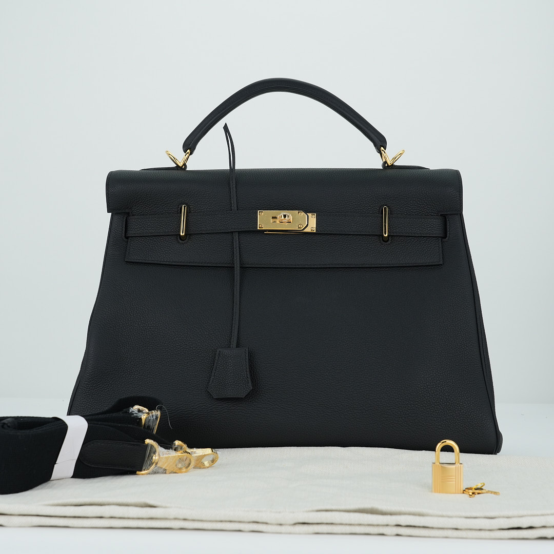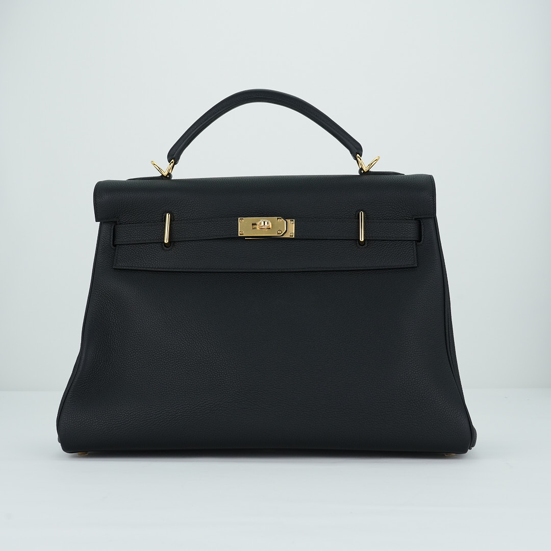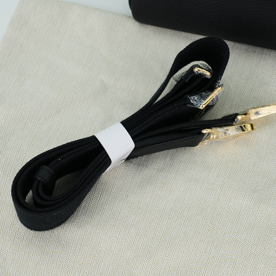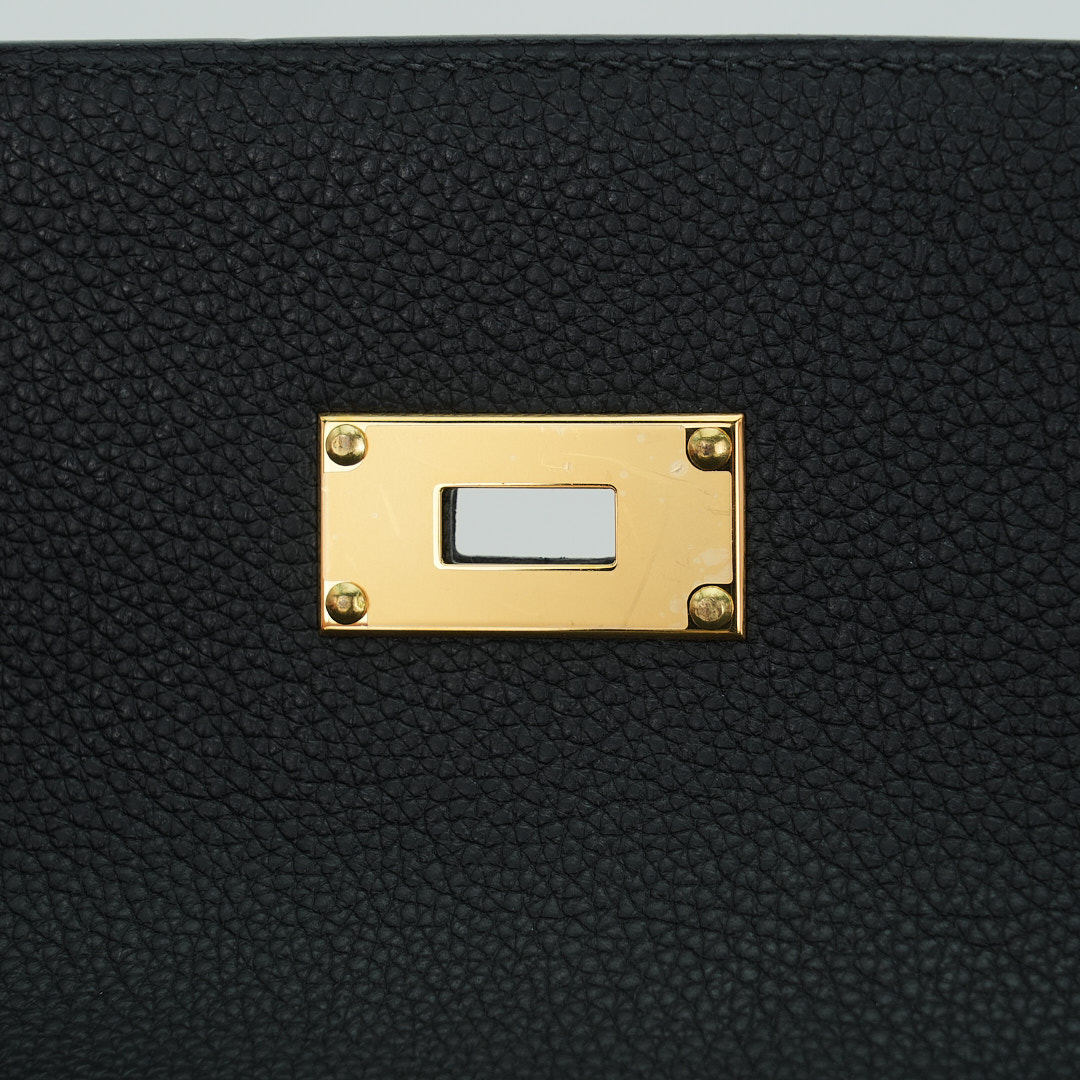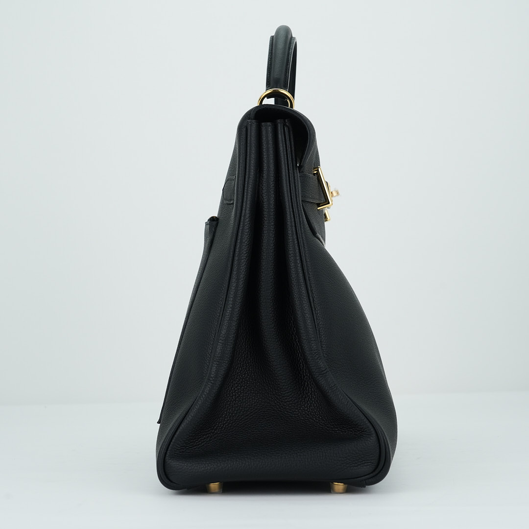 This KY 42 Maxi, in the Retourne style, is of Black Togo leather with palladium hardware and features same tonal stitching, front flap, front toggle closure, clochette with lock and two keys, a single rolled handle and a detachable canvas shoulder strap.
