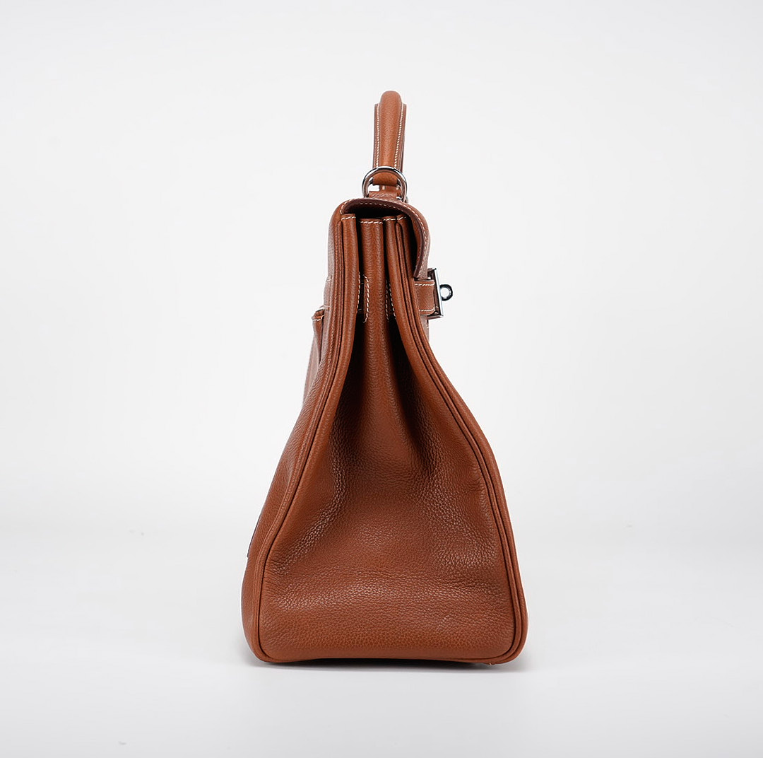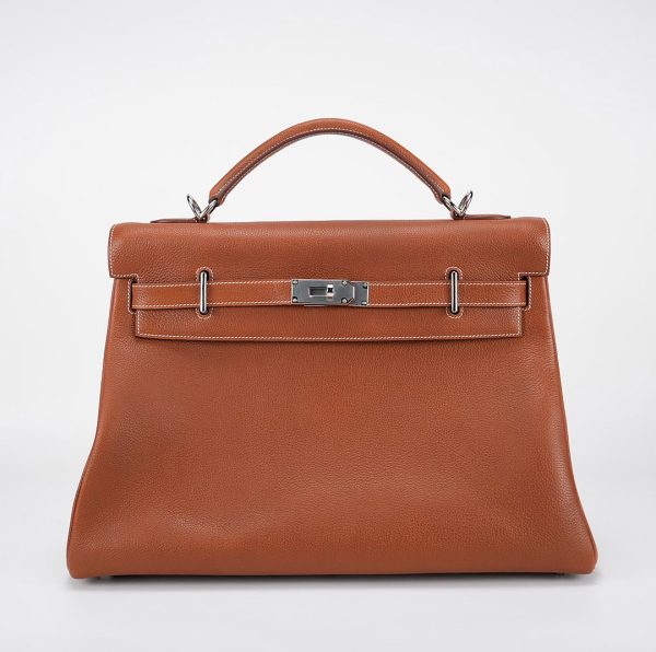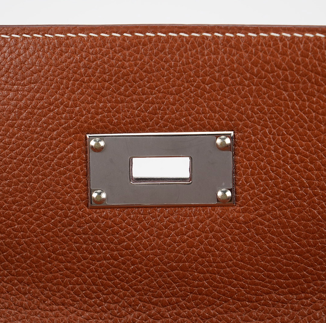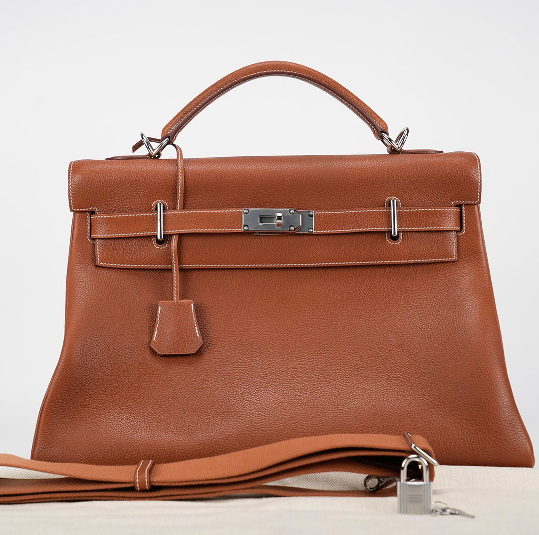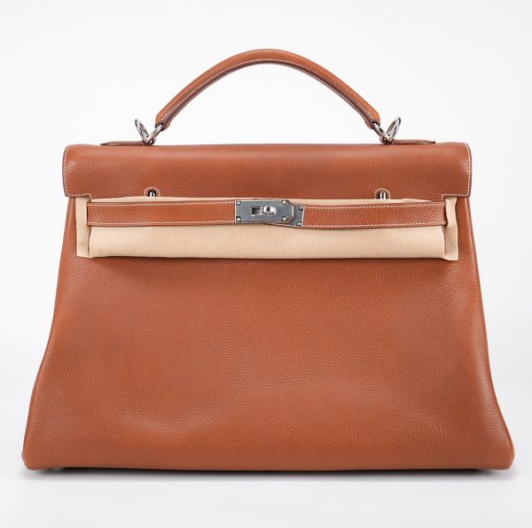 This KY 42 Maxi, in the Retourne style, is of Fauve Barenia Faubourg leather with Palladium hardware and features contrast stitching, front flap with two straps, front toggle closure, clochette with lock and two keys, a single rolled handle and a detachable canvas Fauve shoulder strap.