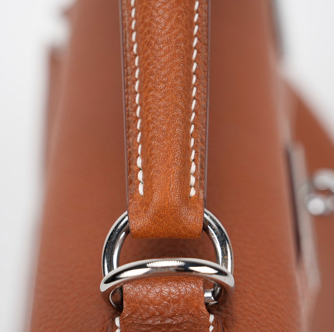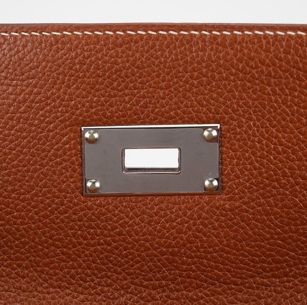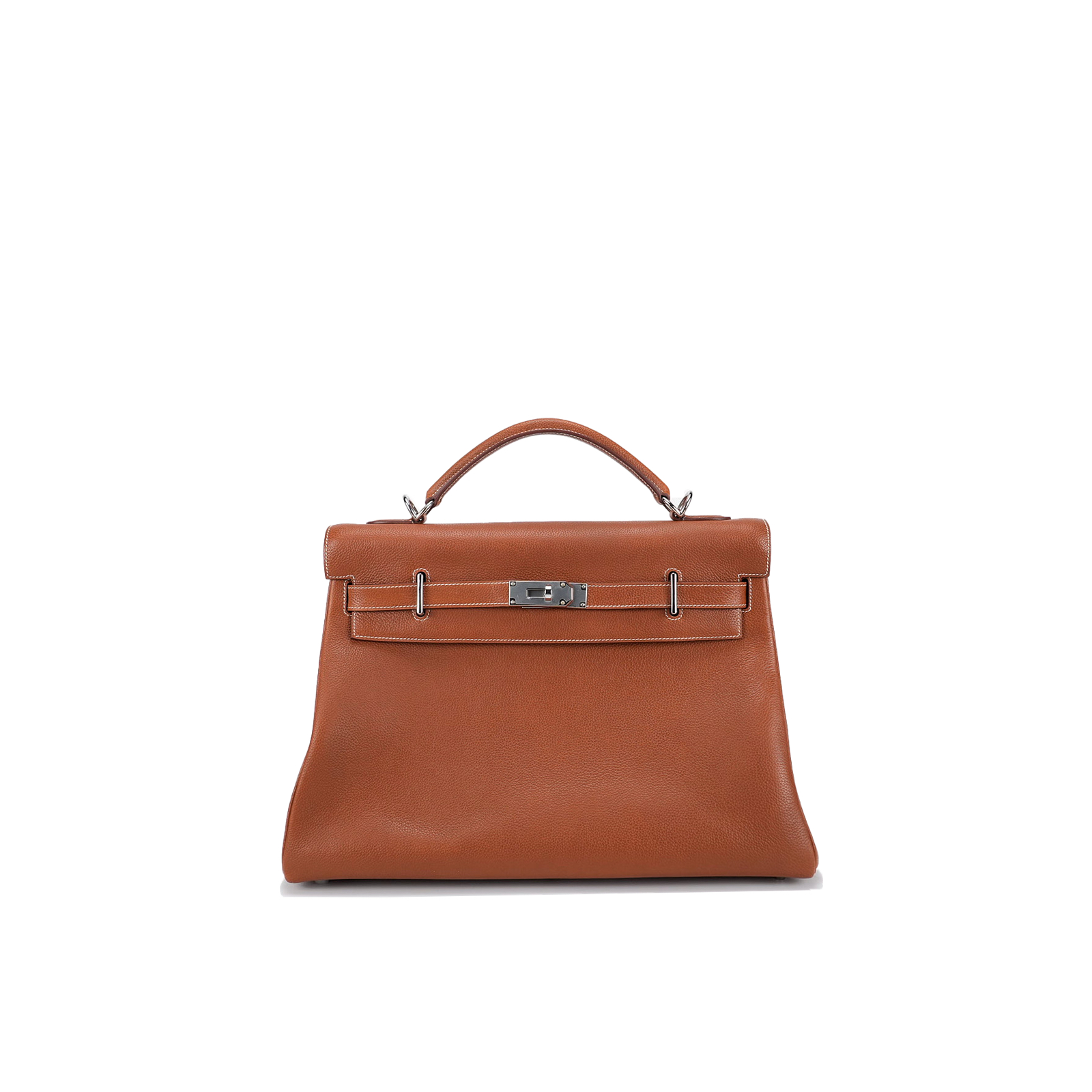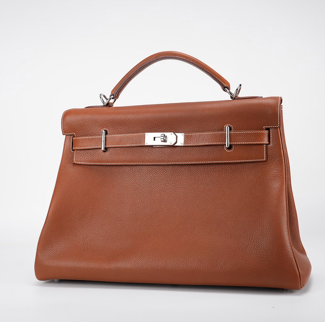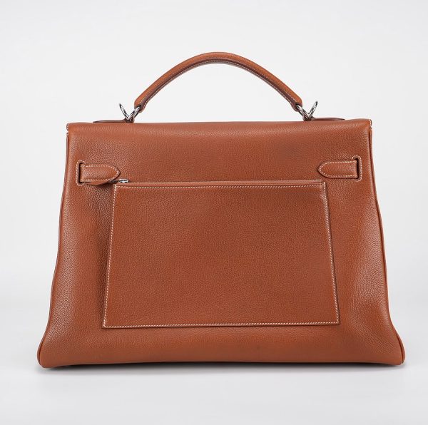 This KY 42 Maxi, in the Retourne style, is of Fauve Barenia Faubourg leather with Palladium hardware and features contrast stitching, front flap with two straps, front toggle closure, clochette with lock and two keys, a single rolled handle and a detachable canvas Fauve shoulder strap.