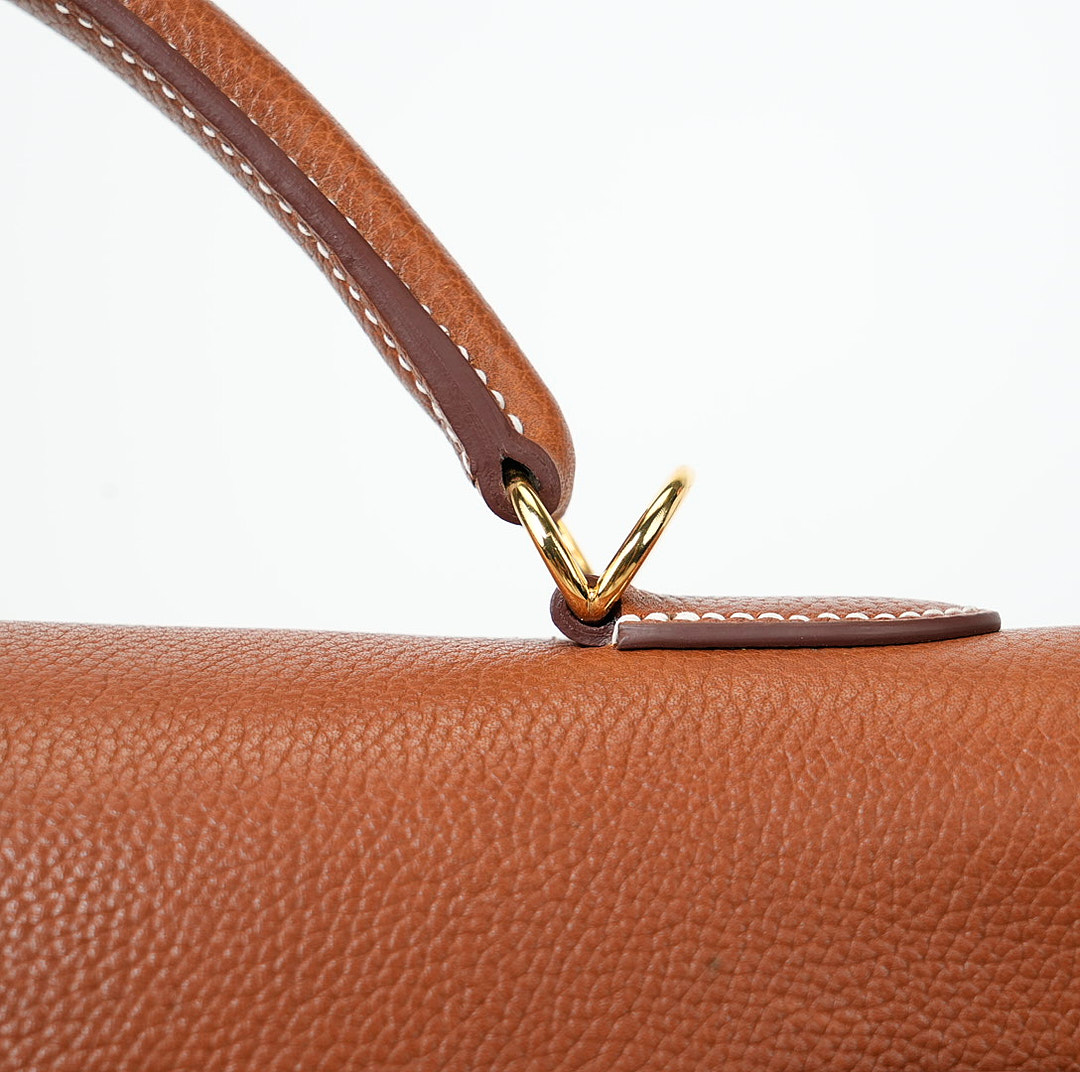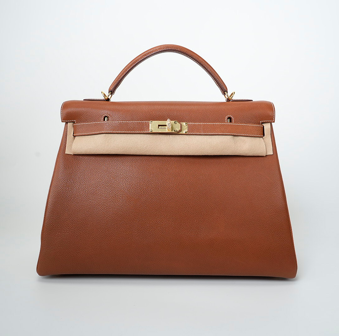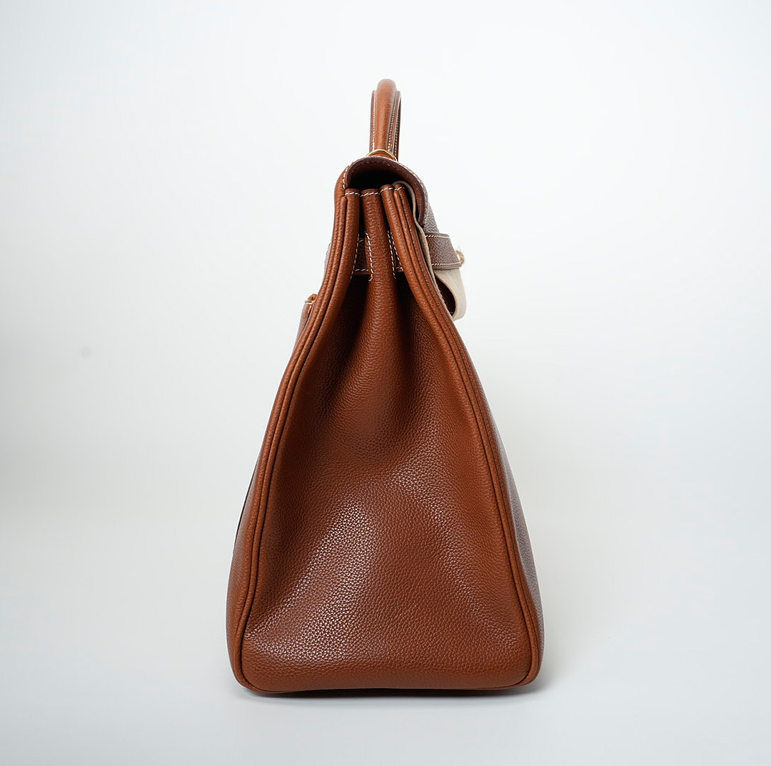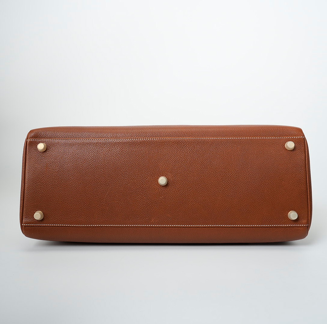 This KY 42 Maxi, in the Retourne style, is of Fauve Barenia Faubourg leather with gold hardware and features contrast stitching, front flap with two straps, front toggle closure, clochette with lock and two keys, a single rolled handle and a detachable canvas Fauve shoulder strap.