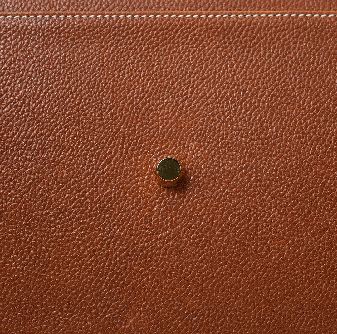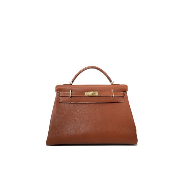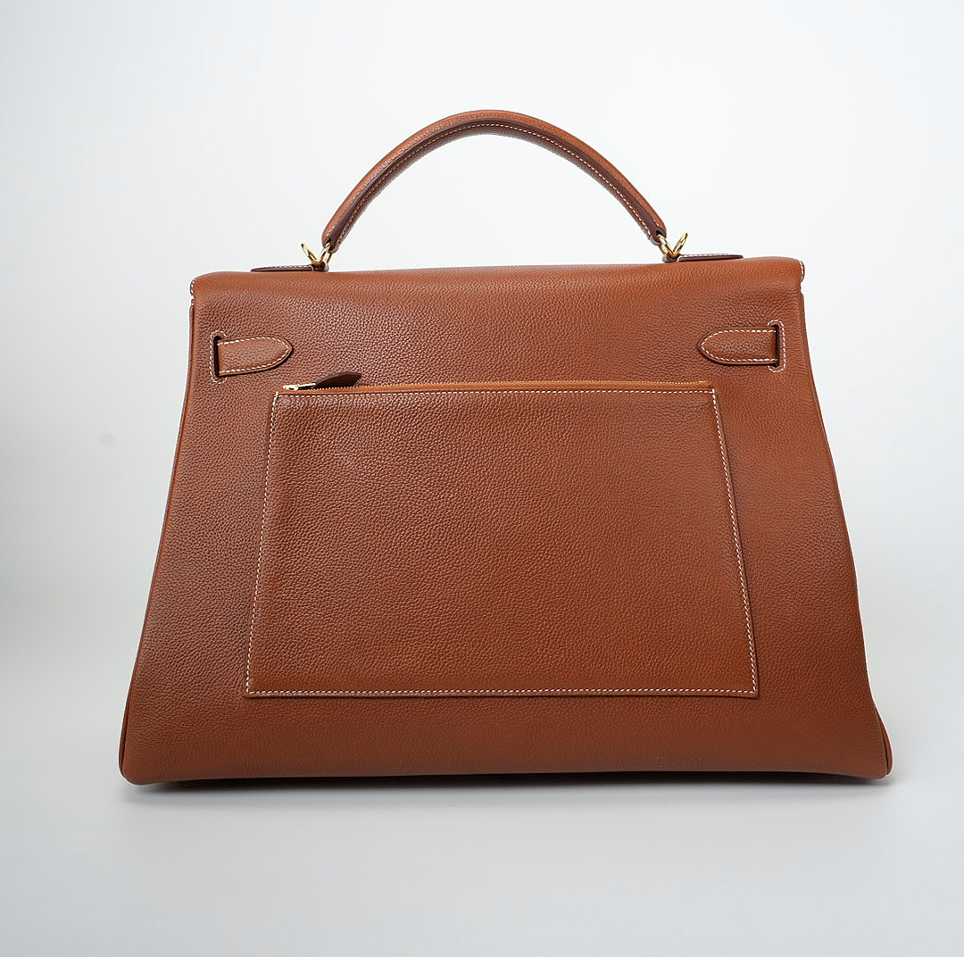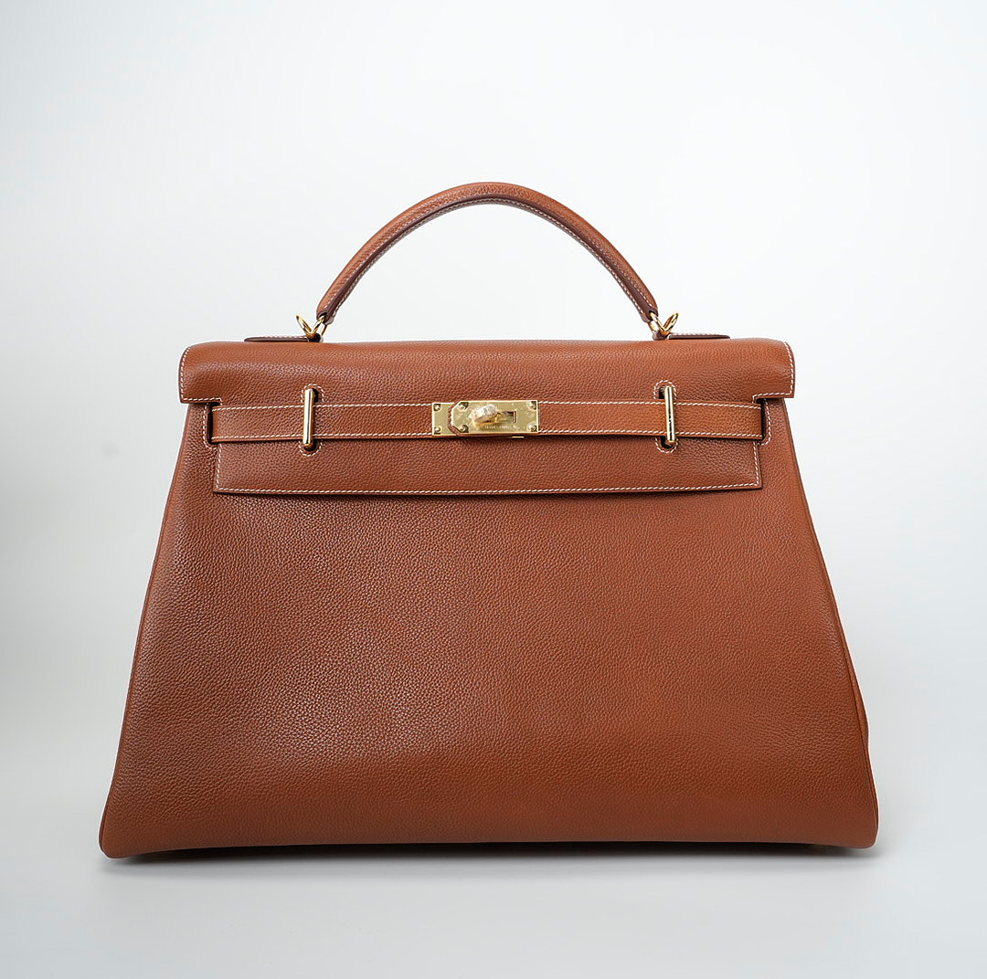 This KY 42 Maxi, in the Retourne style, is of Fauve Barenia Faubourg leather with gold hardware and features contrast stitching, front flap with two straps, front toggle closure, clochette with lock and two keys, a single rolled handle and a detachable canvas Fauve shoulder strap.