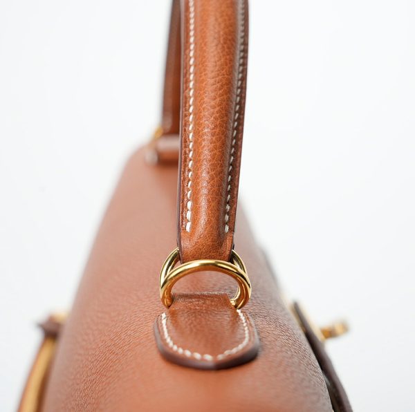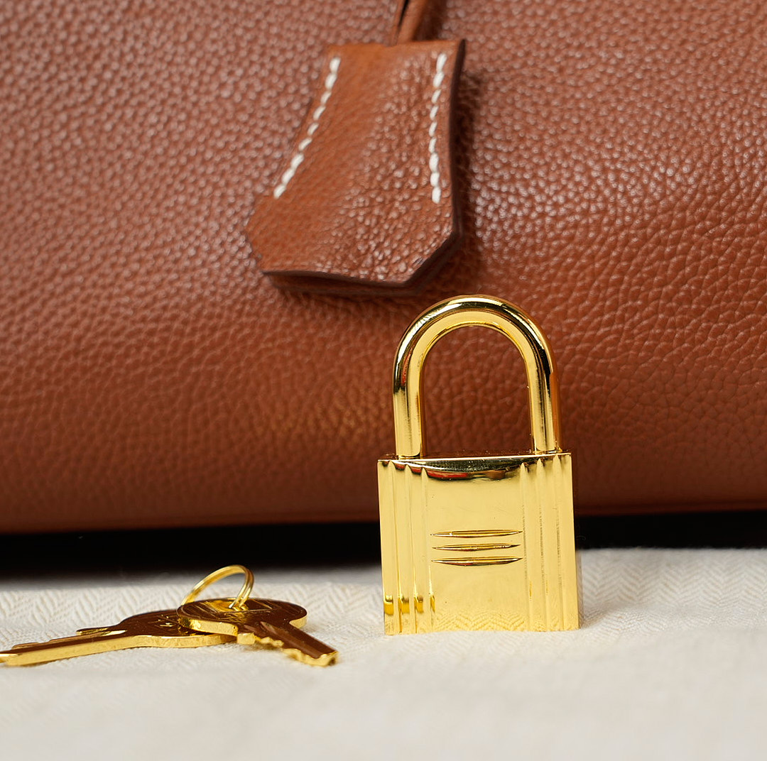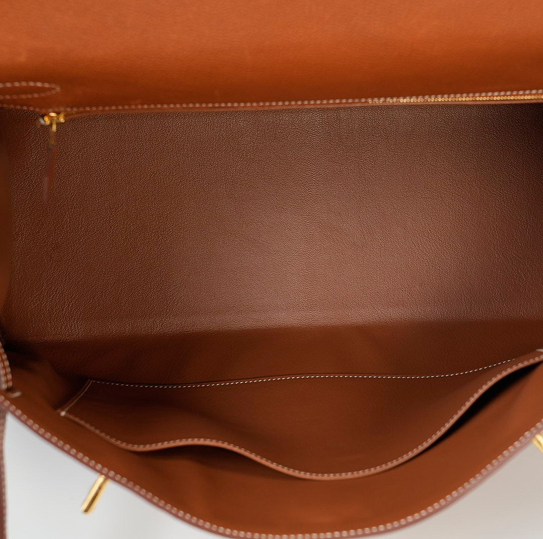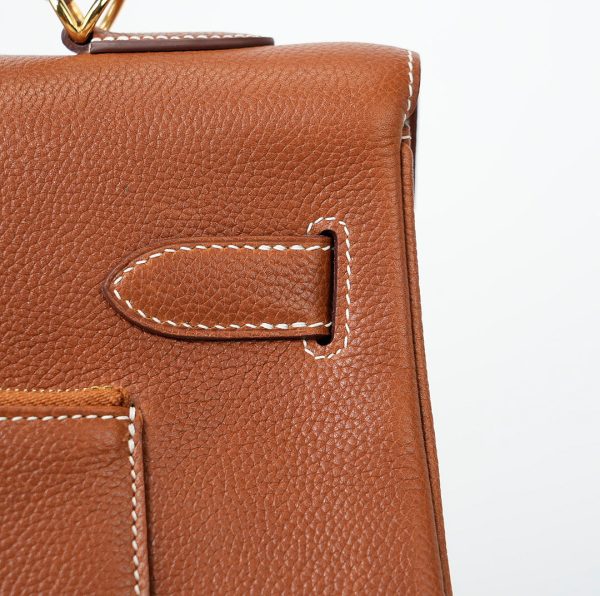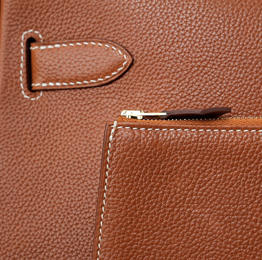 This KY 42 Maxi, in the Retourne style, is of Fauve Barenia Faubourg leather with gold hardware and features contrast stitching, front flap with two straps, front toggle closure, clochette with lock and two keys, a single rolled handle and a detachable canvas Fauve shoulder strap.