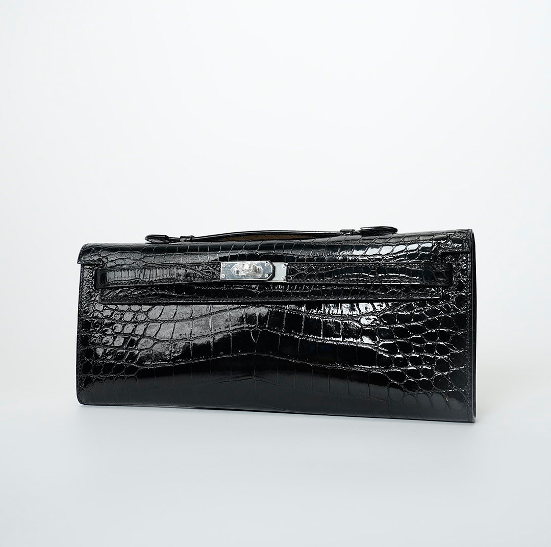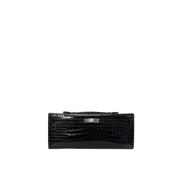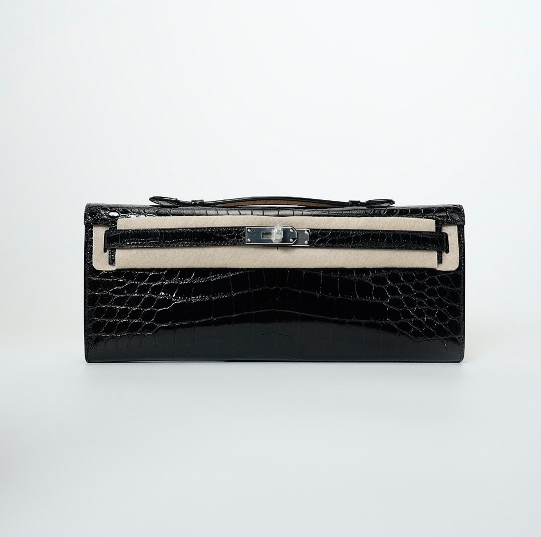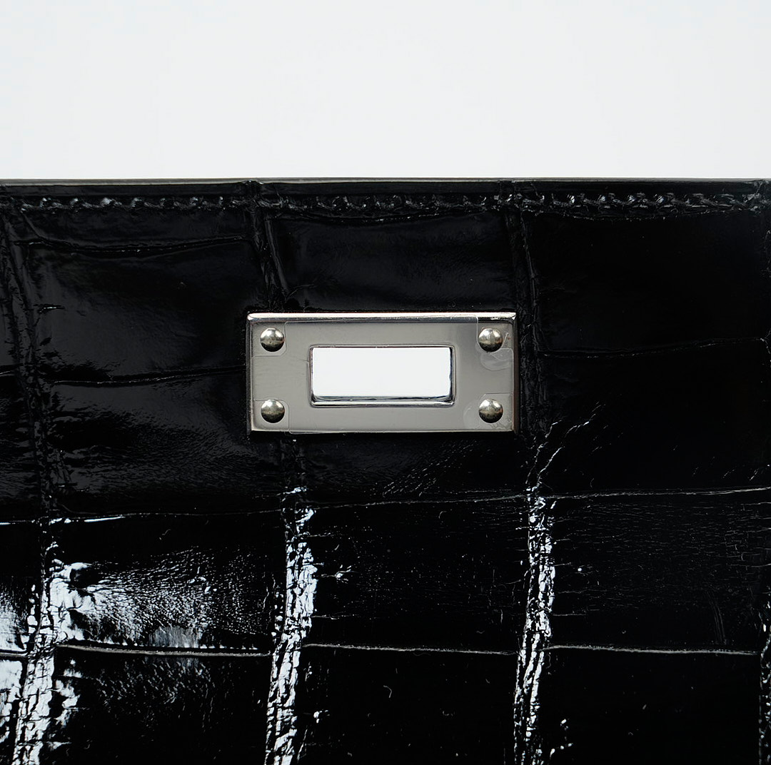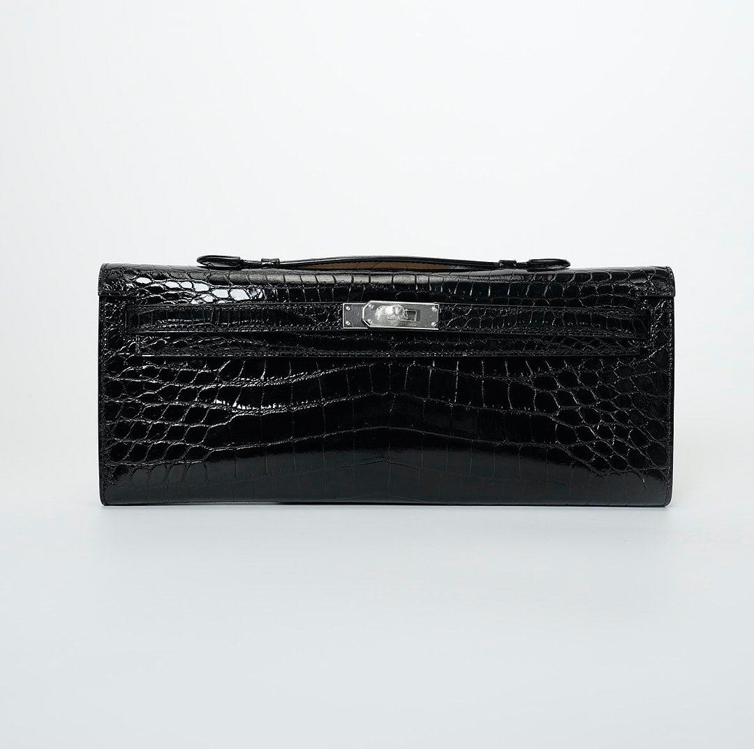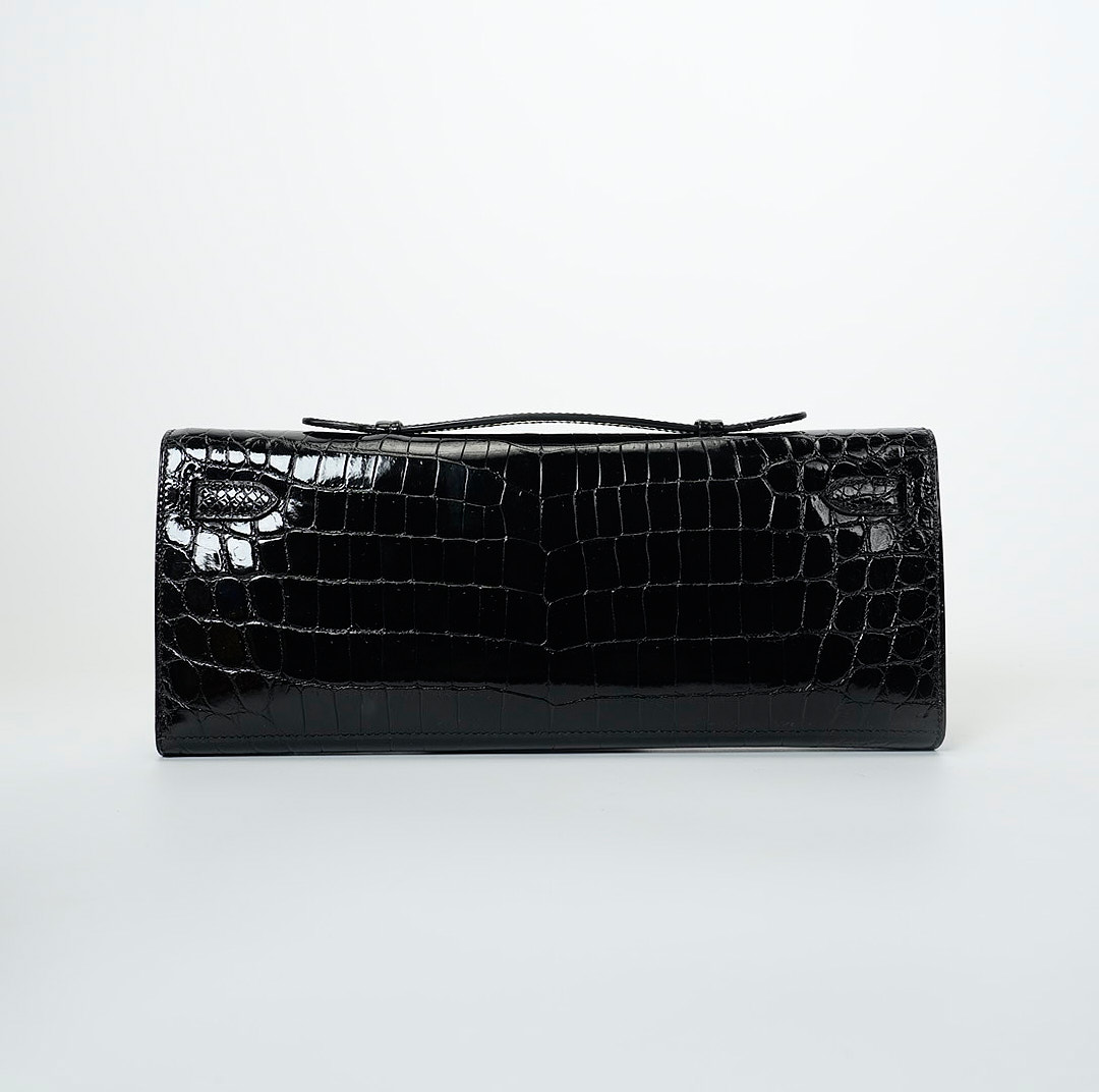 This KY Cut is in black shiny porosus crocodile with palladium hardware and has tonal stitching, two straps with front toggle closure and a top flat handle. The interior is lined with Black chevre and has an open wall pocket.