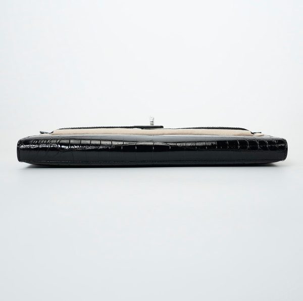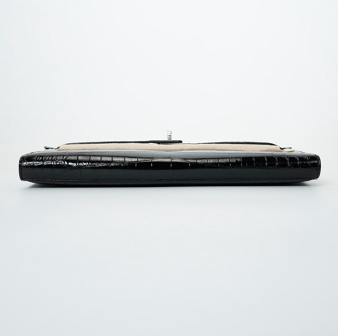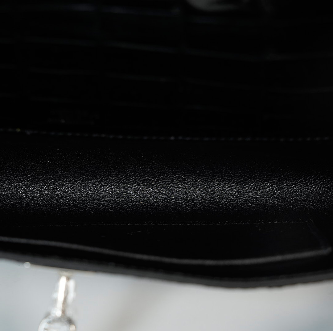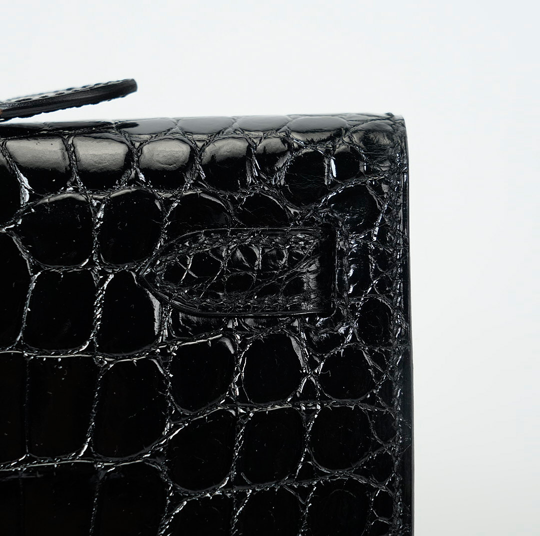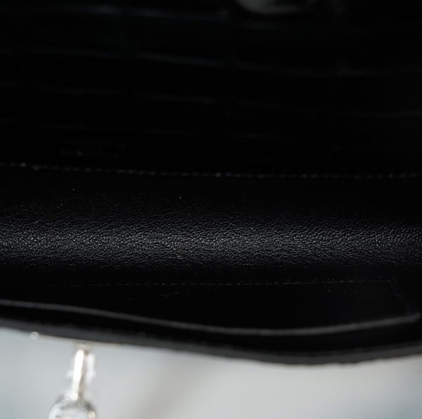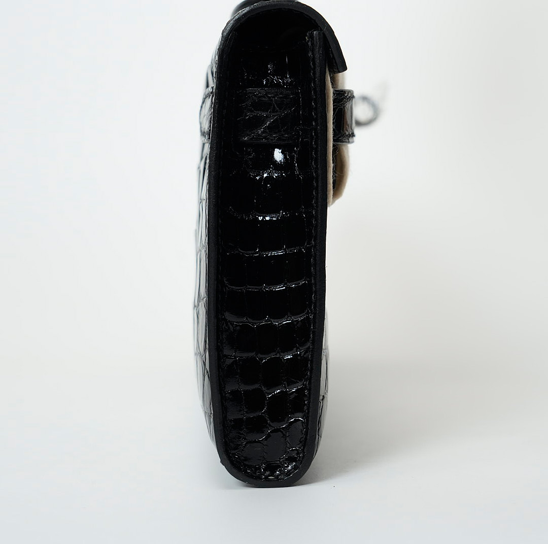 This KY Cut is in black shiny porosus crocodile with palladium hardware and has tonal stitching, two straps with front toggle closure and a top flat handle. The interior is lined with Black chevre and has an open wall pocket.