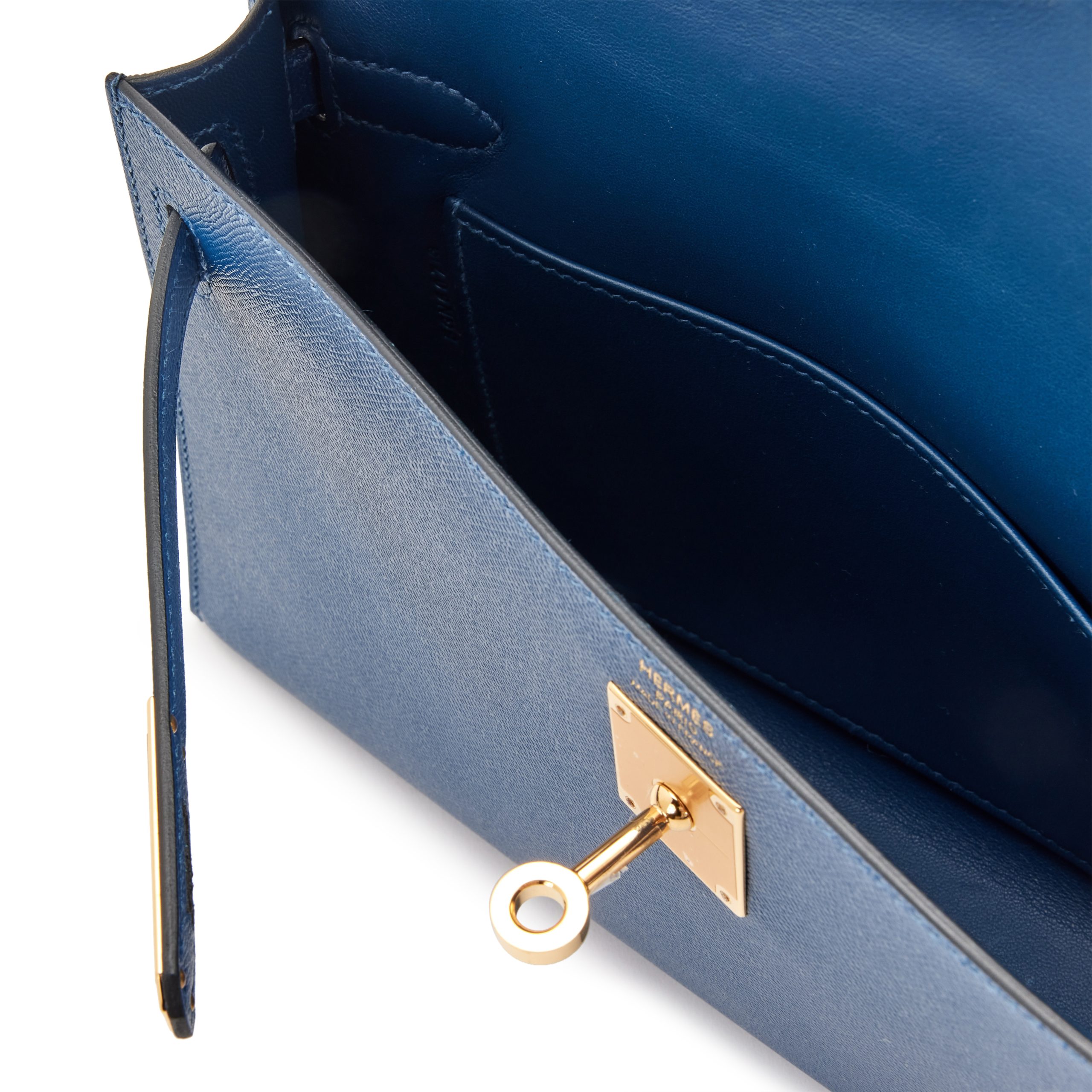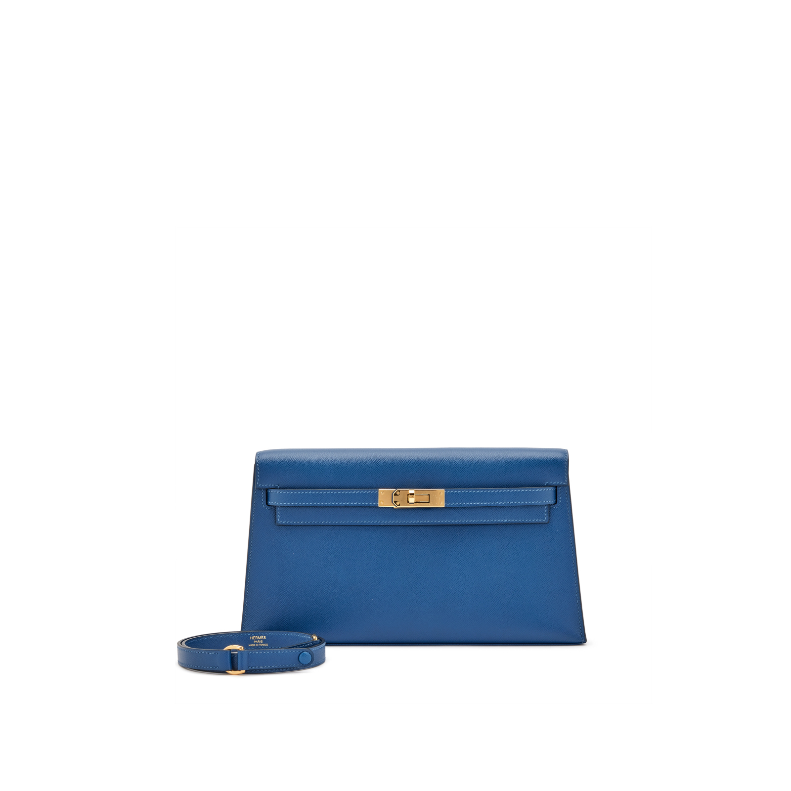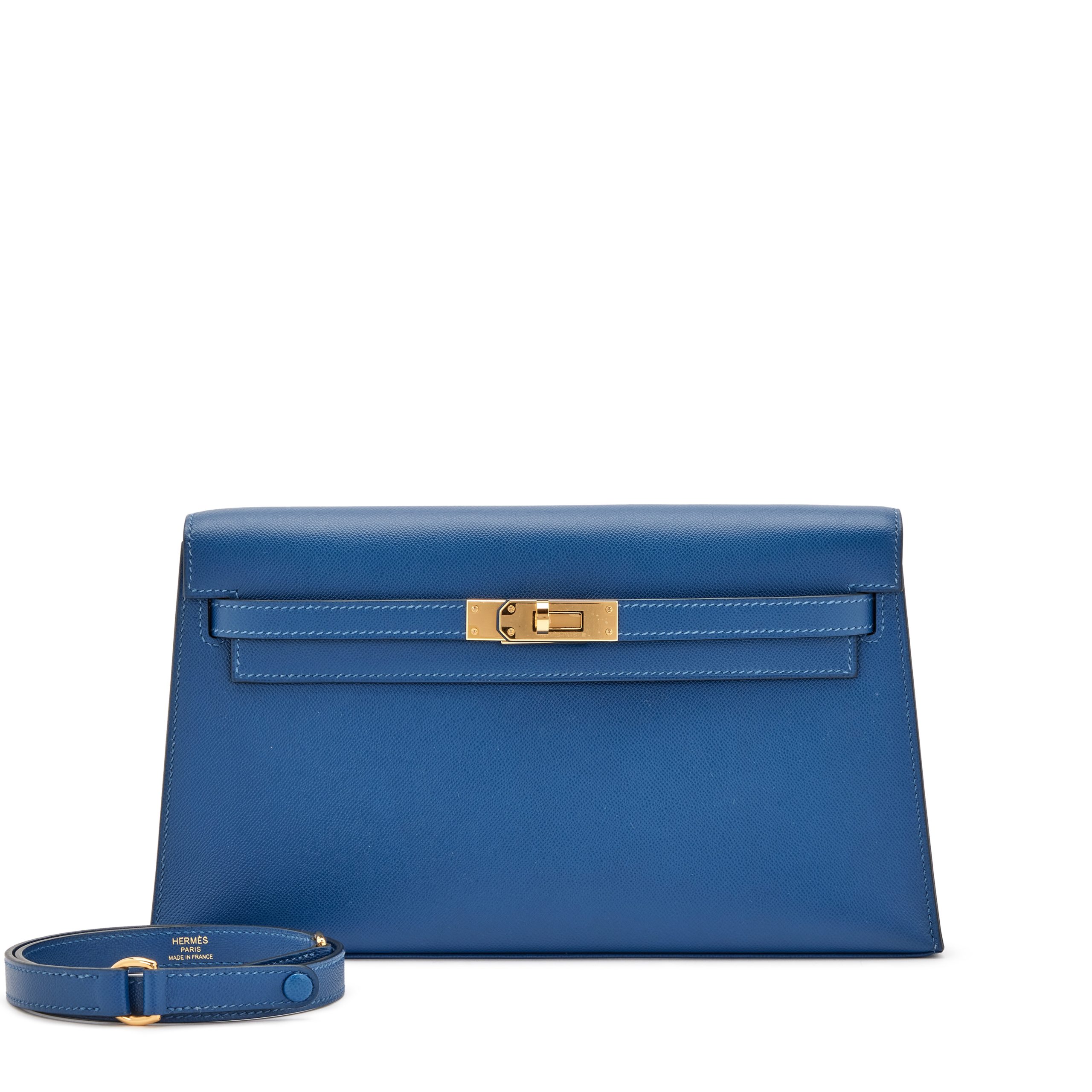 Bleu De Prusse Epsom Kelly Elan Gold Hardware,The interior is lined in a tonal swift leatherIncludes shoulder strap.