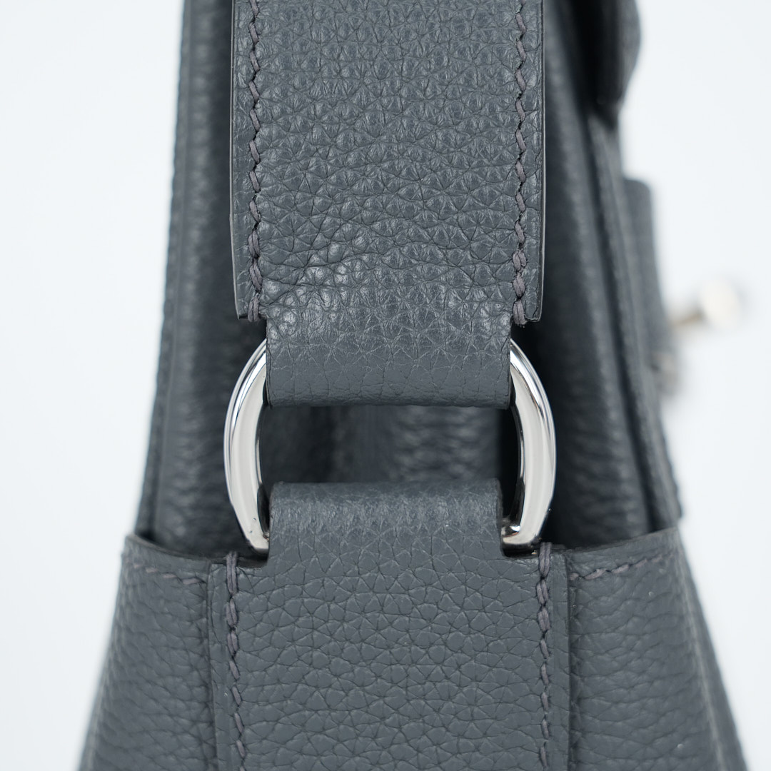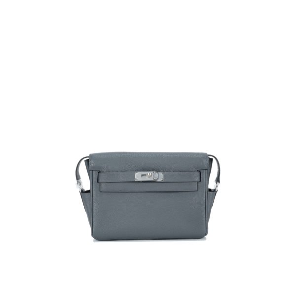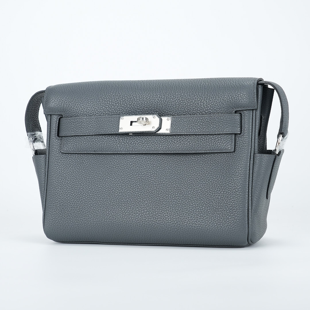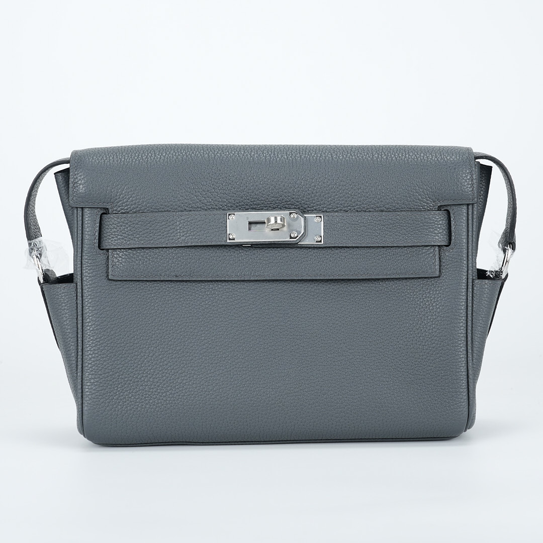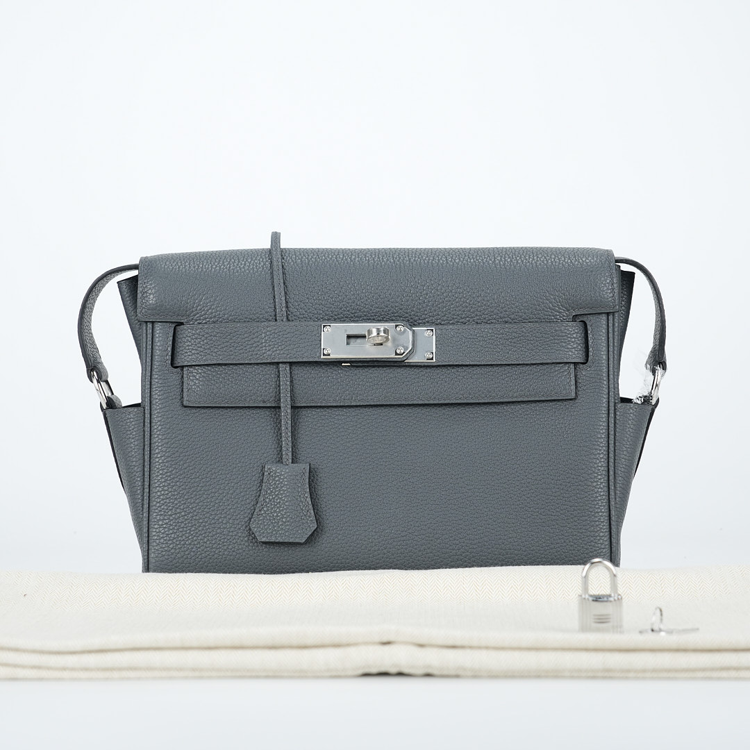 This is a Togo Kelly Messenger PM in Gris Misty. This stylish messenger bag is crafted of natural Togo leather in Gray. It features a crossbody strap with palladium hardware and a broad front flap that closes with a matching turn lock. The flap opens to a leather interior with zipper and patch pockets.