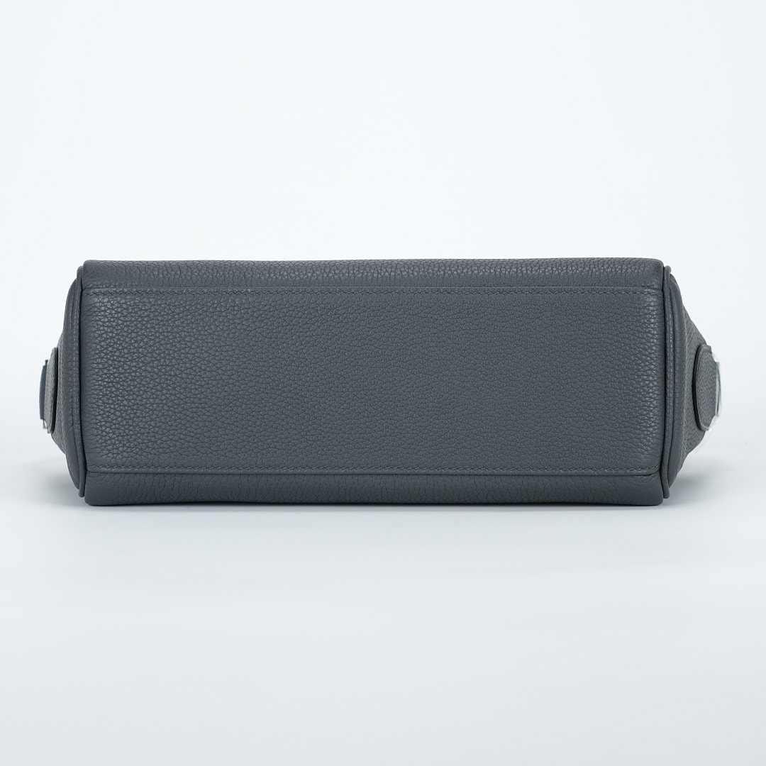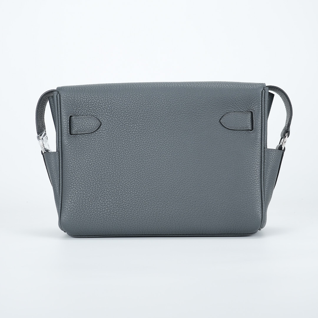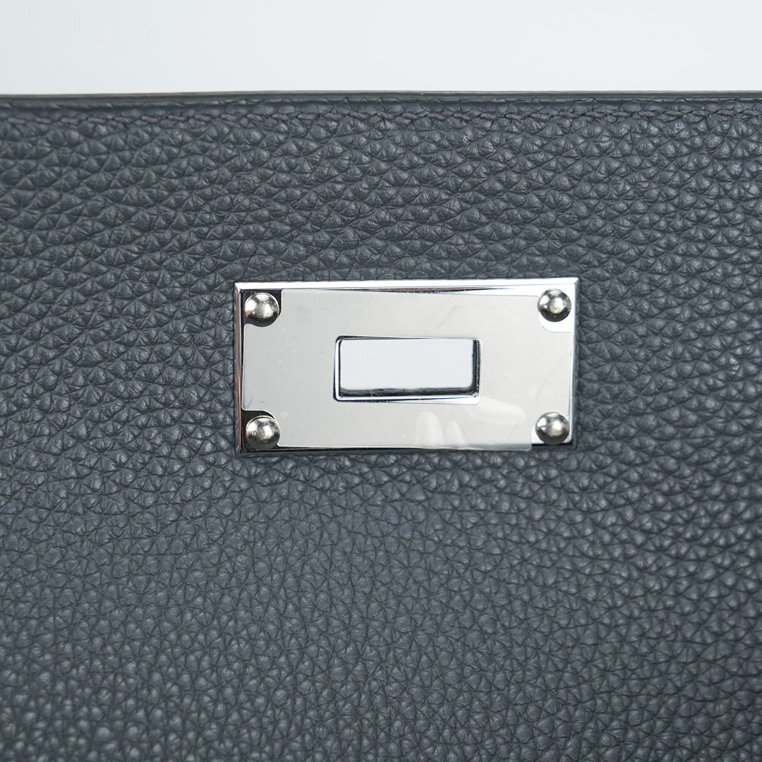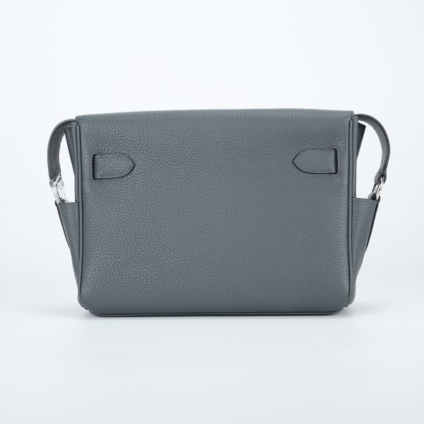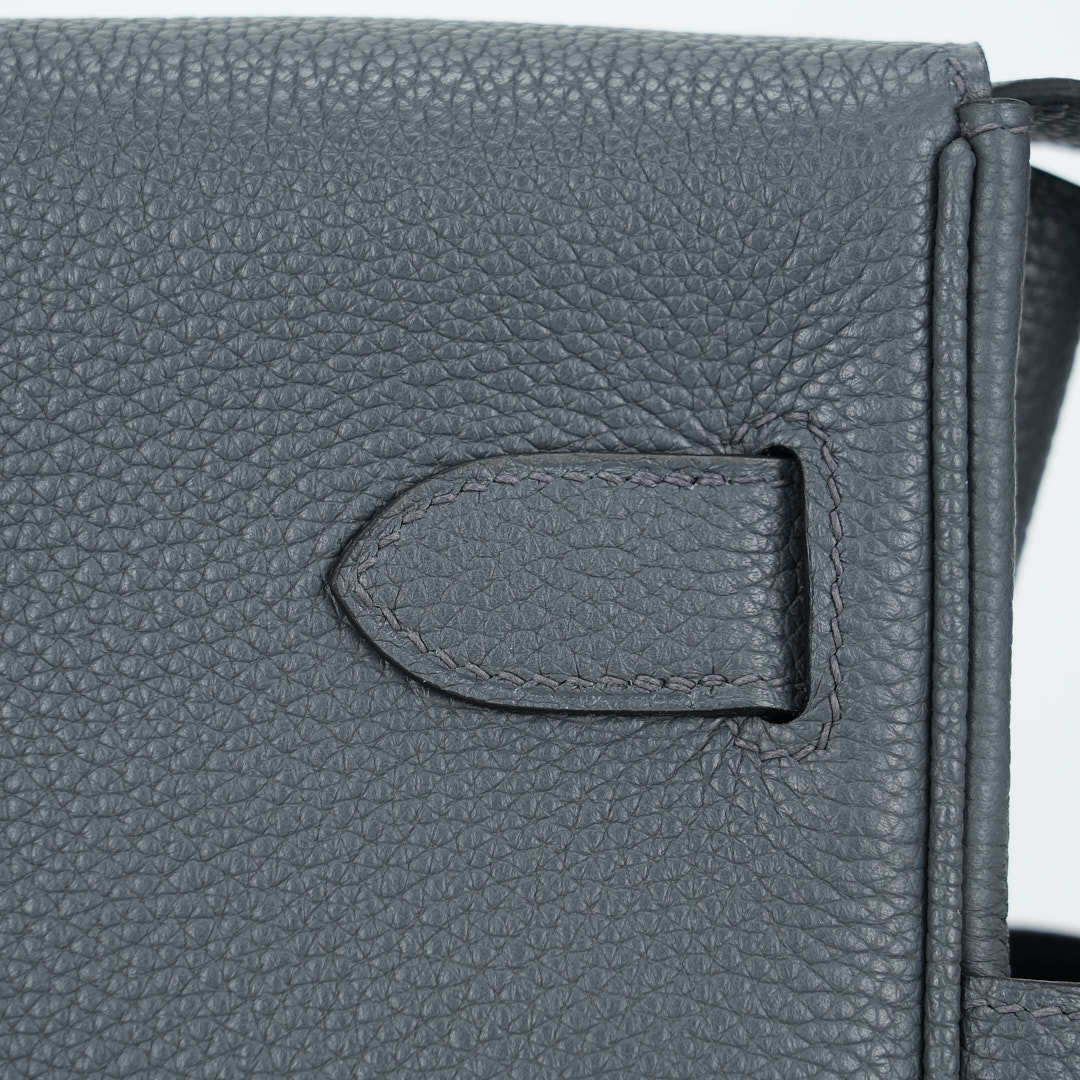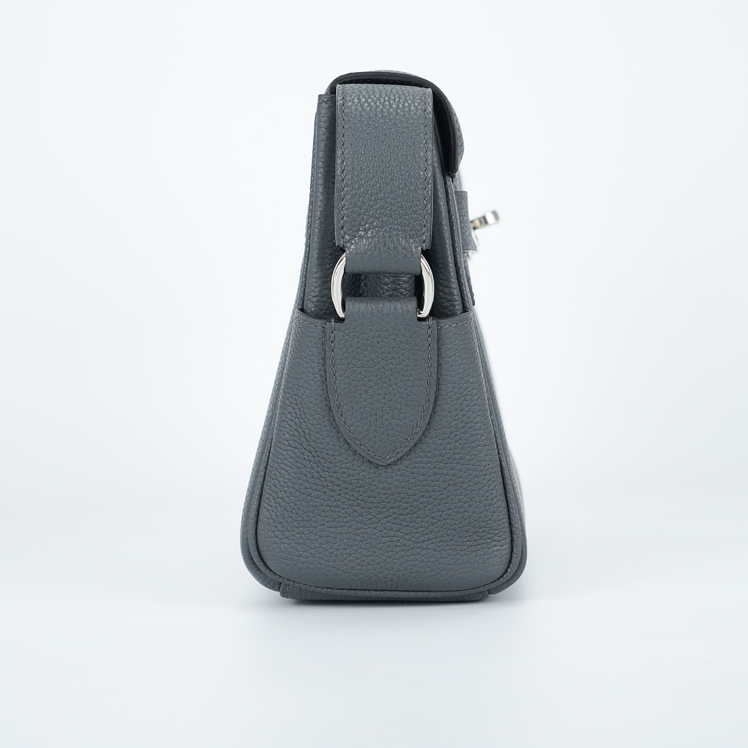 This is a Togo Kelly Messenger PM in Gris Misty. This stylish messenger bag is crafted of natural Togo leather in Gray. It features a crossbody strap with palladium hardware and a broad front flap that closes with a matching turn lock. The flap opens to a leather interior with zipper and patch pockets.
