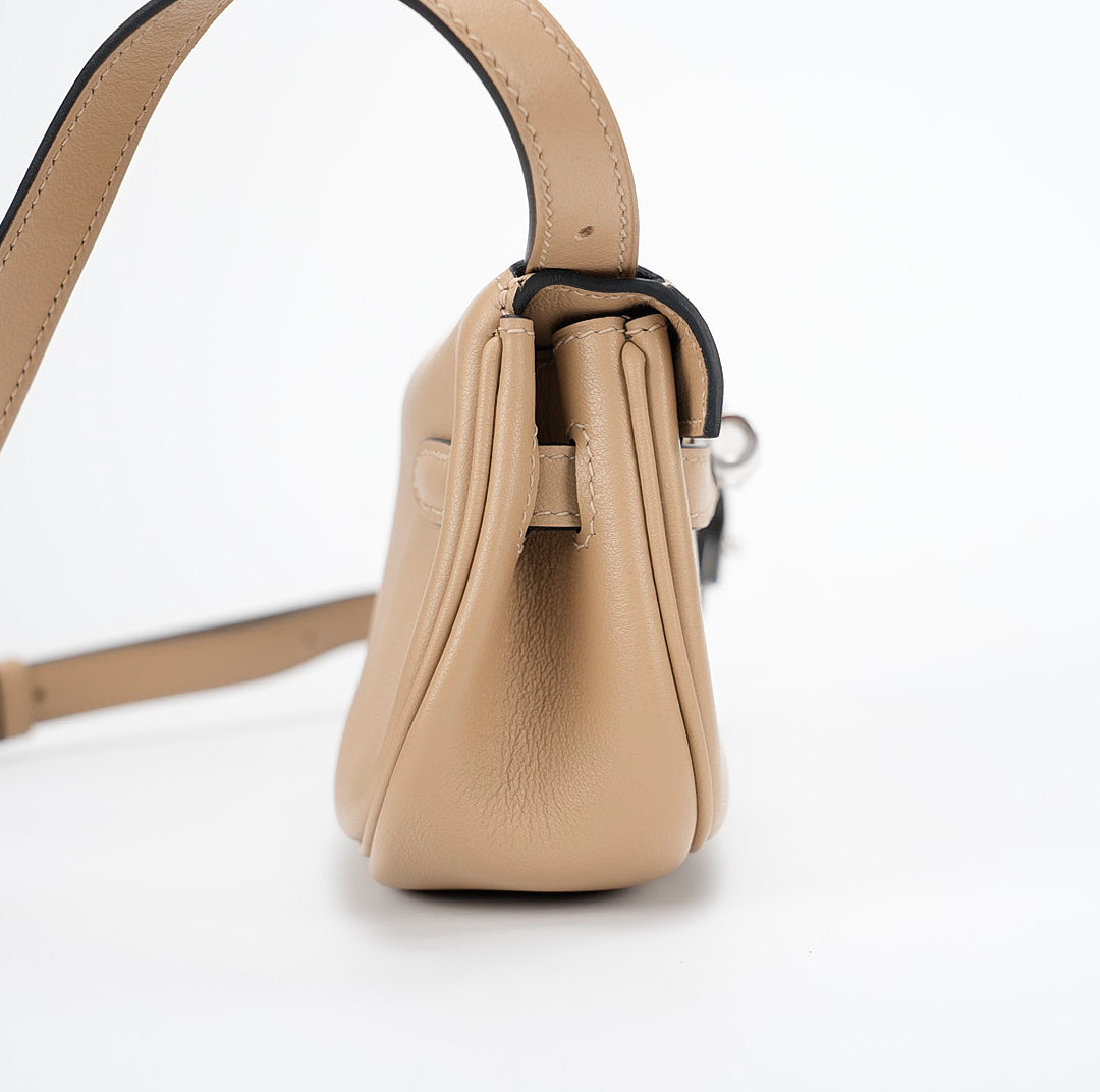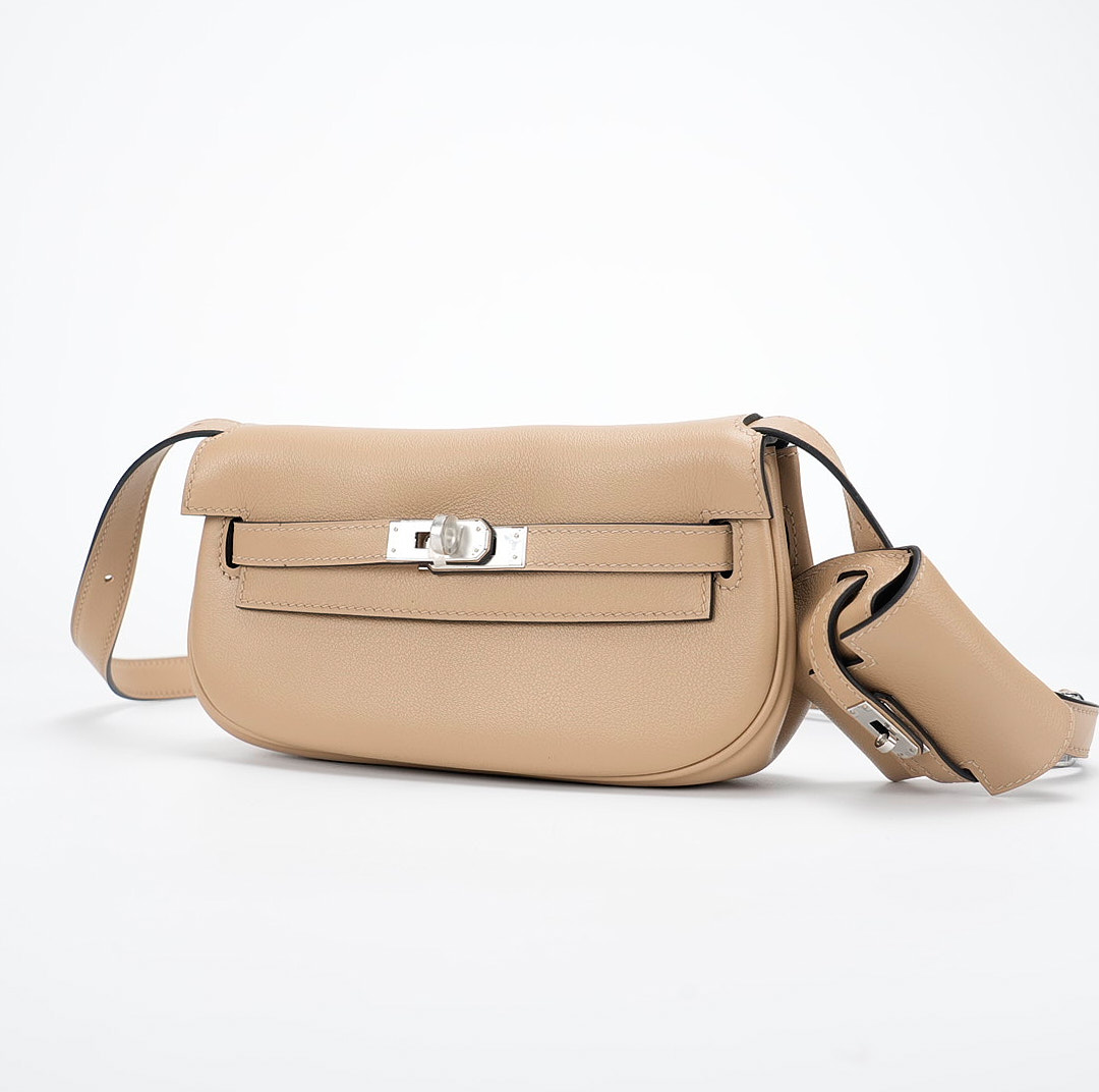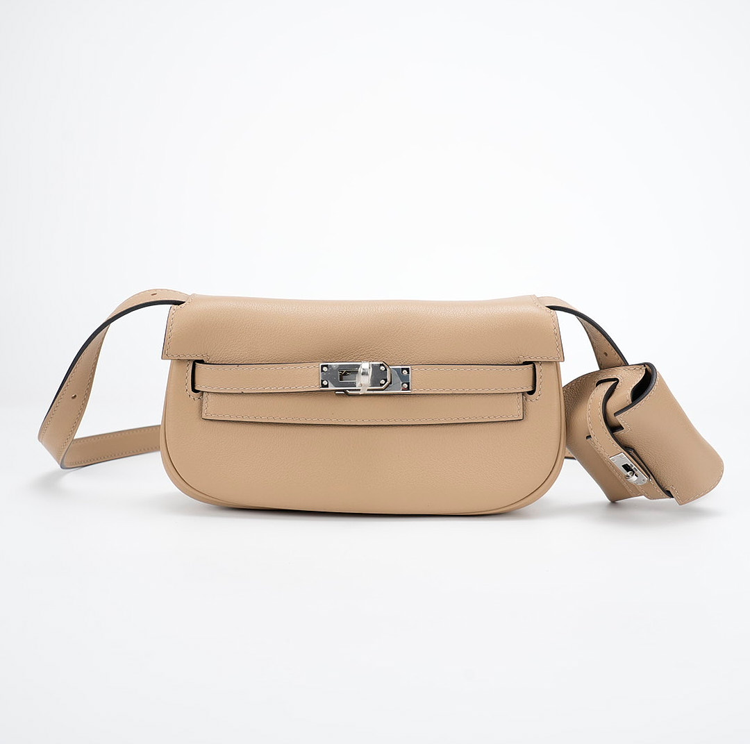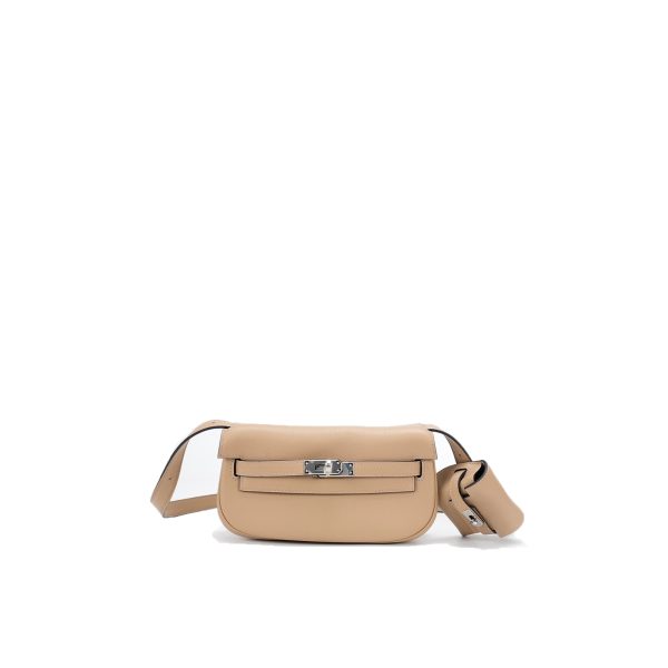 This KY Moove in Trench stylish shoulder bag is crafted of swift leather in light yellow. The bag features a lengthy crossbody strap with a coin purse attached and polished palladium hardware. The turn lock opens to a matching interior with a pocket.