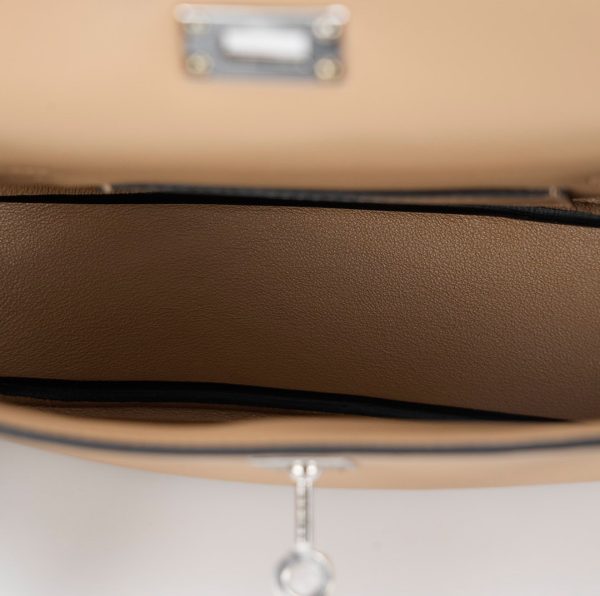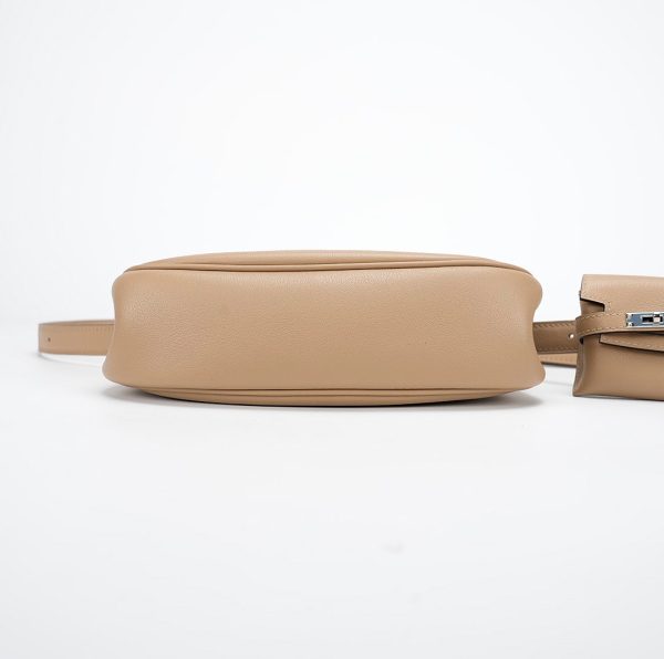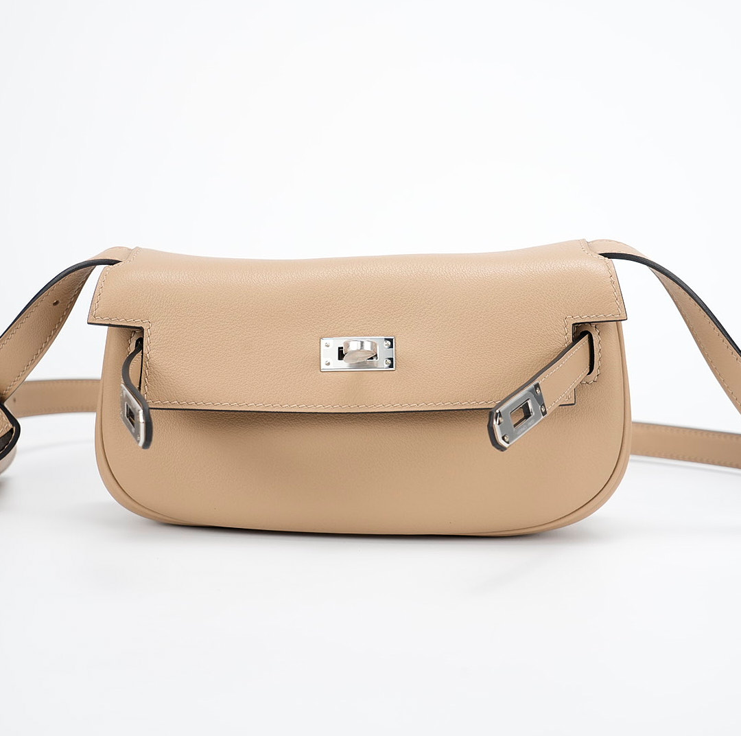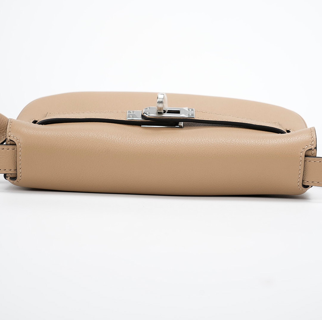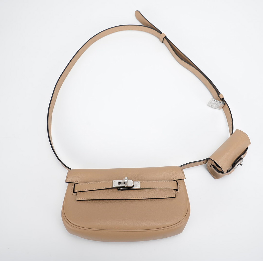 This KY Moove in Trench stylish shoulder bag is crafted of swift leather in light yellow. The bag features a lengthy crossbody strap with a coin purse attached and polished palladium hardware. The turn lock opens to a matching interior with a pocket.