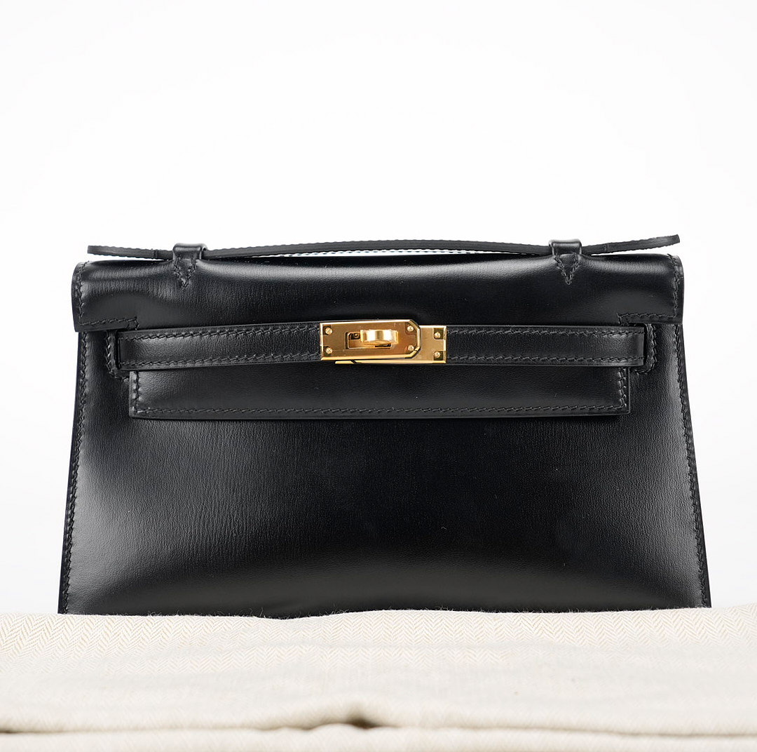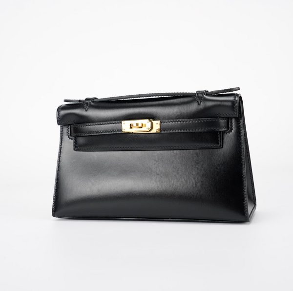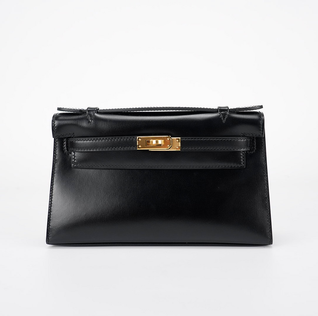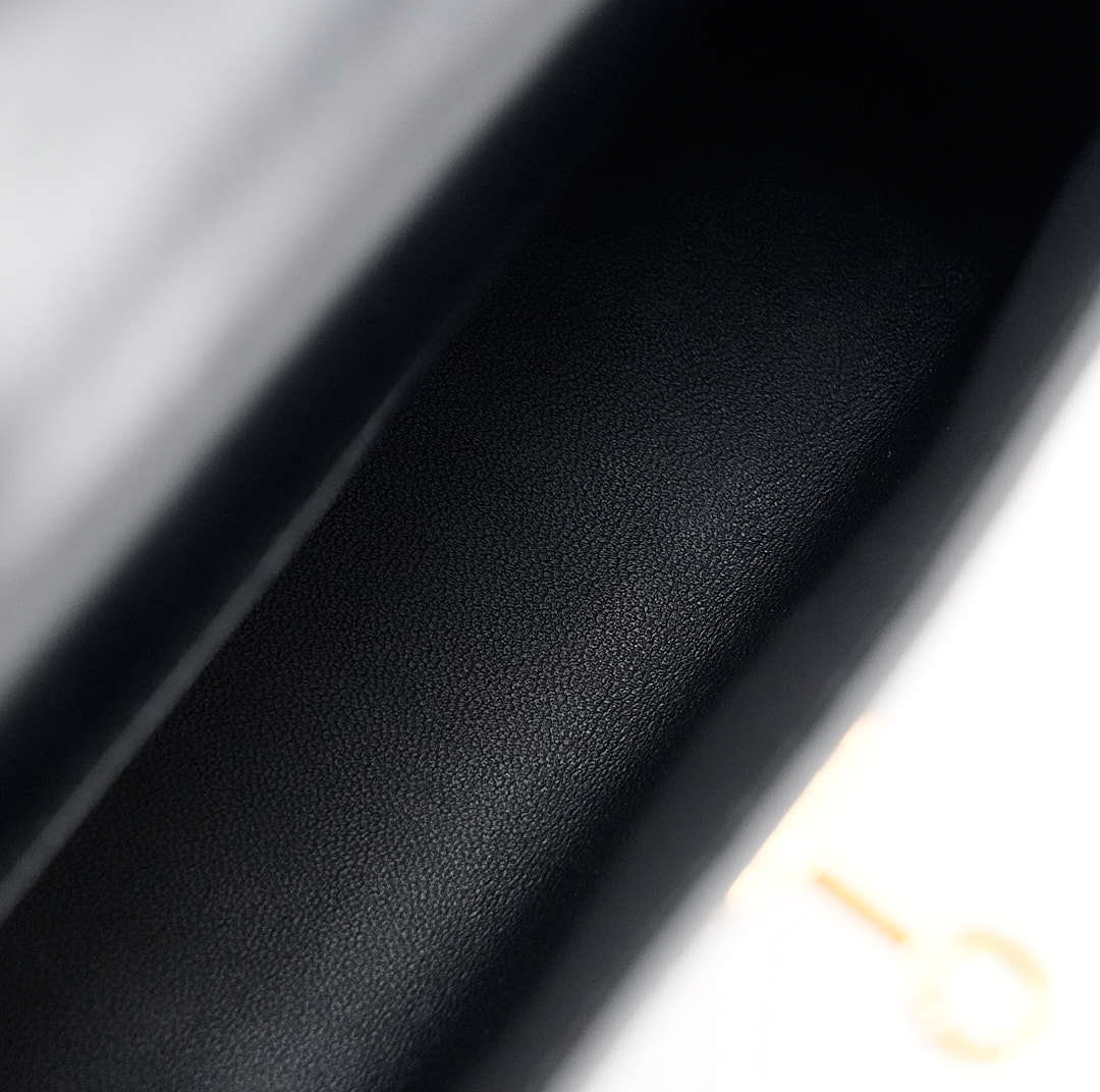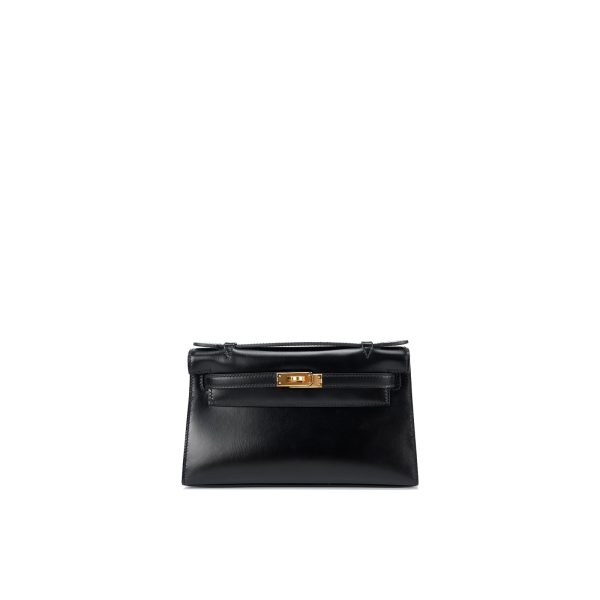 A stunning KY Pochette handcrafted from Box leather in Black, complemented by gold hardware. This elegant clutch is perfectly sized for your evening essentials. Carry it by hand or tucked under your arm for effortless sophistication.