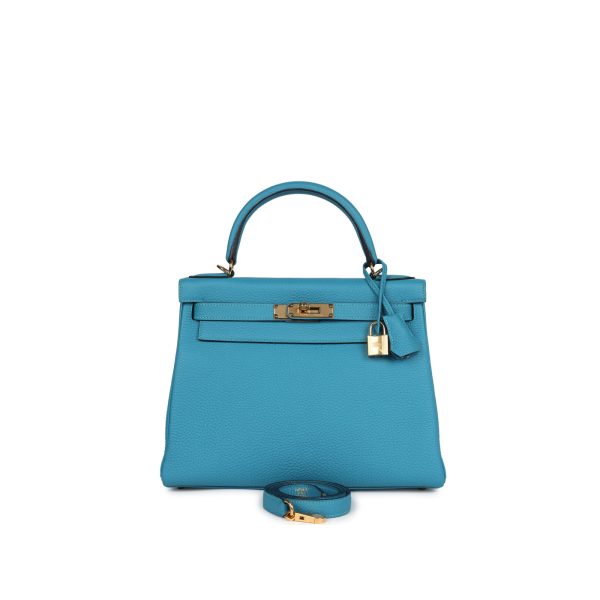 This KY, in the Retourne style, is in Bleu Turquoise togo leather with gold hardware and has tonal stitching, front flap, two straps with center toggle closure, clochette with lock and two keys, single rolled handle and removable shoulder strap.