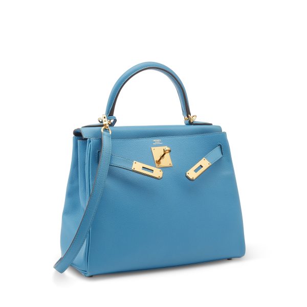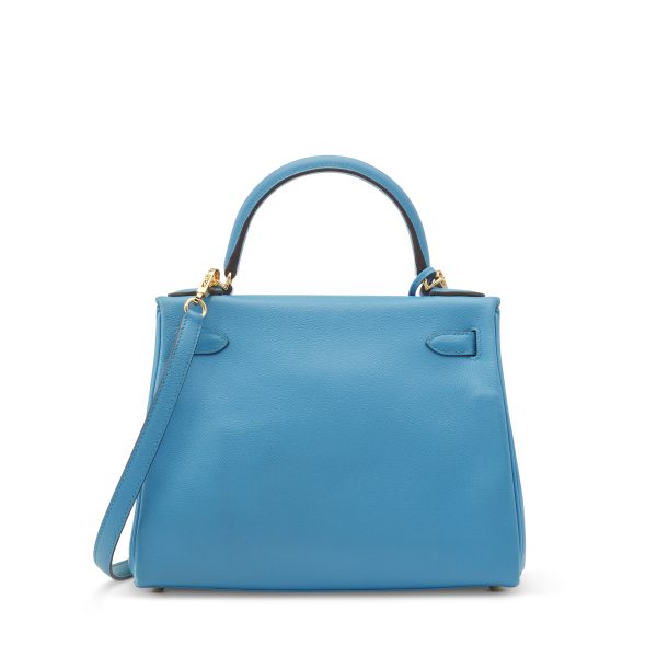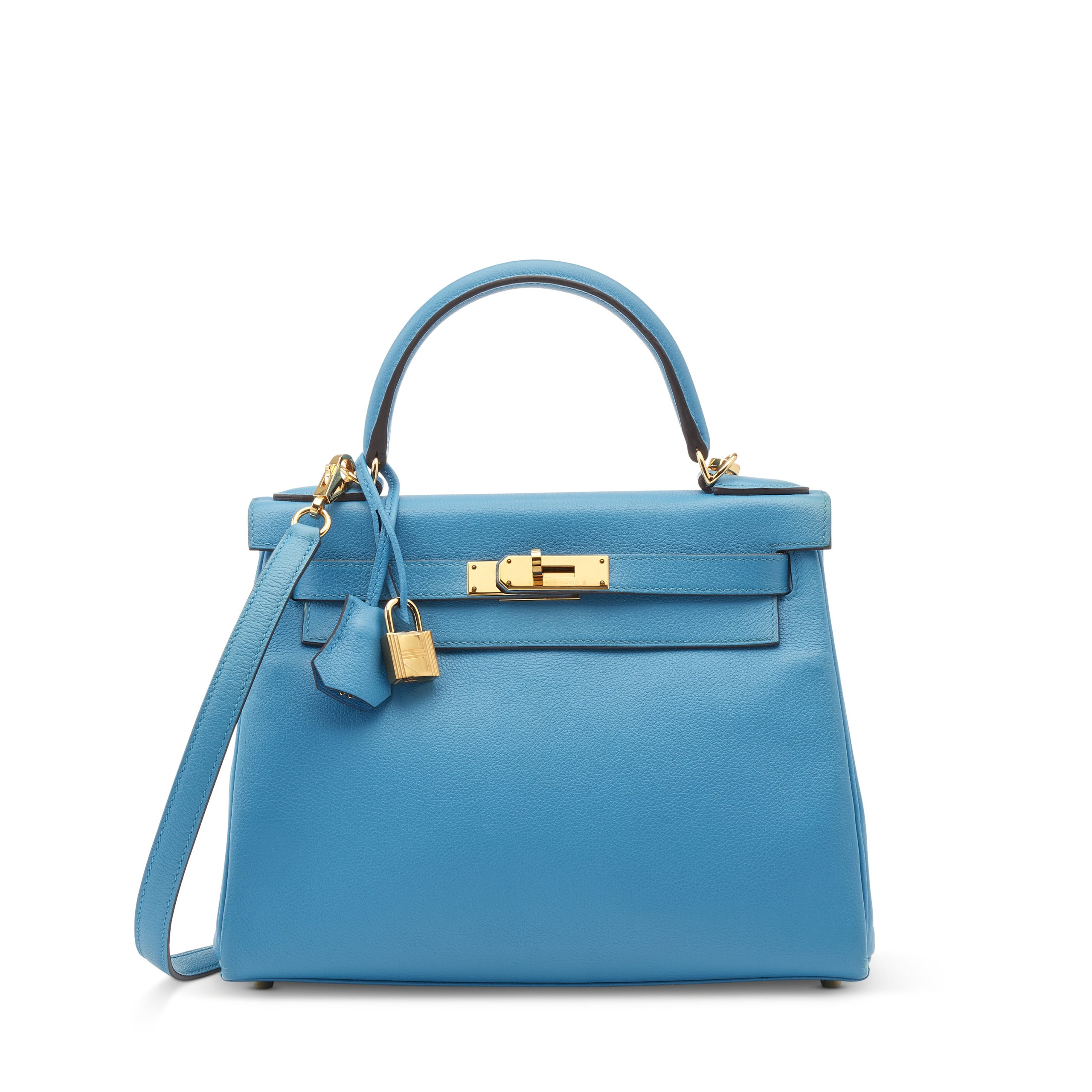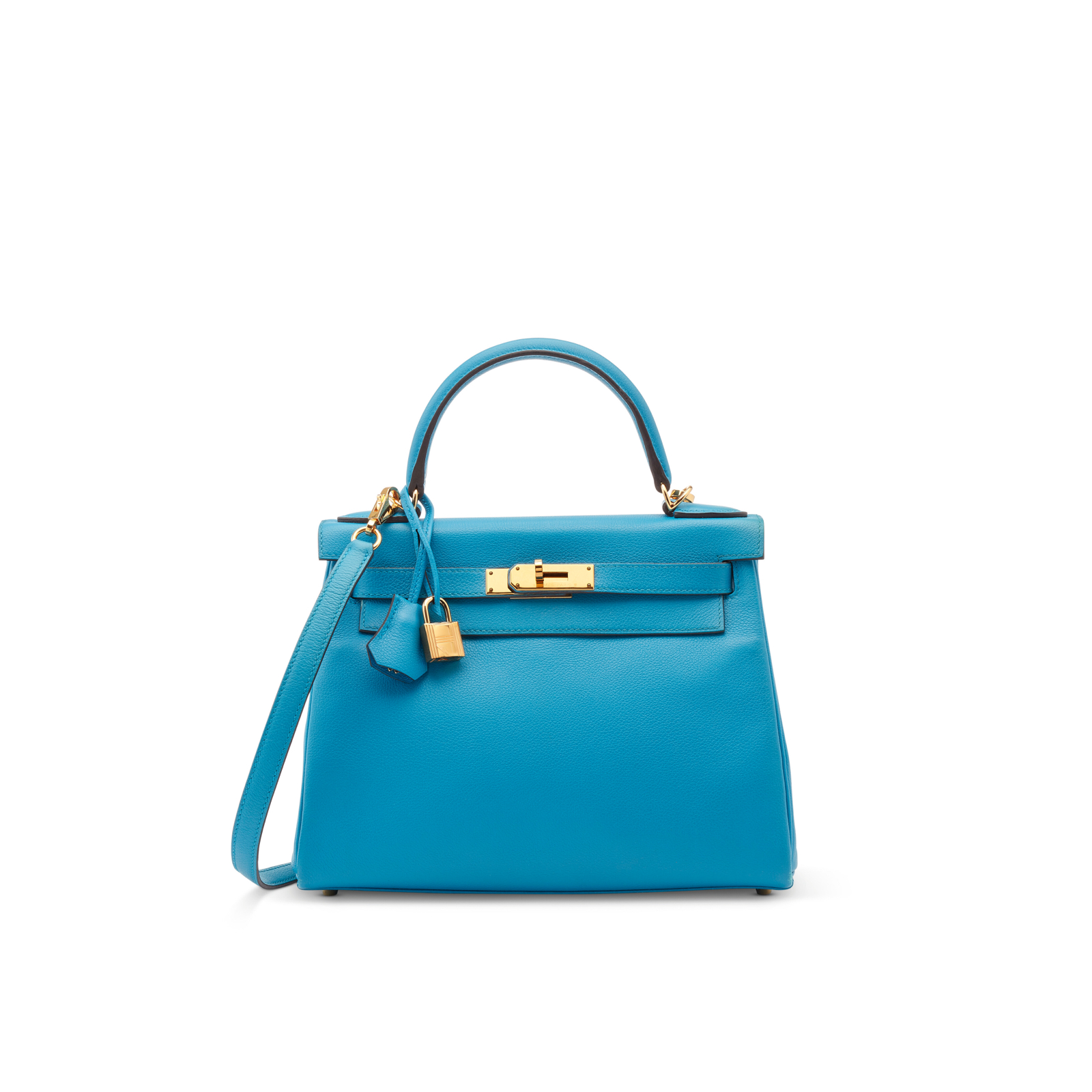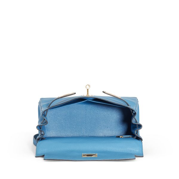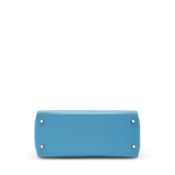 This KY, in the Retourne style, is in Bleu Zanzibar Evercolor leather with gold hardware and front flap, two straps with center toggle closure, clochette with lock and two keys, single rolled handle and removable shoulder strap.