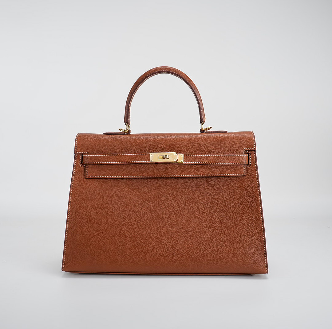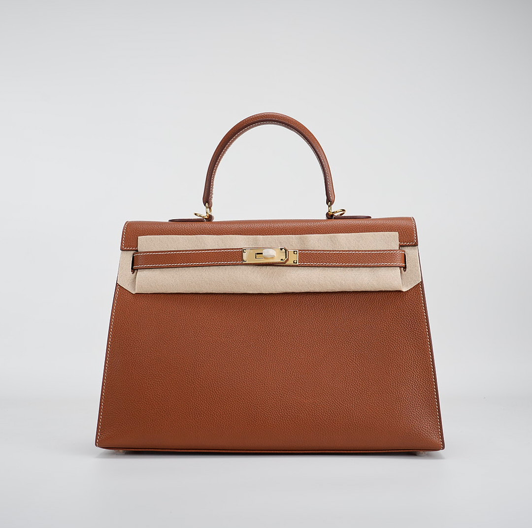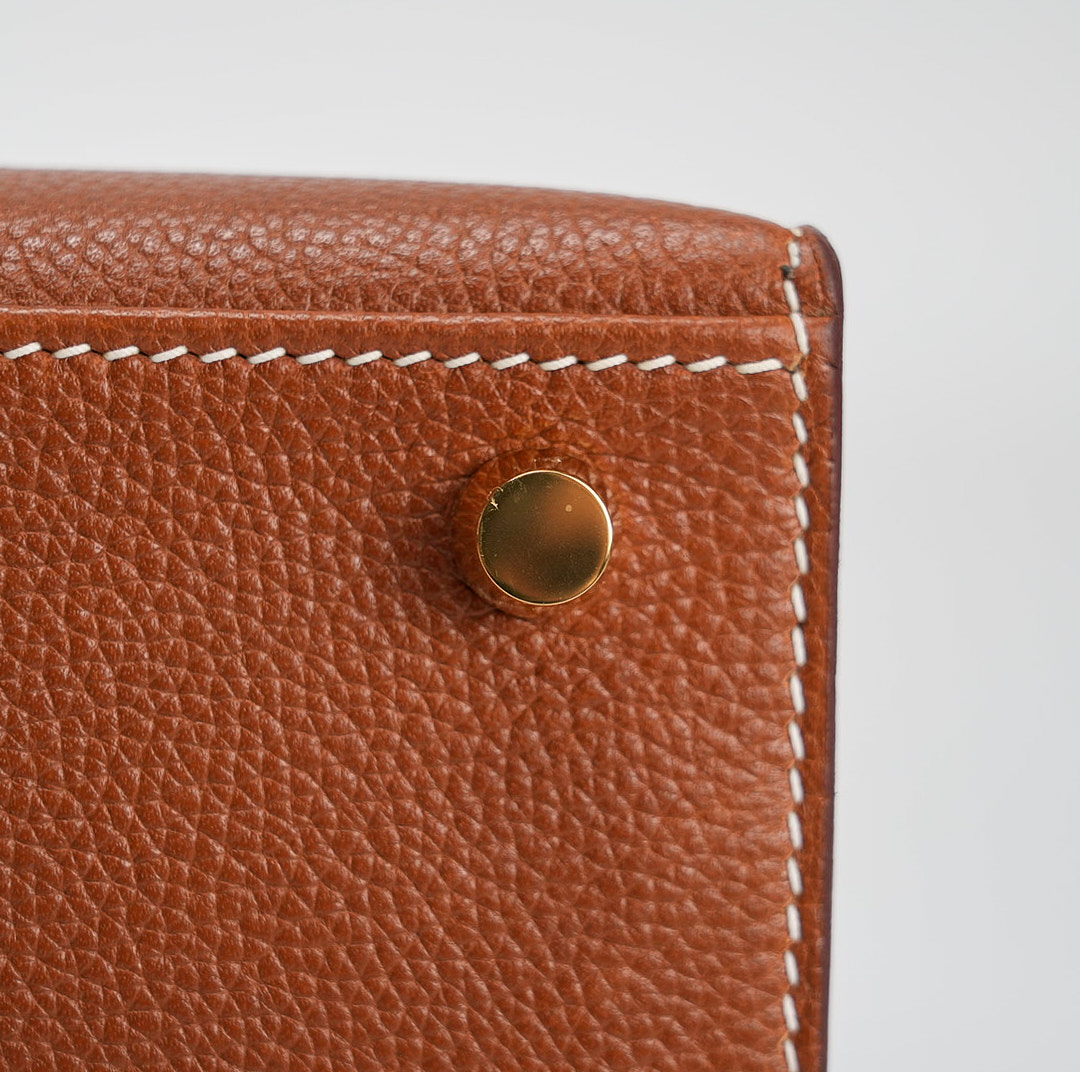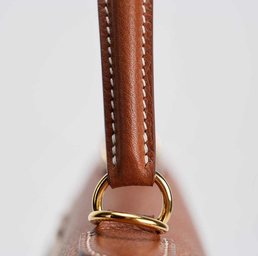 This KY 35 has been made from Barenia Faubourg, one of the most luxurious leather. Teinted in a timeless Fauve hue, it comes with contrasted white saddle stitching and gold hardware.