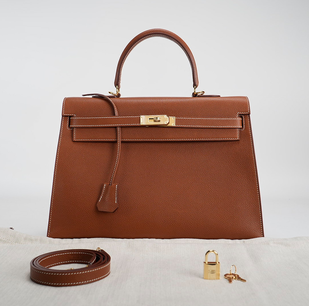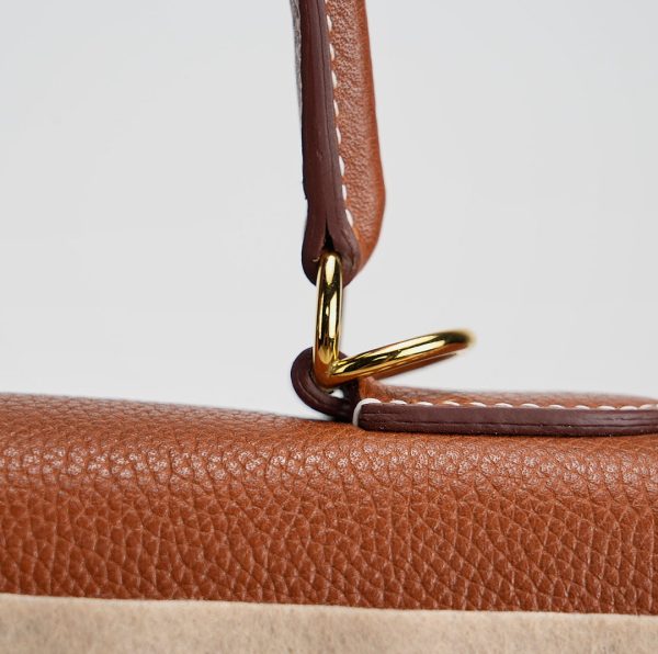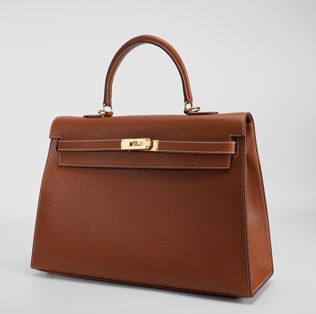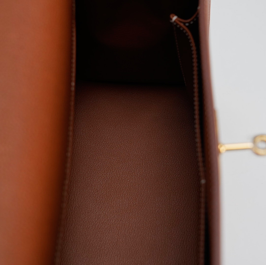 This KY 35 has been made from Barenia Faubourg, one of the most luxurious leather. Teinted in a timeless Fauve hue, it comes with contrasted white saddle stitching and gold hardware.