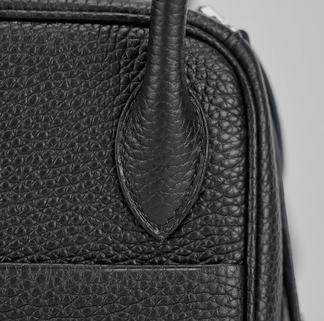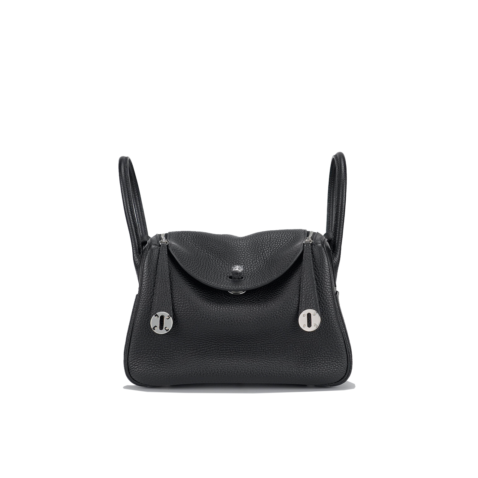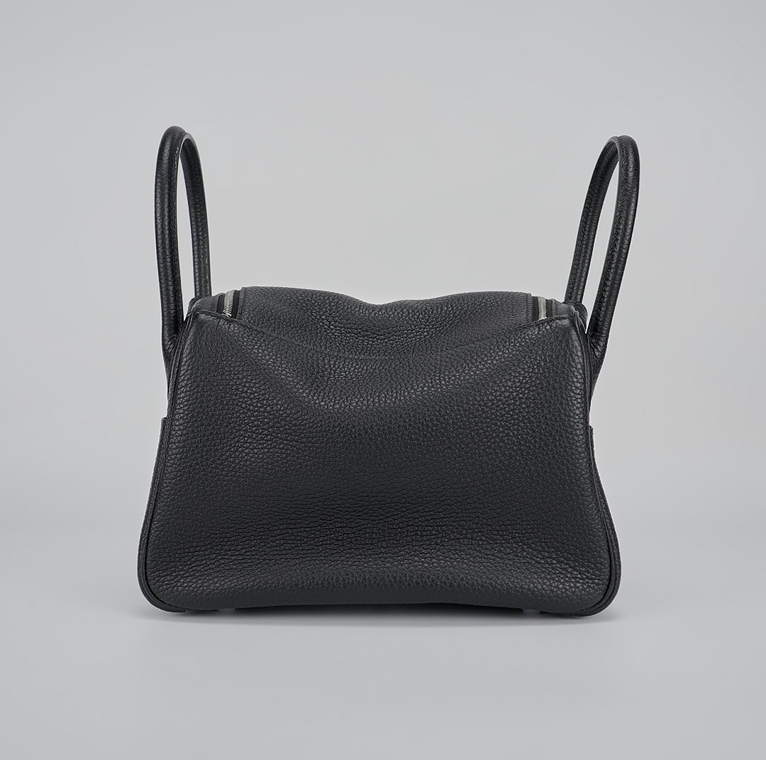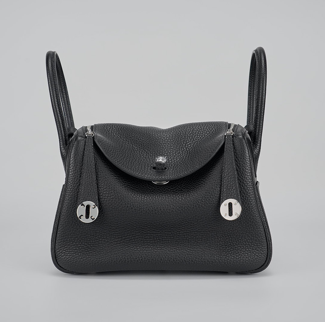 This Lindy is in Black clemence with Palladium hardware and features tonal stitching, double zipper pulls, center twist lock closure, five feet, and two top handles that are linked by a removable shoulder strap.