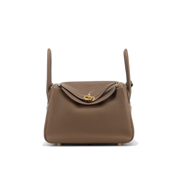 This Lindy is in Etoupe clemence with Gold hardware and features tonal stitching, double zipper pulls, center twist lock closure, five feet, and two top handles that are linked by a removable shoulder strap.
