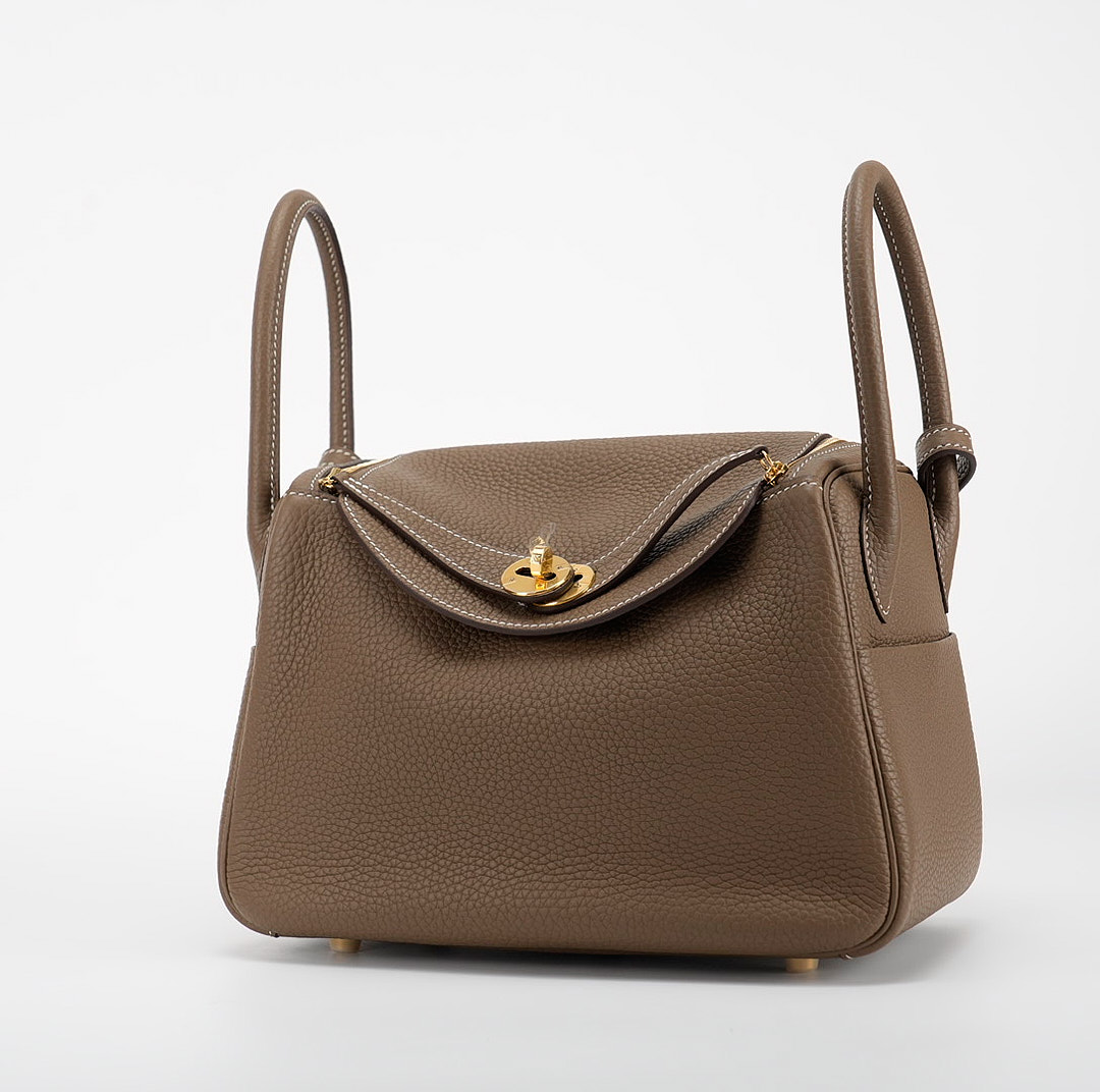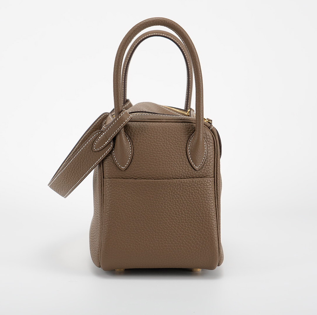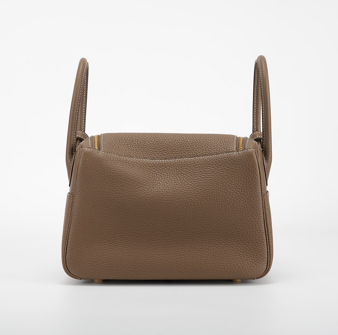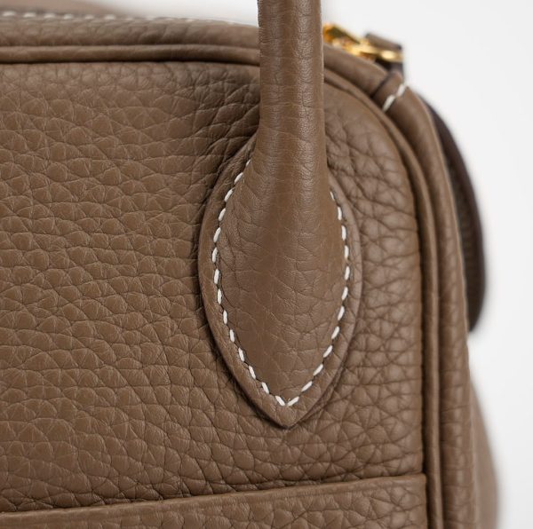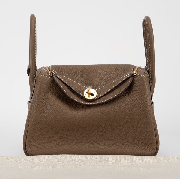 This Lindy is in Etoupe clemence with Gold hardware and features tonal stitching, double zipper pulls, center twist lock closure, five feet, and two top handles that are linked by a removable shoulder strap.