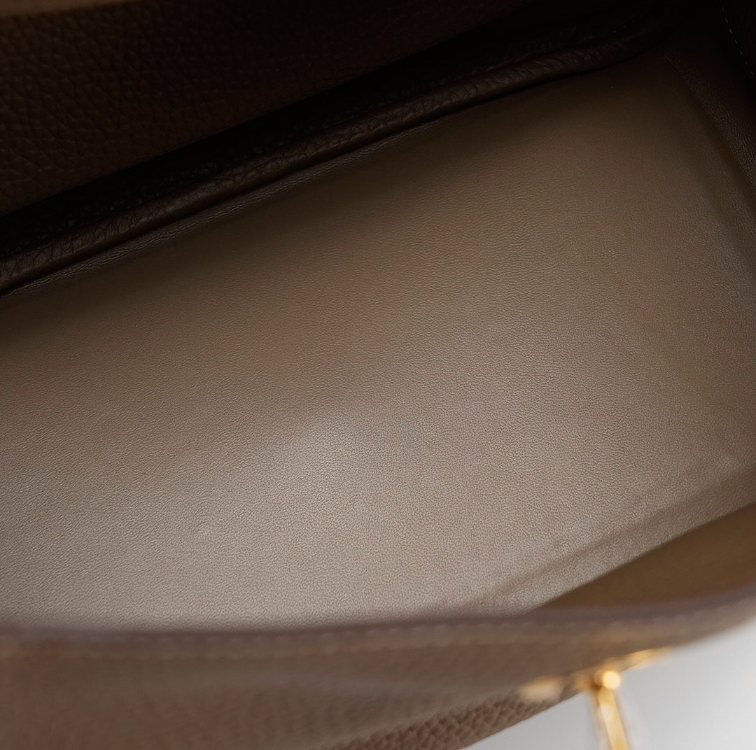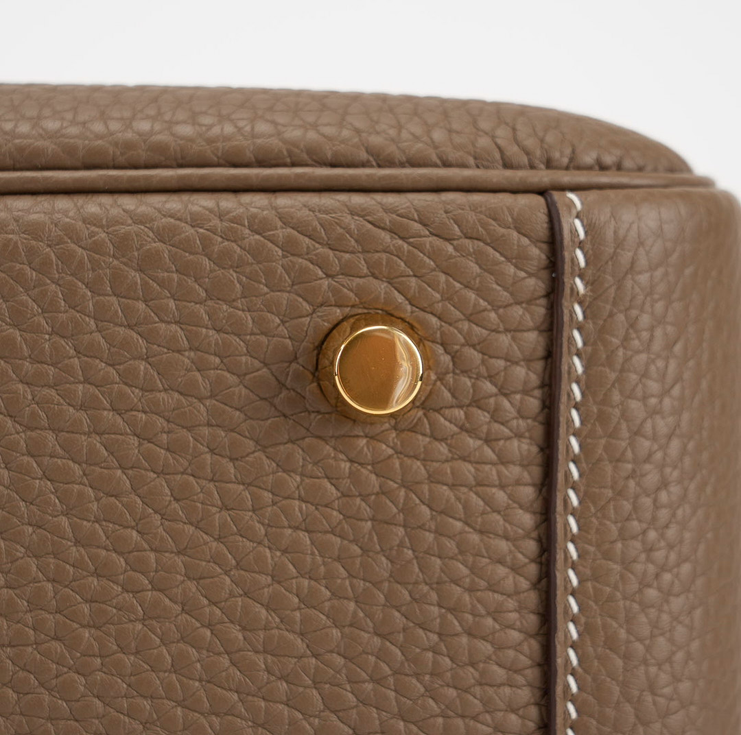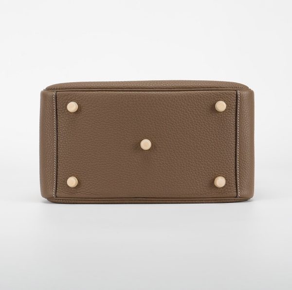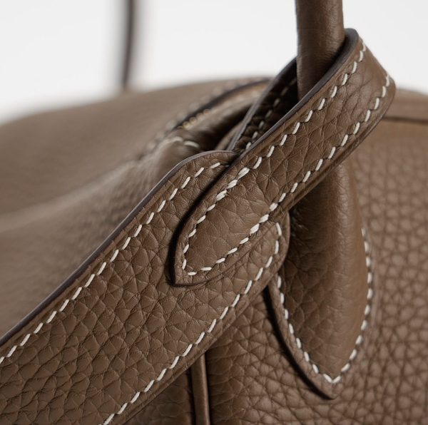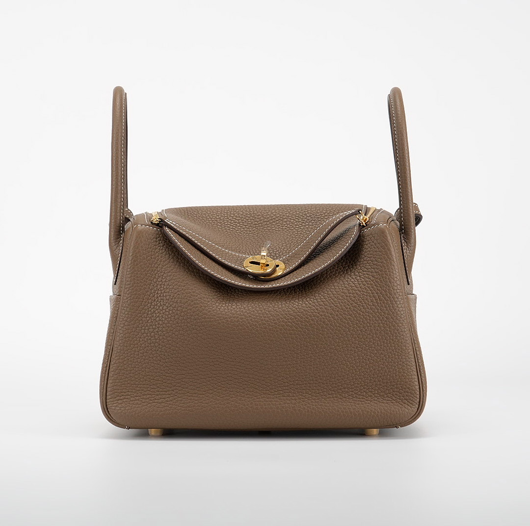 This Lindy is in Etoupe clemence with Gold hardware and features tonal stitching, double zipper pulls, center twist lock closure, five feet, and two top handles that are linked by a removable shoulder strap.