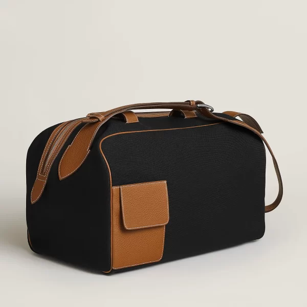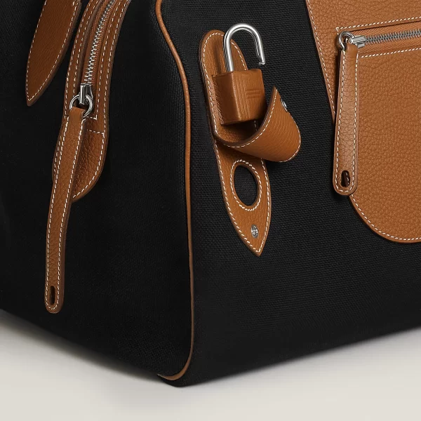 Bag in Goeland canvas and taurillon Clemence leather with adjustable shoulder strap, zipped front pocket, double exterior credit card slot on the back, Airtag slot under leather tab and leather-covered lock closure.