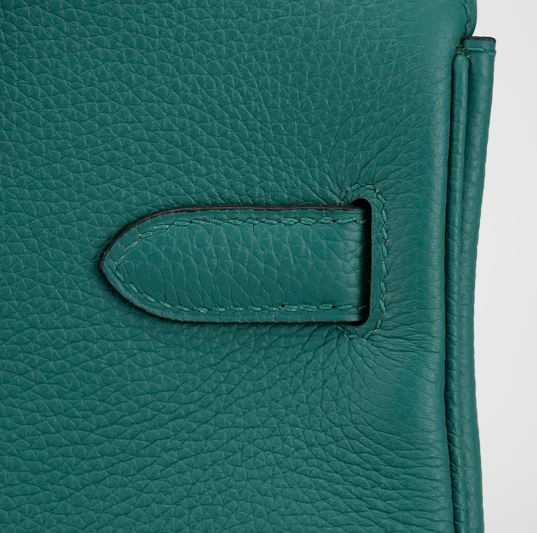 This BK is in Malachite Togo leather with Palladium hardware, has tonal stitching, front flap, two straps with center toggle closure, clochette with lock and two keys, and double rolled handles.