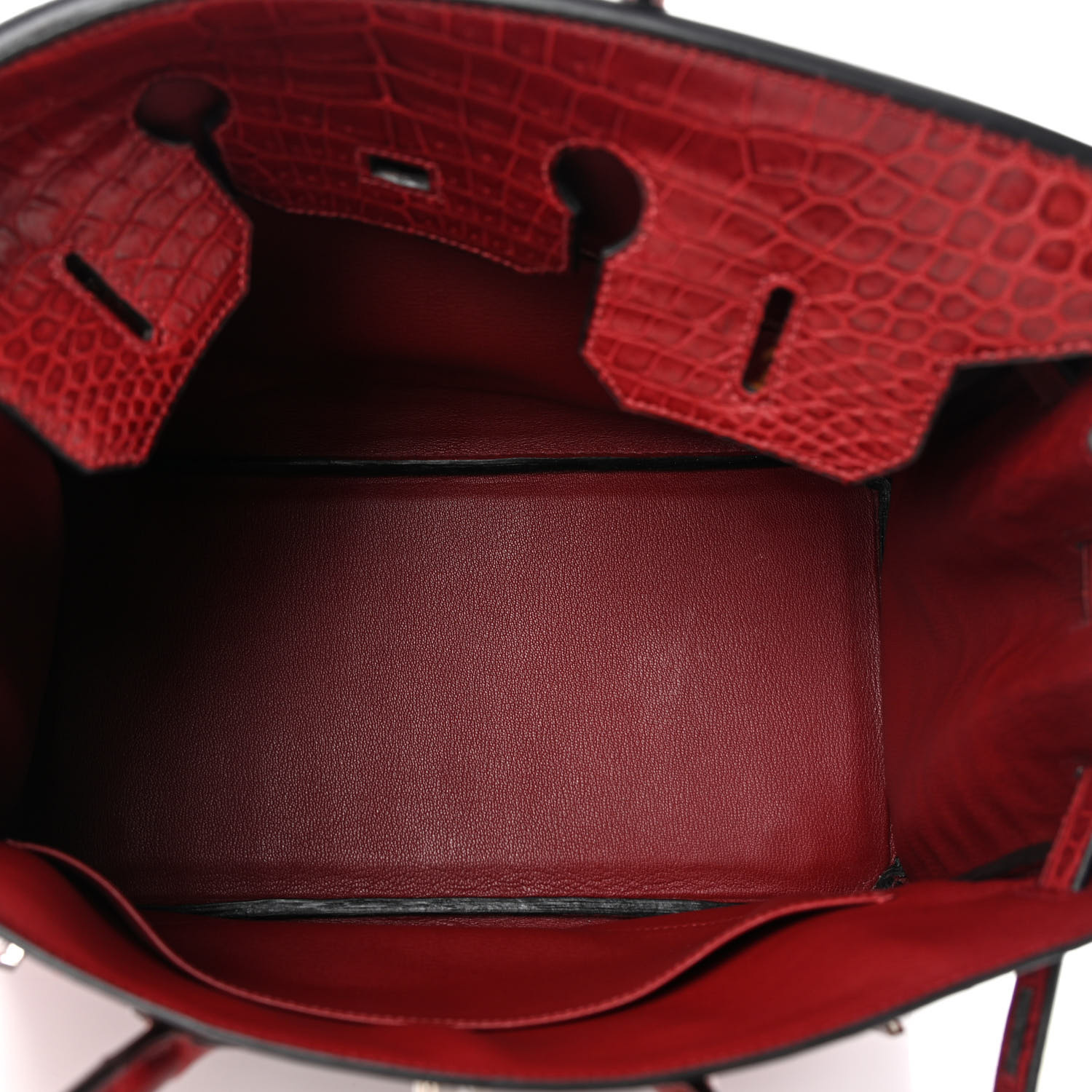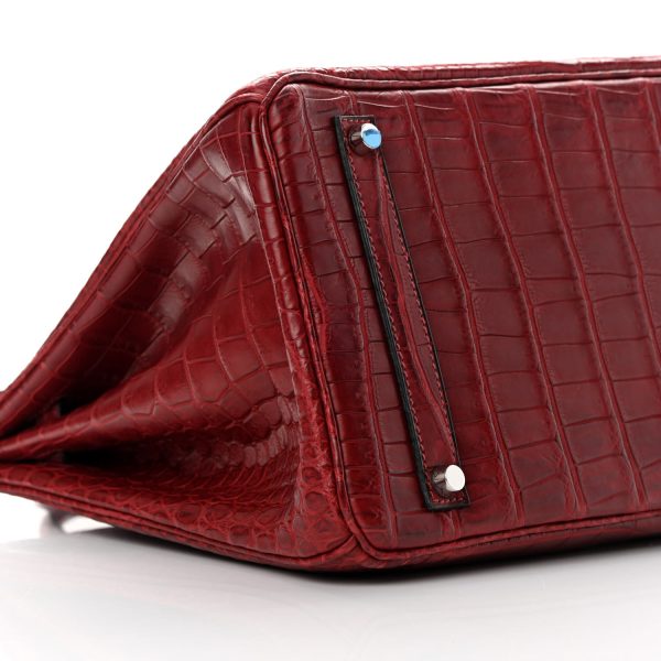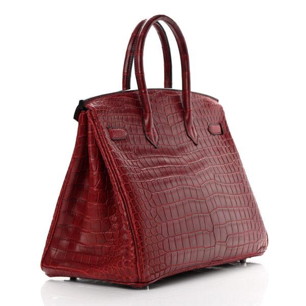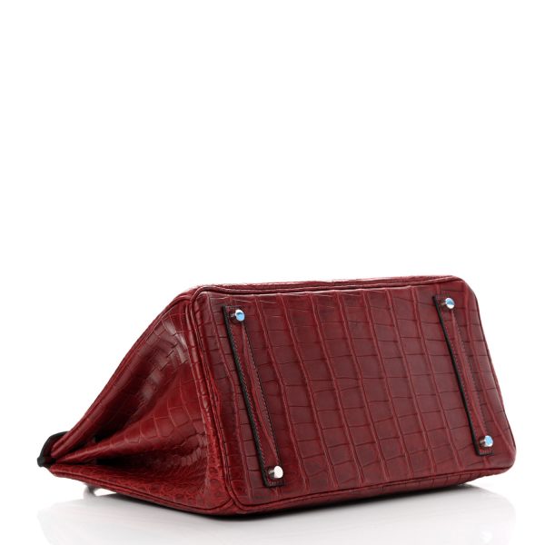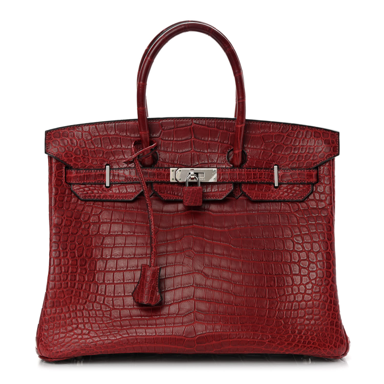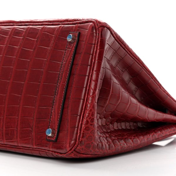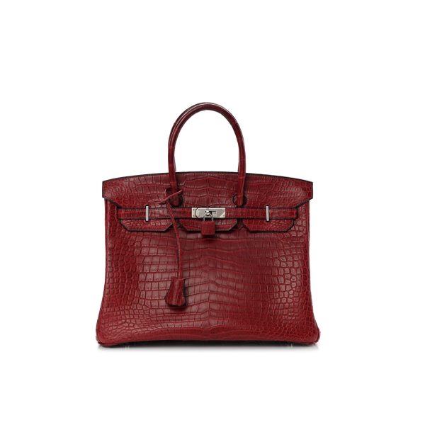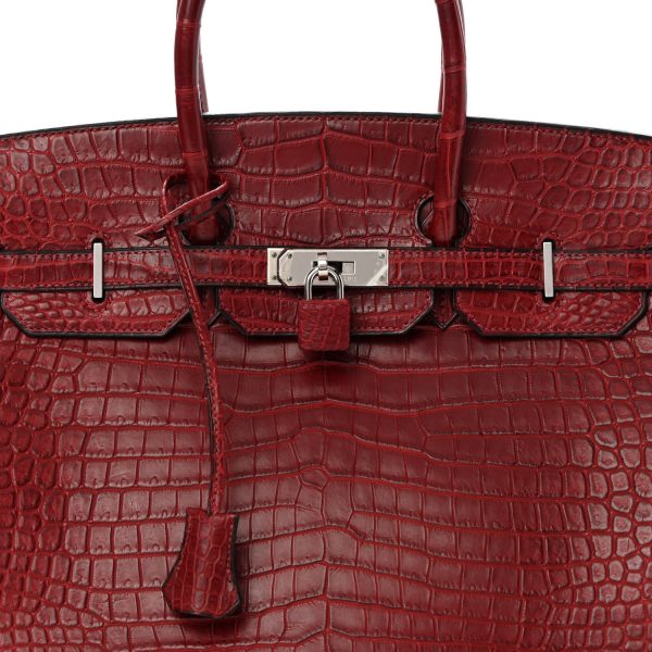This is the Matte Porosus Crocodile BK 35 in Rouge H. This stunning handbag is featured here in luxurious red crocodile including the padlock and a clochette to store the keys. This bag also features Palladium hardware found at the straps, lock, and feet. The top flap opens to a matching interior of chevre goatskin leather with zipper and patch pockets.