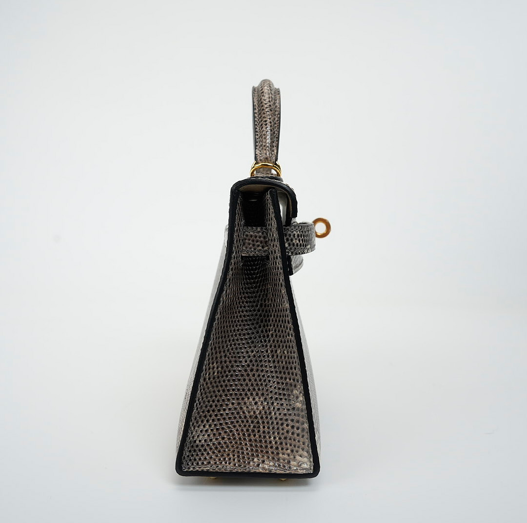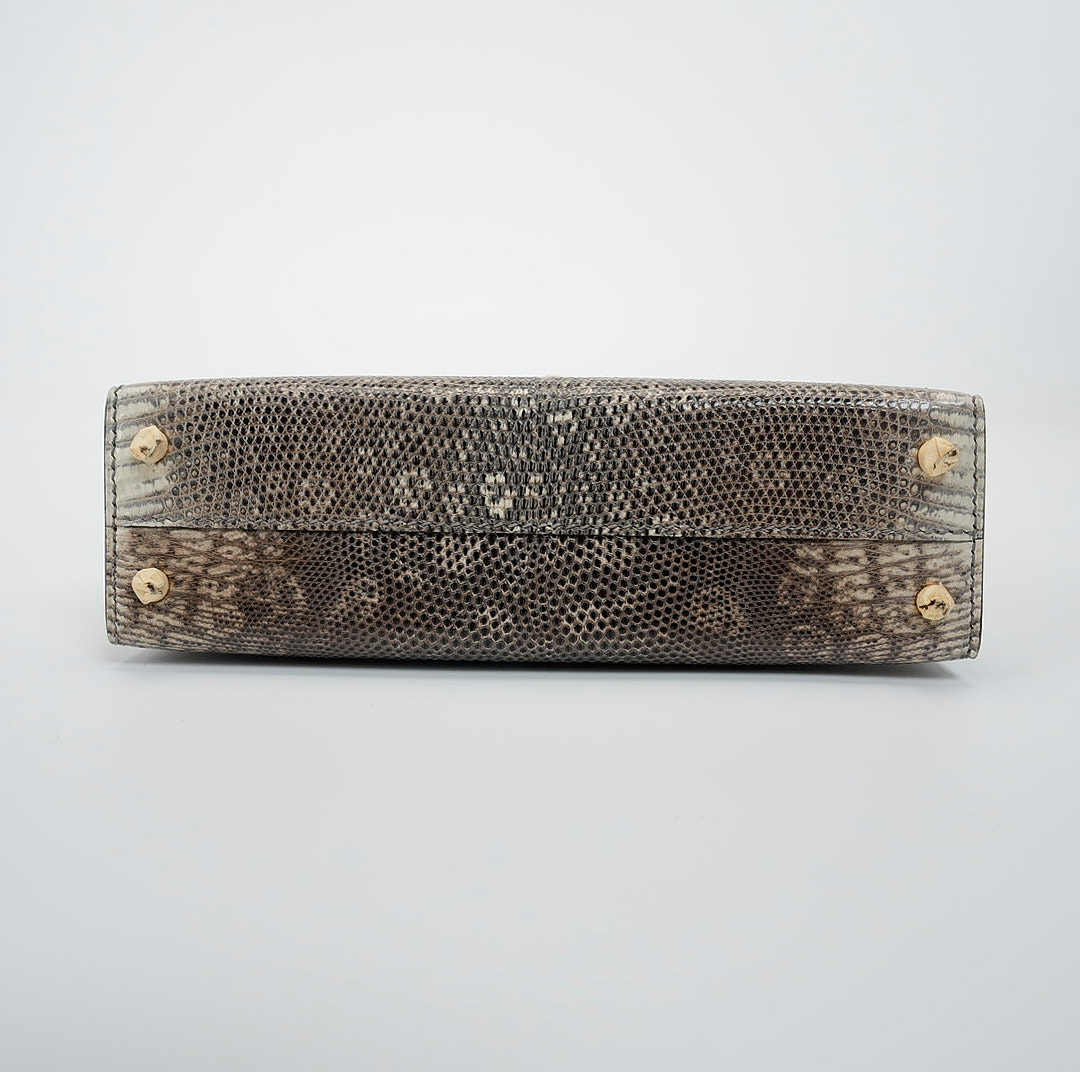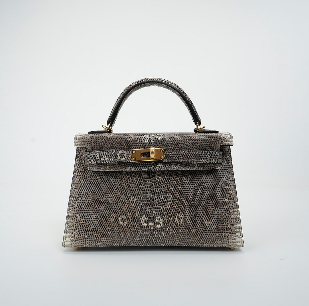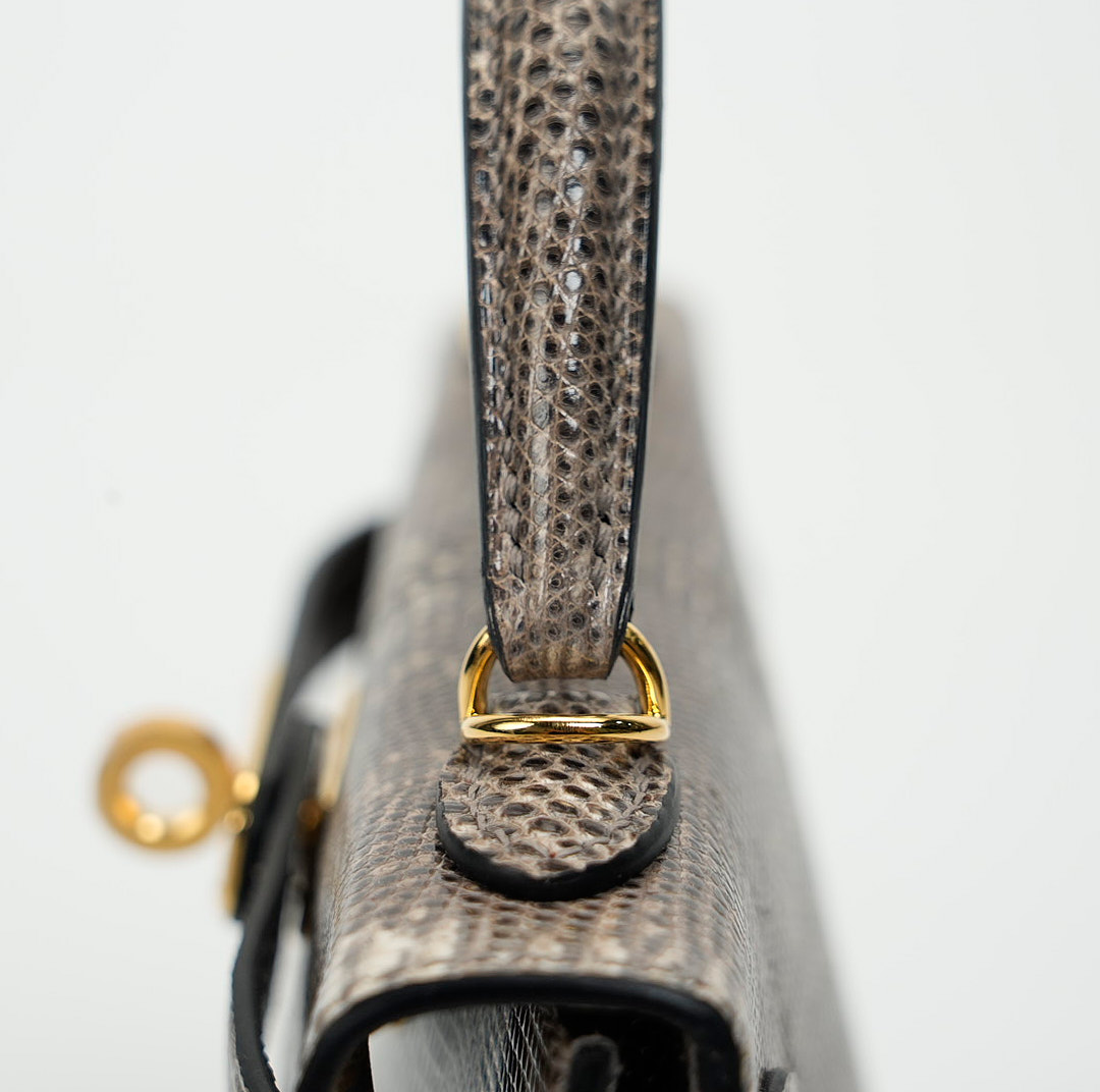 An exotic Mini KY handcrafted from Lizard leather. It is enhanced with gold-plated hardware.