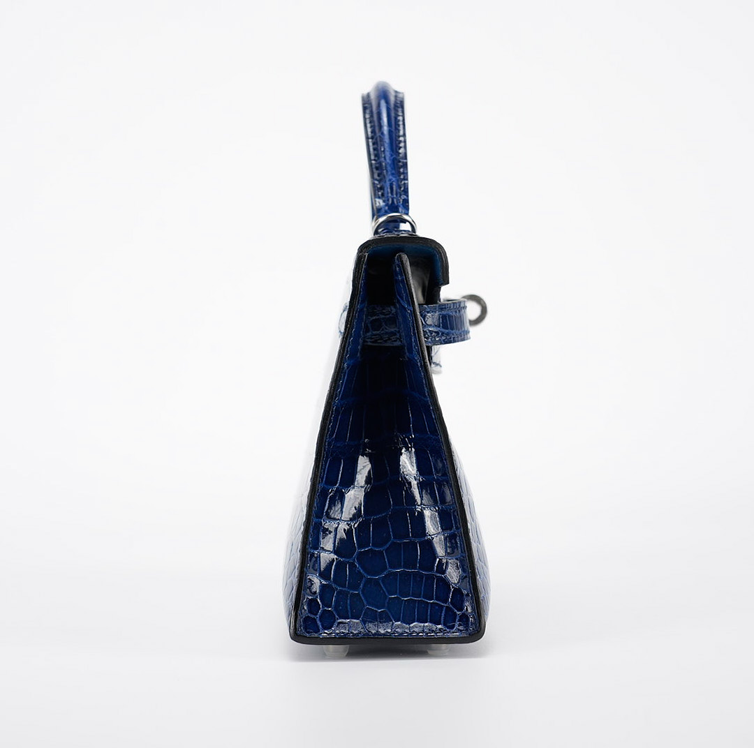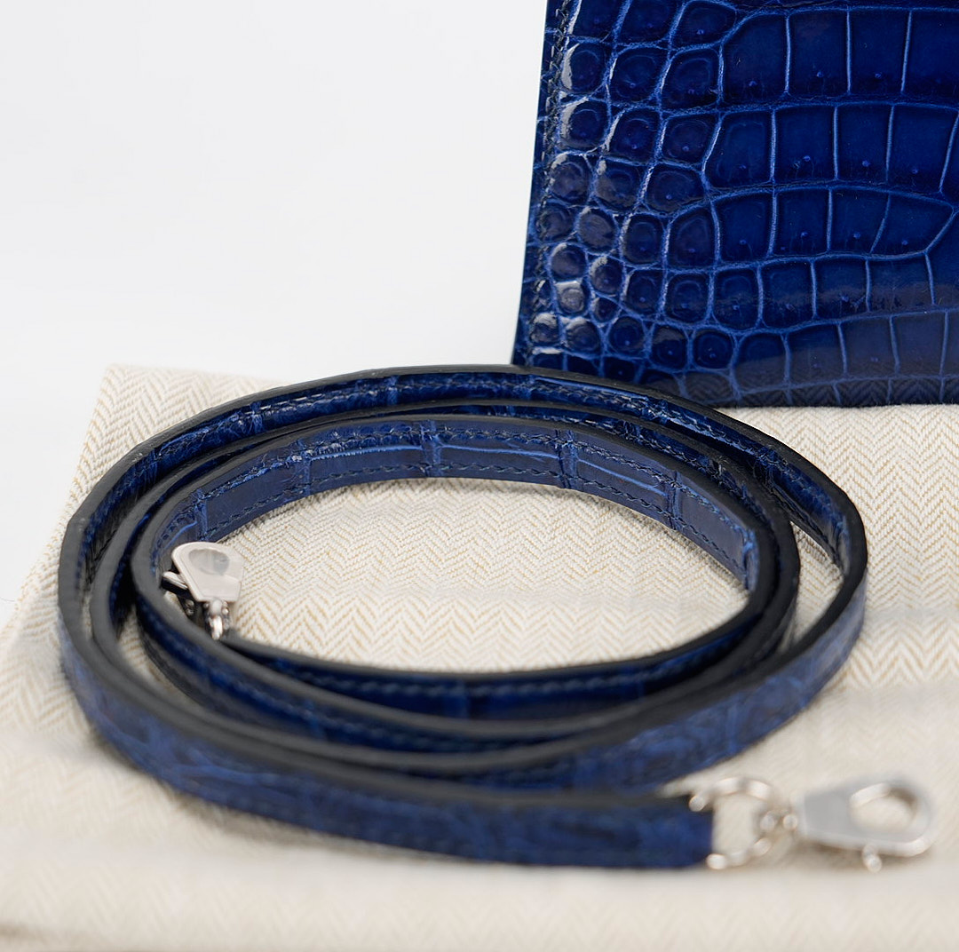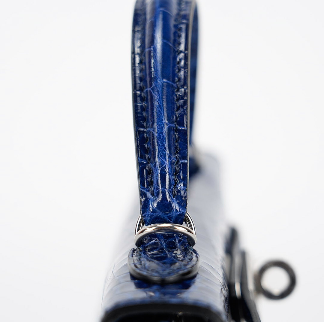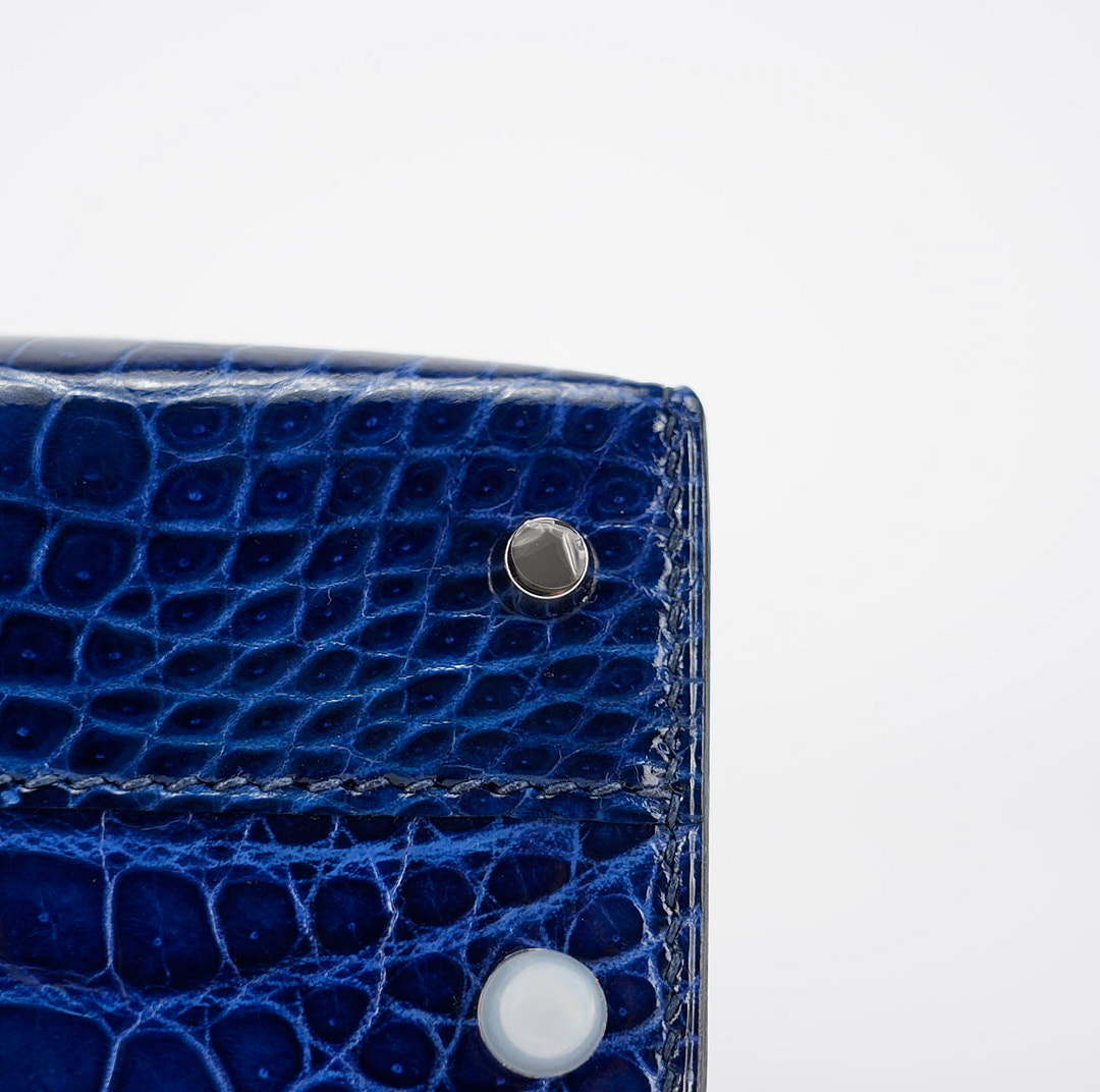 An exotic mini KY handcrafted from Shinny Bleu Niloticus Crocodile leather, topped with palladium hardware.