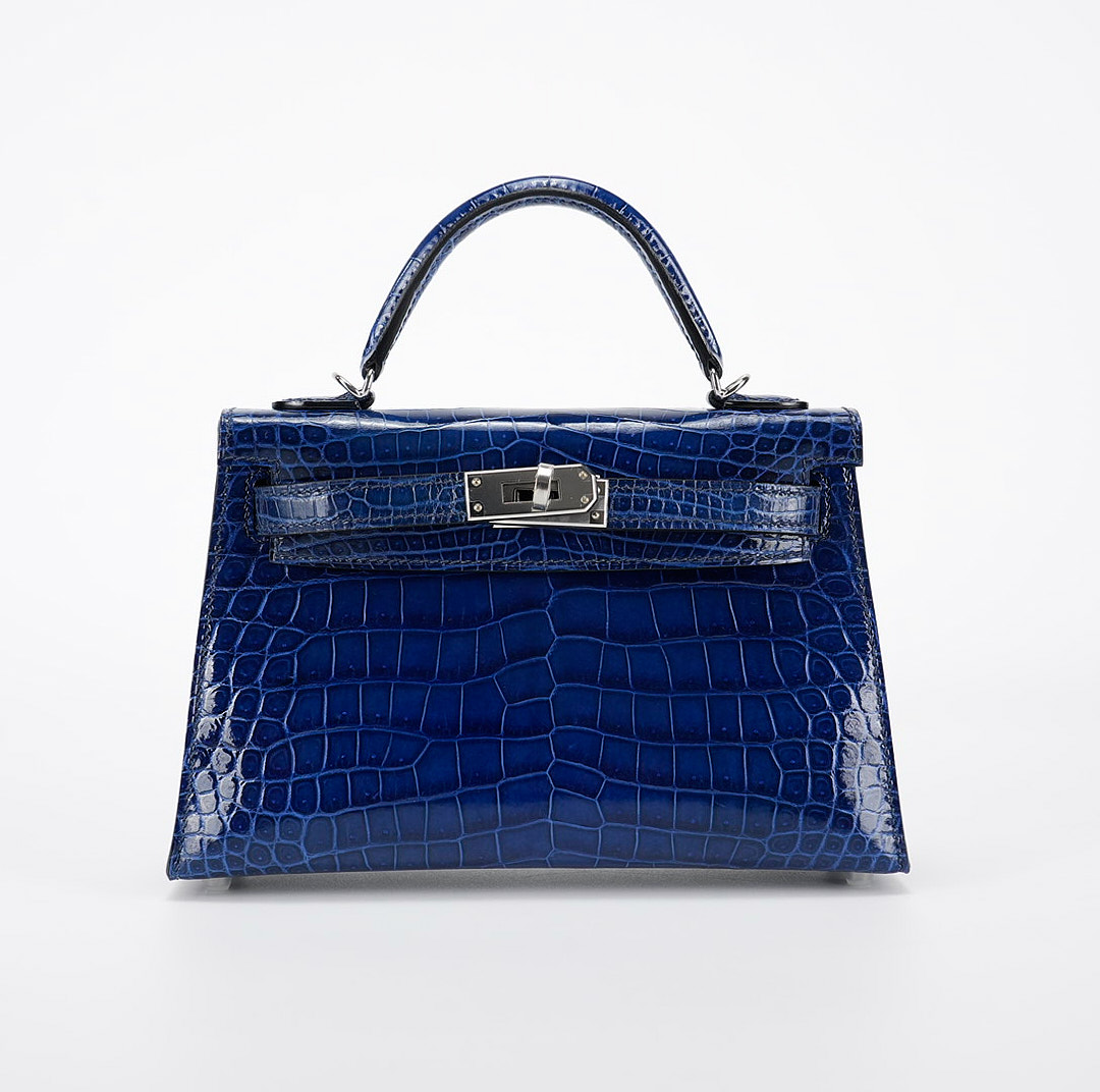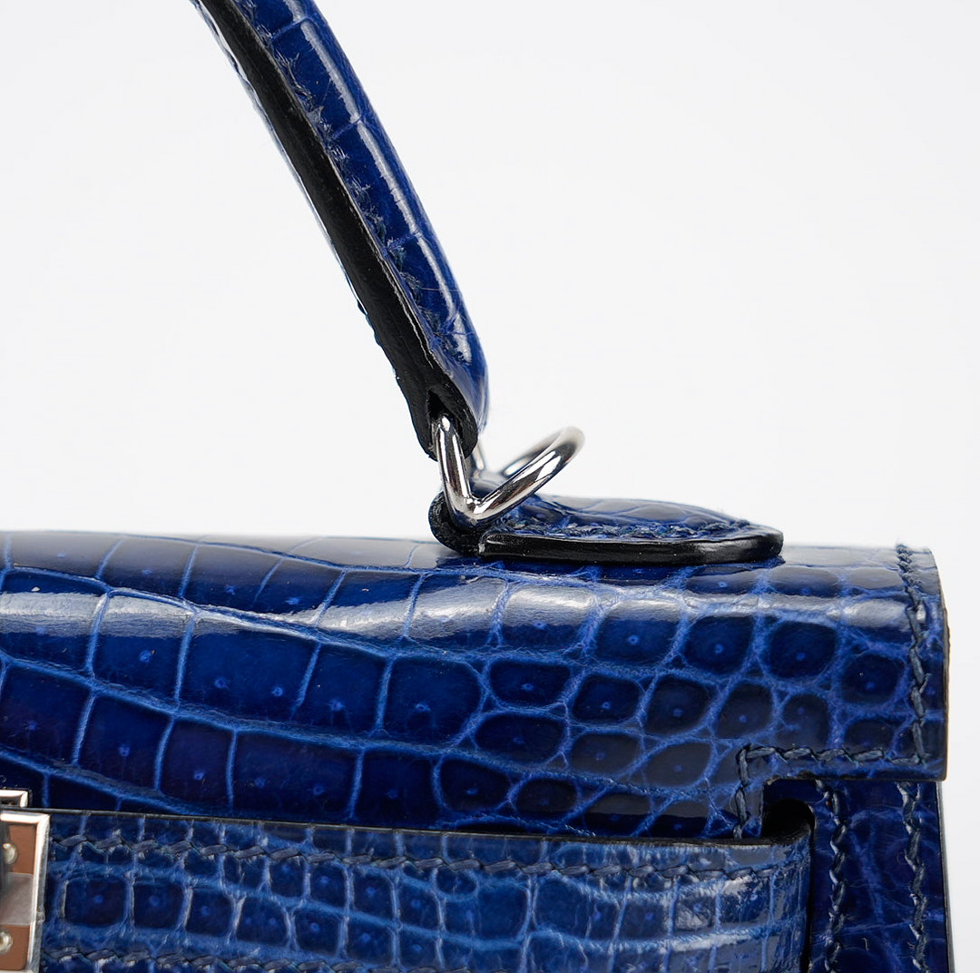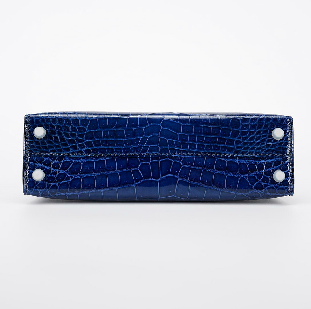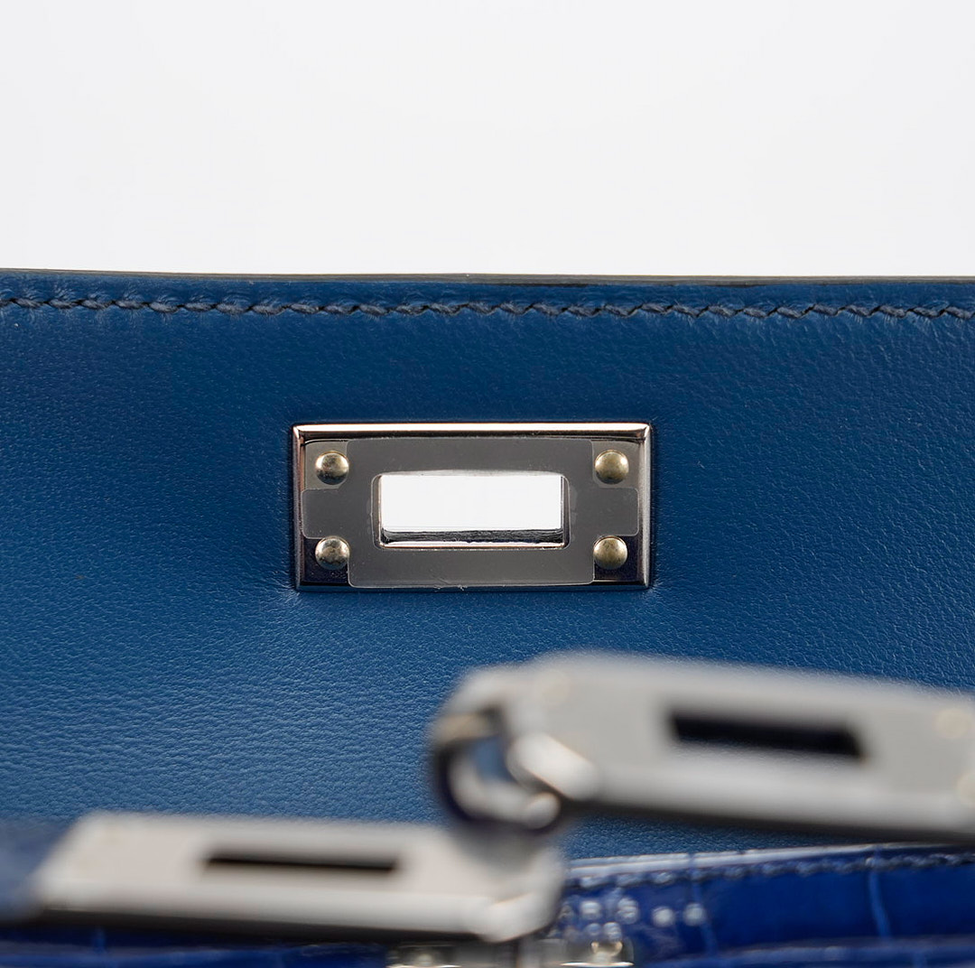 An exotic mini KY handcrafted from Shinny Bleu Niloticus Crocodile leather, topped with palladium hardware.