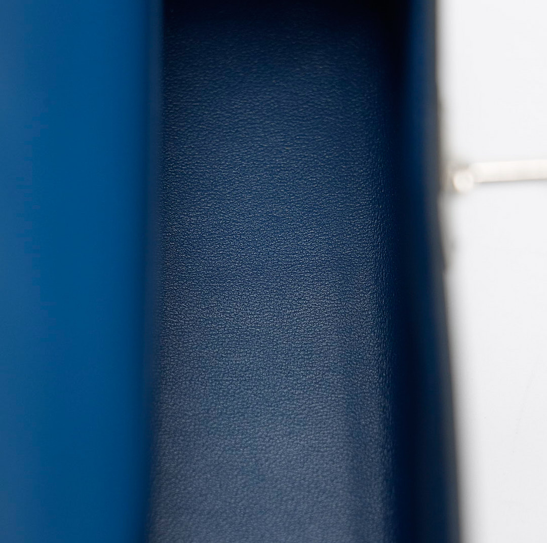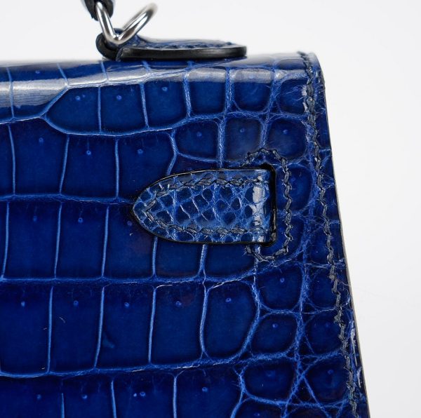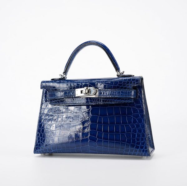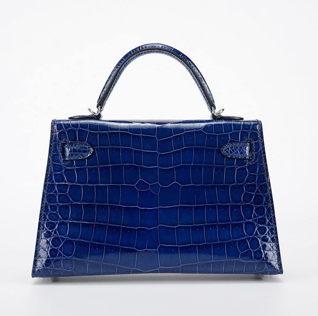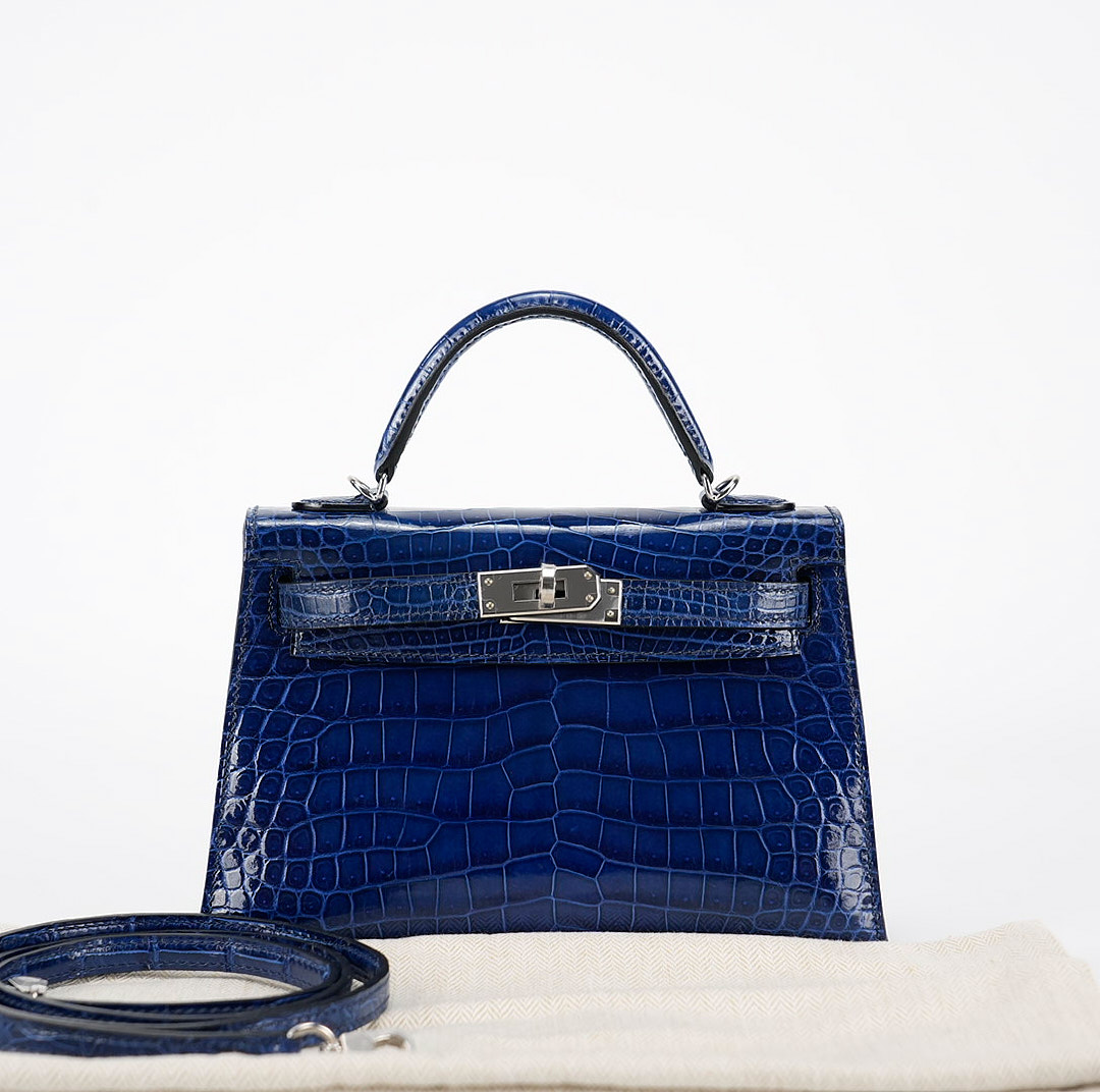 An exotic mini KY handcrafted from Shinny Bleu Niloticus Crocodile leather, topped with palladium hardware.