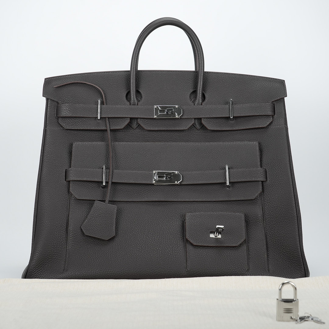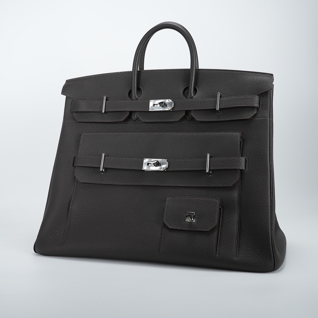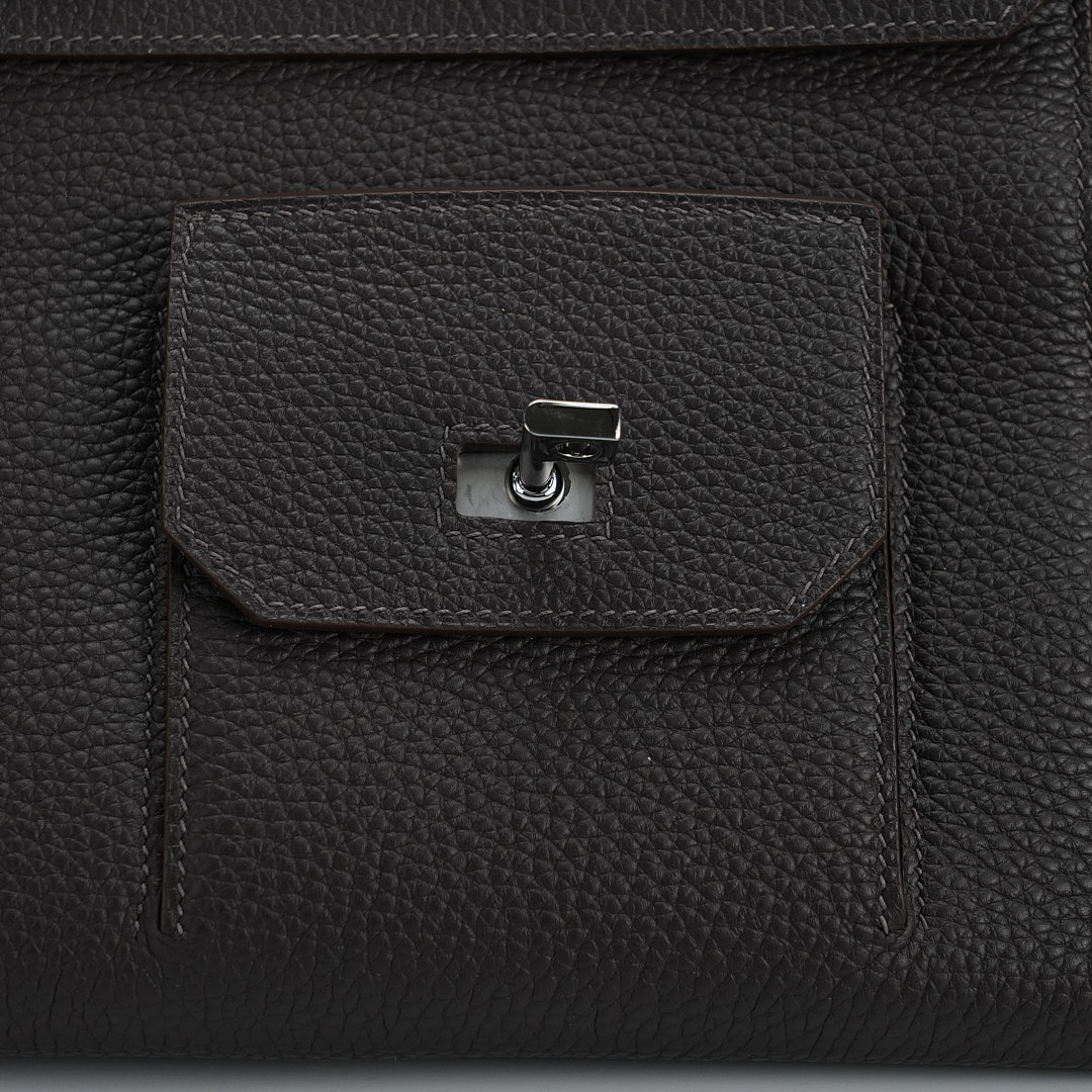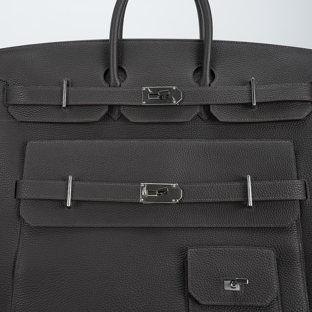 Embrace timeless elegance with this Ecorce Café Multi-Pockets 50 in Taurillon Clemence leather. This spacious bag pays homage to equestrian heritage while meeting modern lifestyle needs.