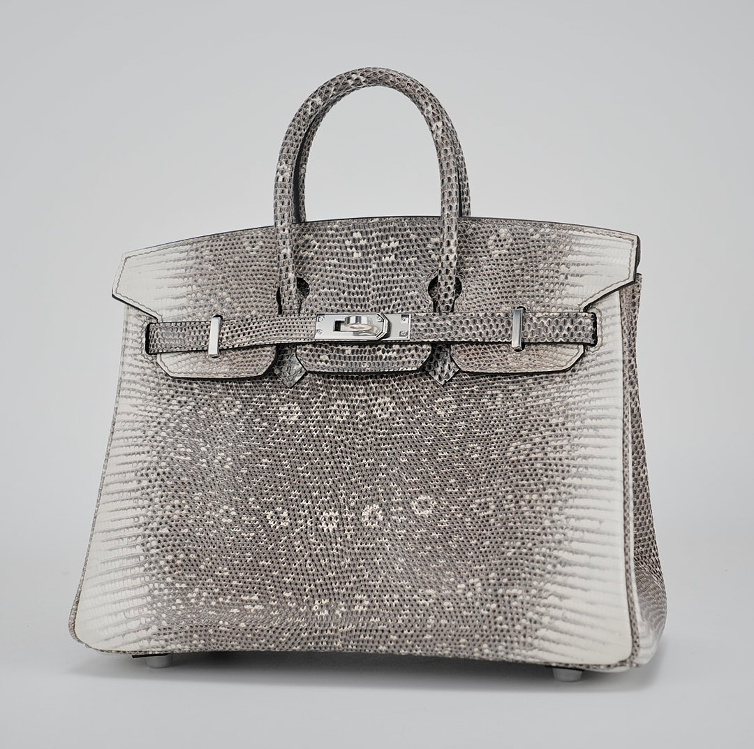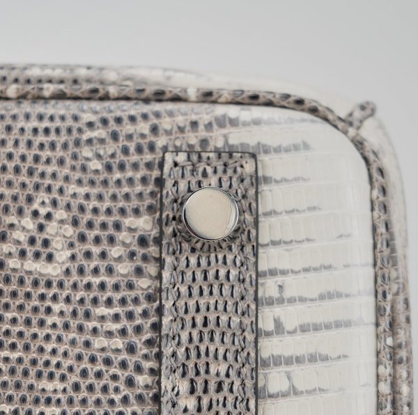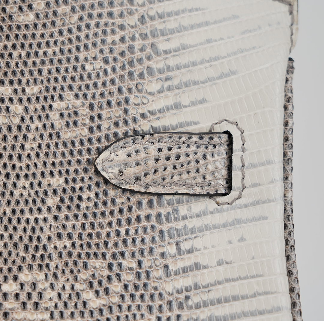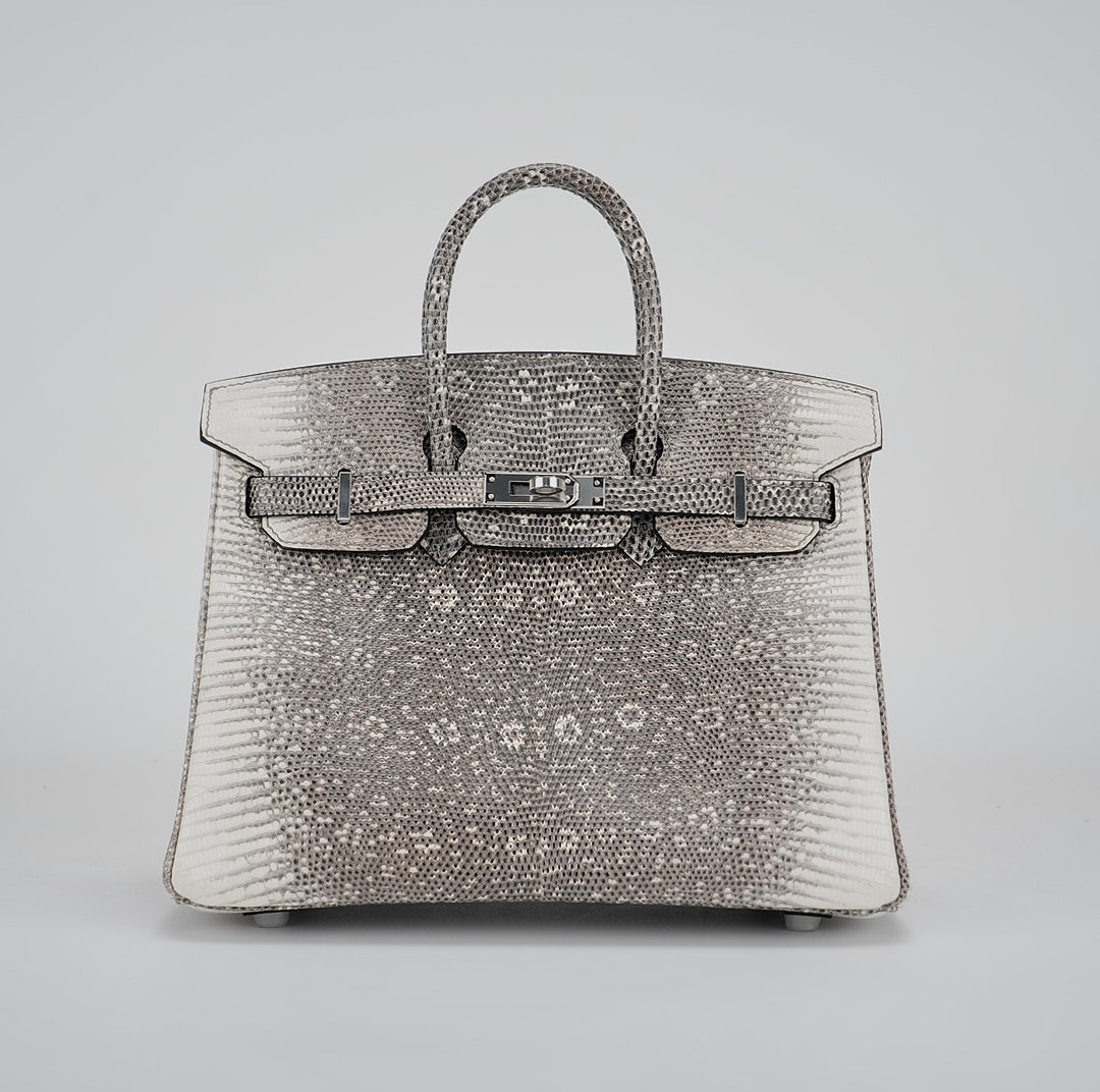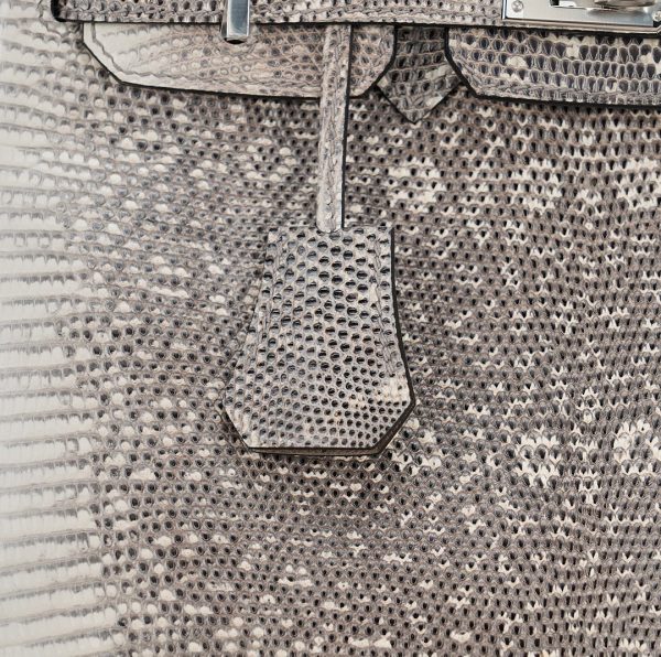 This BK is in Ombre Varanus Salvator Lizard with Palladium hardware and has tonal stitching, front strap, two straps with center toggle closure, clochette with lock and two keys and double rolled handles.