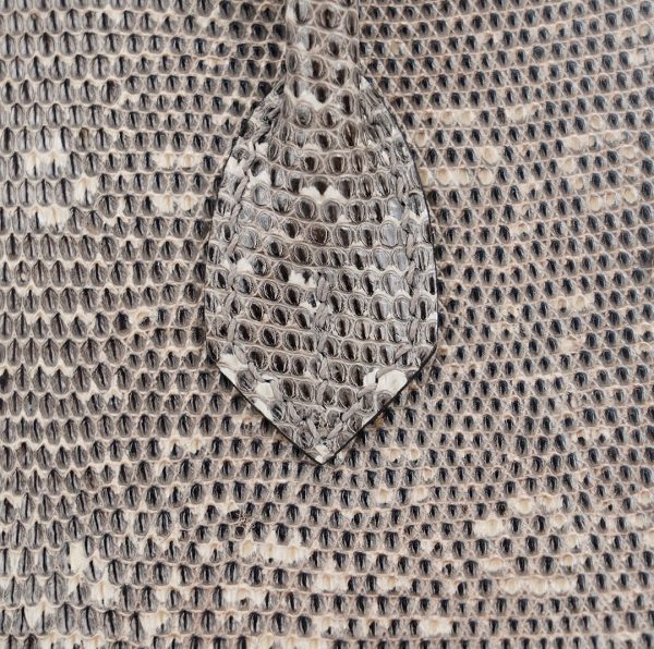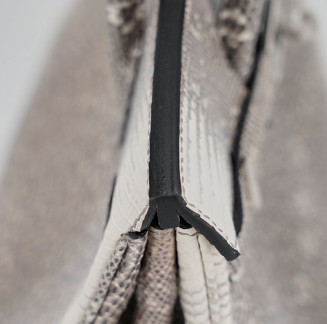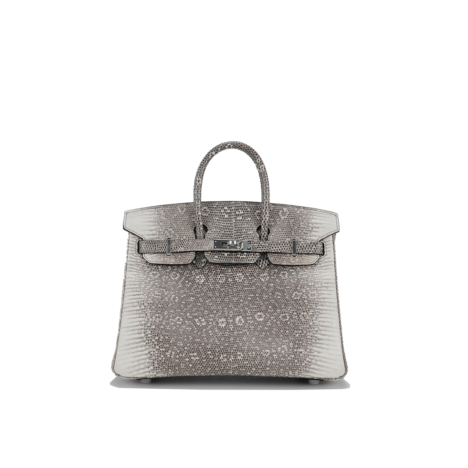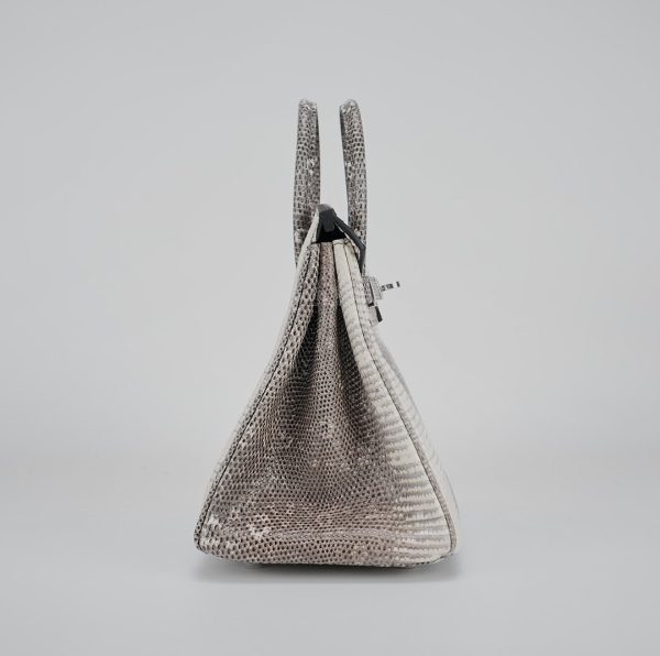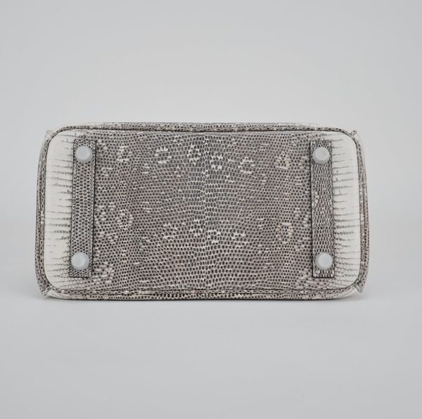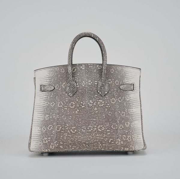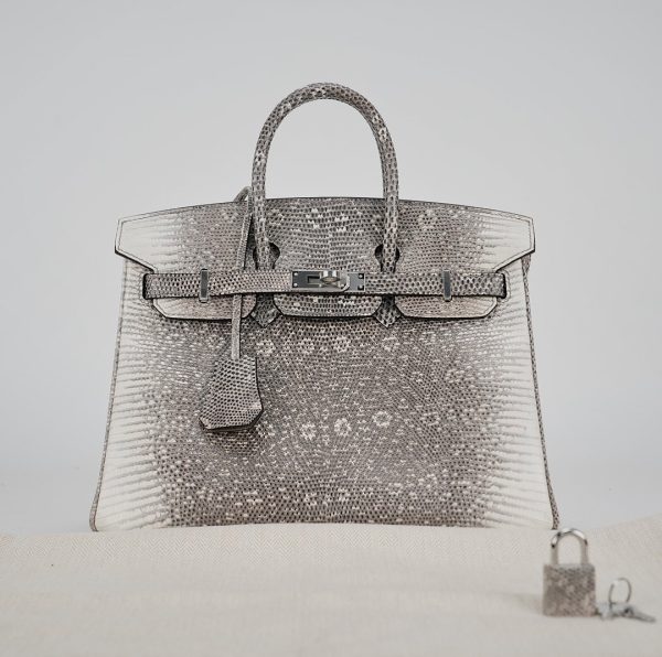 This BK is in Ombre Varanus Salvator Lizard with Palladium hardware and has tonal stitching, front strap, two straps with center toggle closure, clochette with lock and two keys and double rolled handles.