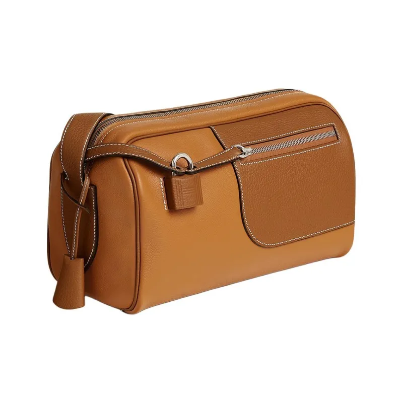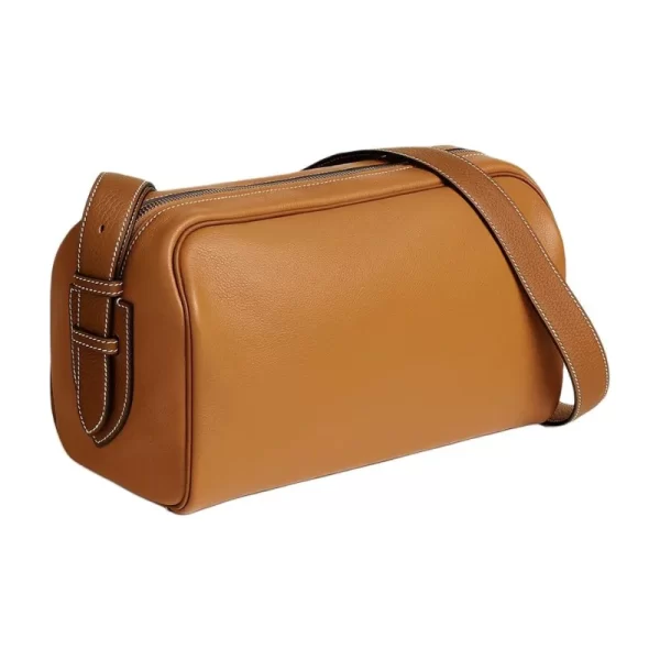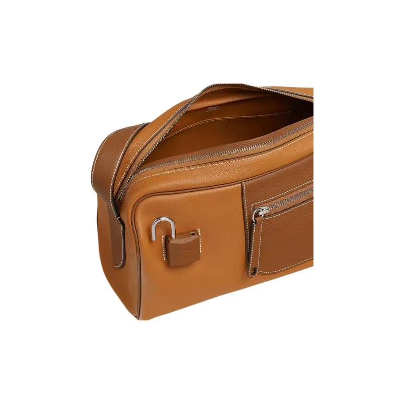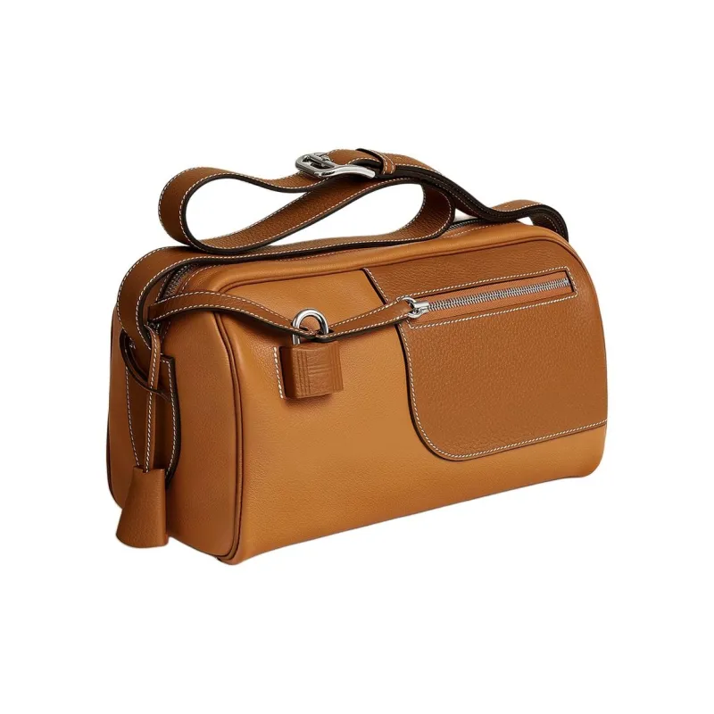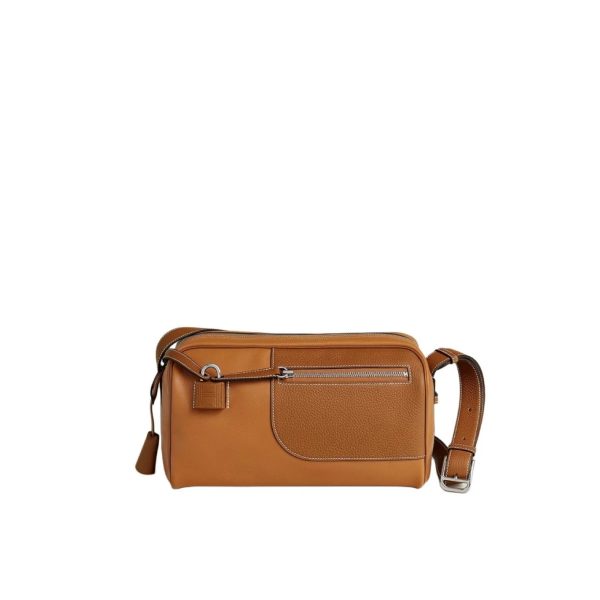 Bag in Evercolor calfskin and taurillon Clemence leather with adjustable shoulder strap, zipped front pocket and leather-covered lock closure. Inspired by photographers’ bags featuring multiple pockets, this line introduces a new style and gives the lock closure a signature role on the front of the bag. Loops allow for a short or long carry.