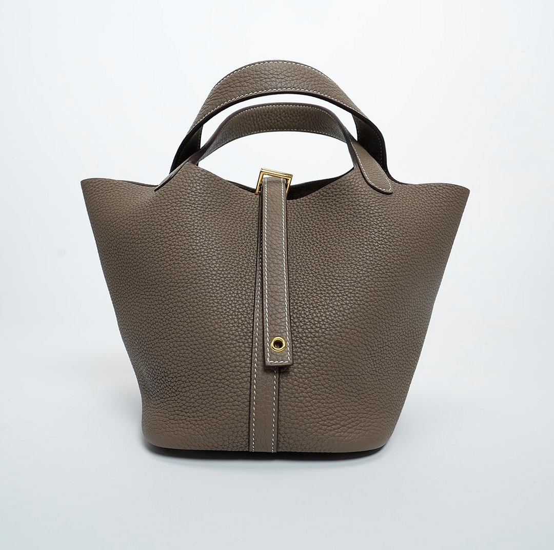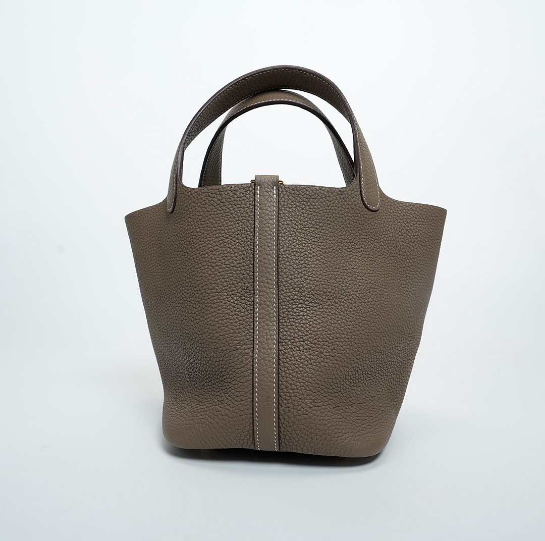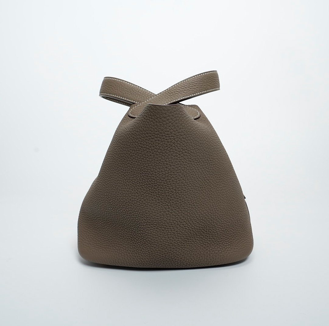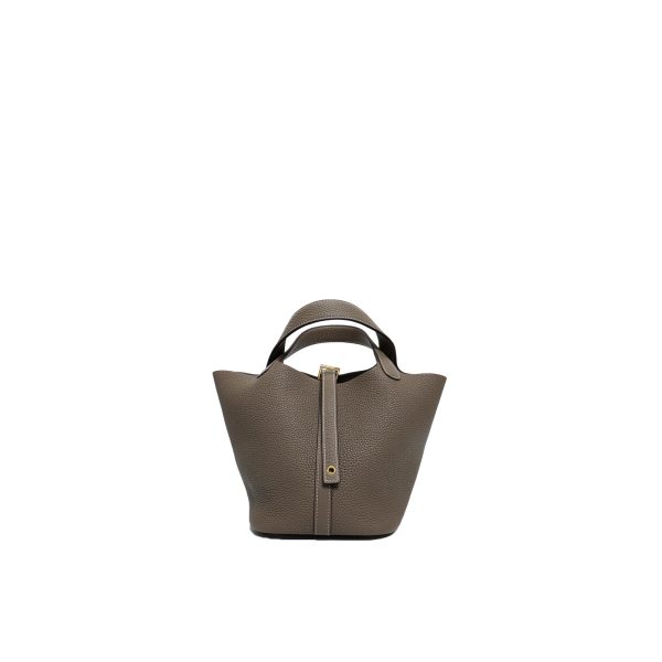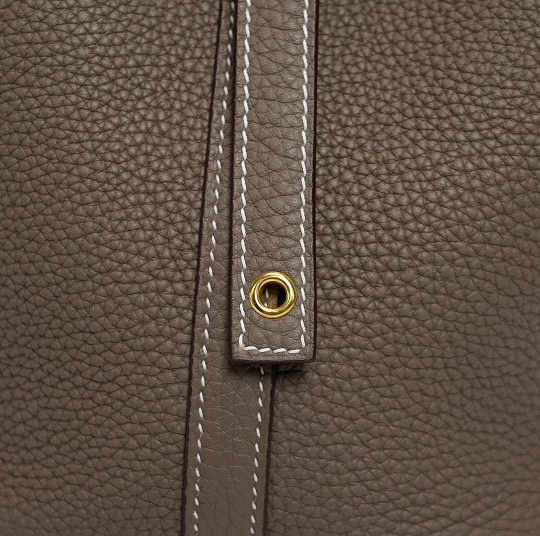 Picotin 18 was handcrafted from fine-grained Taurillon Clemence leather in Etoupe, a versatile grey-brown taupe, and accented with a gold-plated padlock. Its unlined leather and simple, flexible handles make it the ultimate minimalist companion. The top is open to a suede and textured leather interior.
