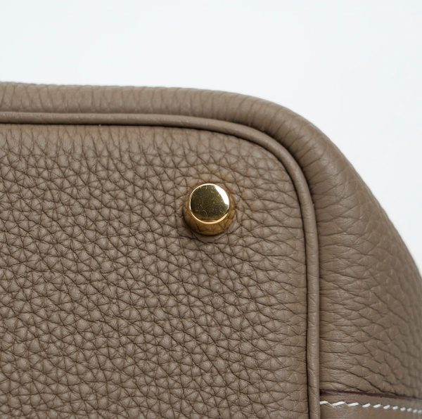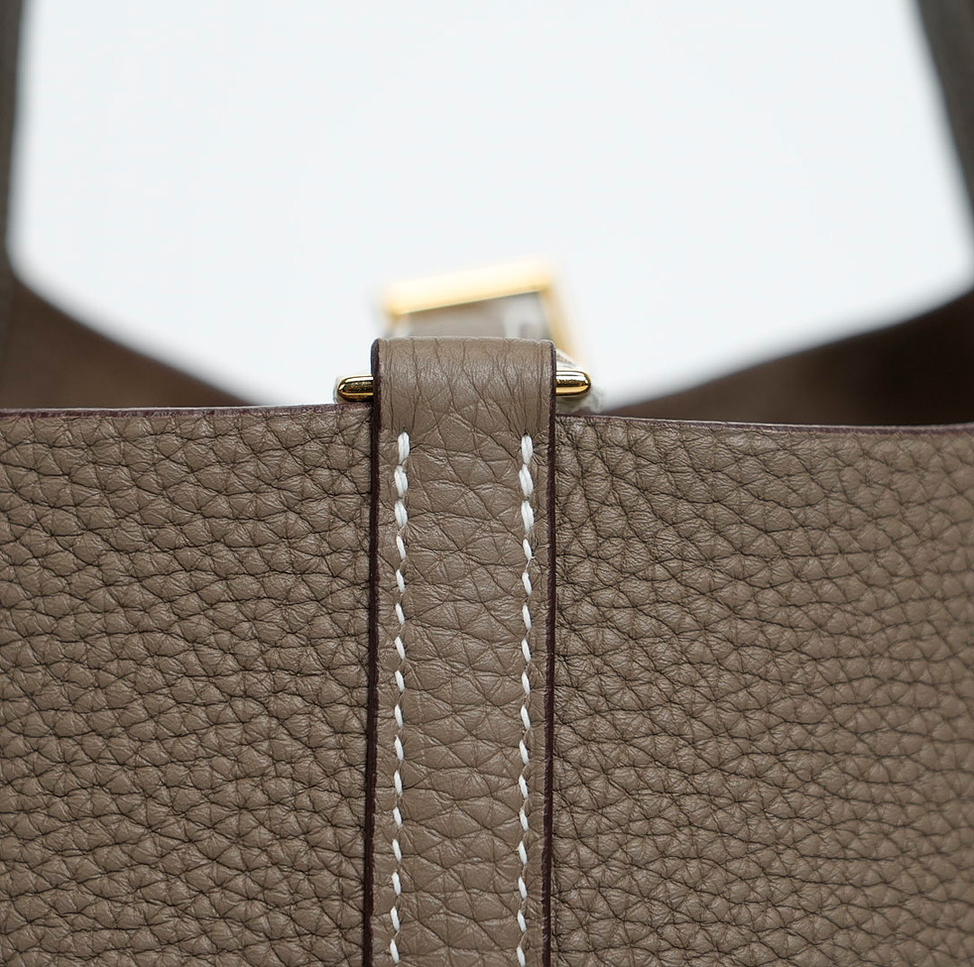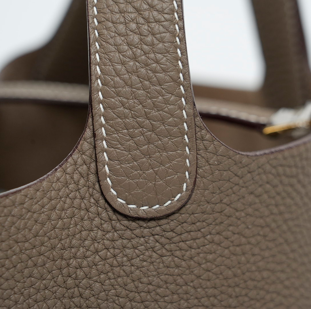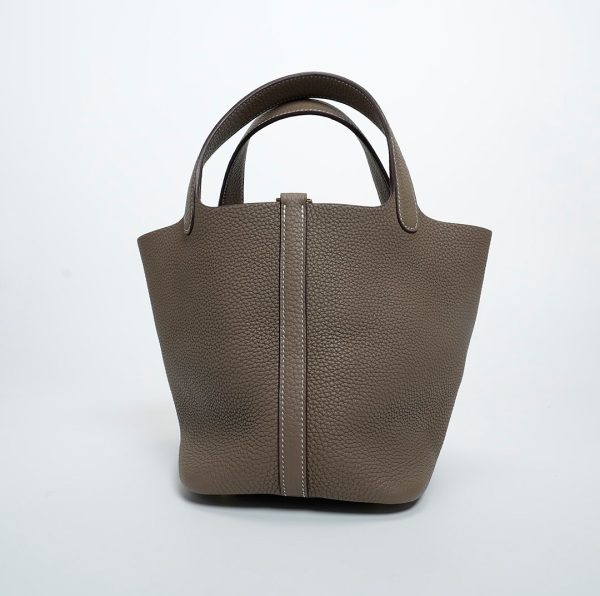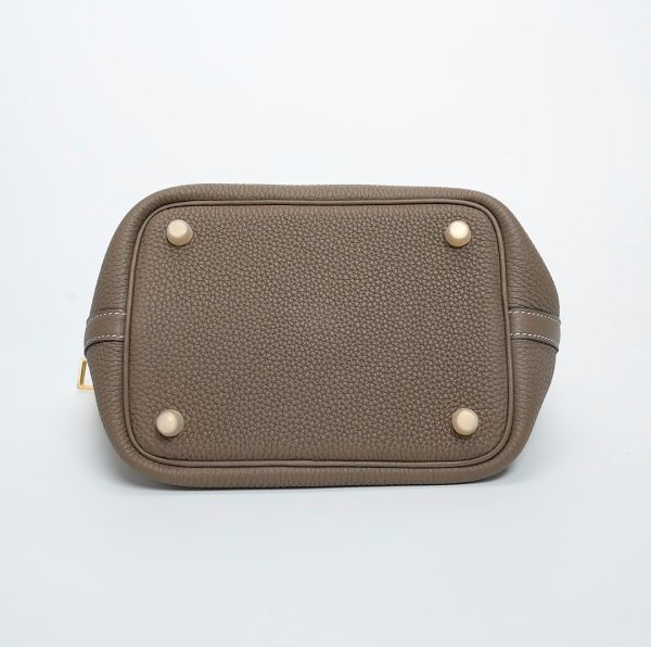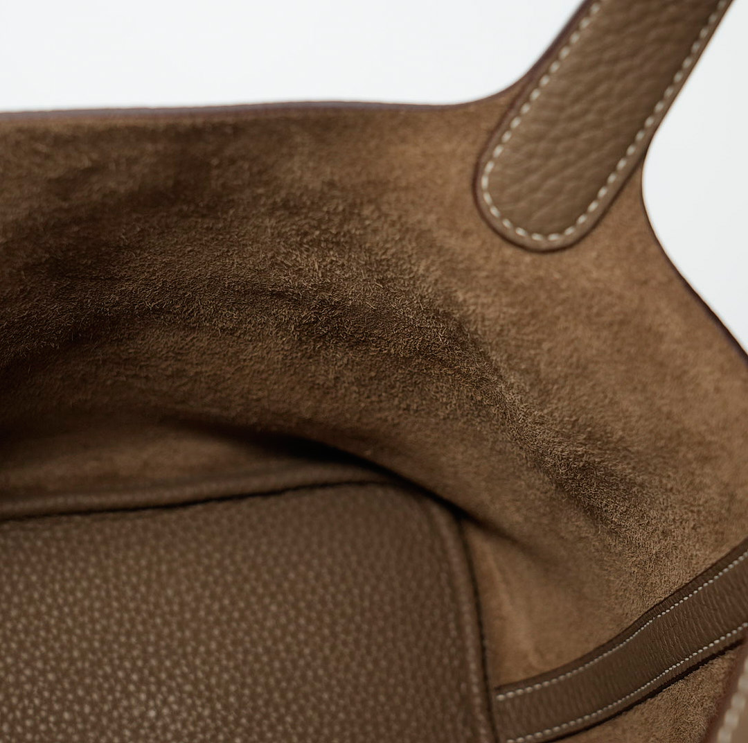 Picotin 18 was handcrafted from fine-grained Taurillon Clemence leather in Etoupe, a versatile grey-brown taupe, and accented with a gold-plated padlock. Its unlined leather and simple, flexible handles make it the ultimate minimalist companion. The top is open to a suede and textured leather interior.