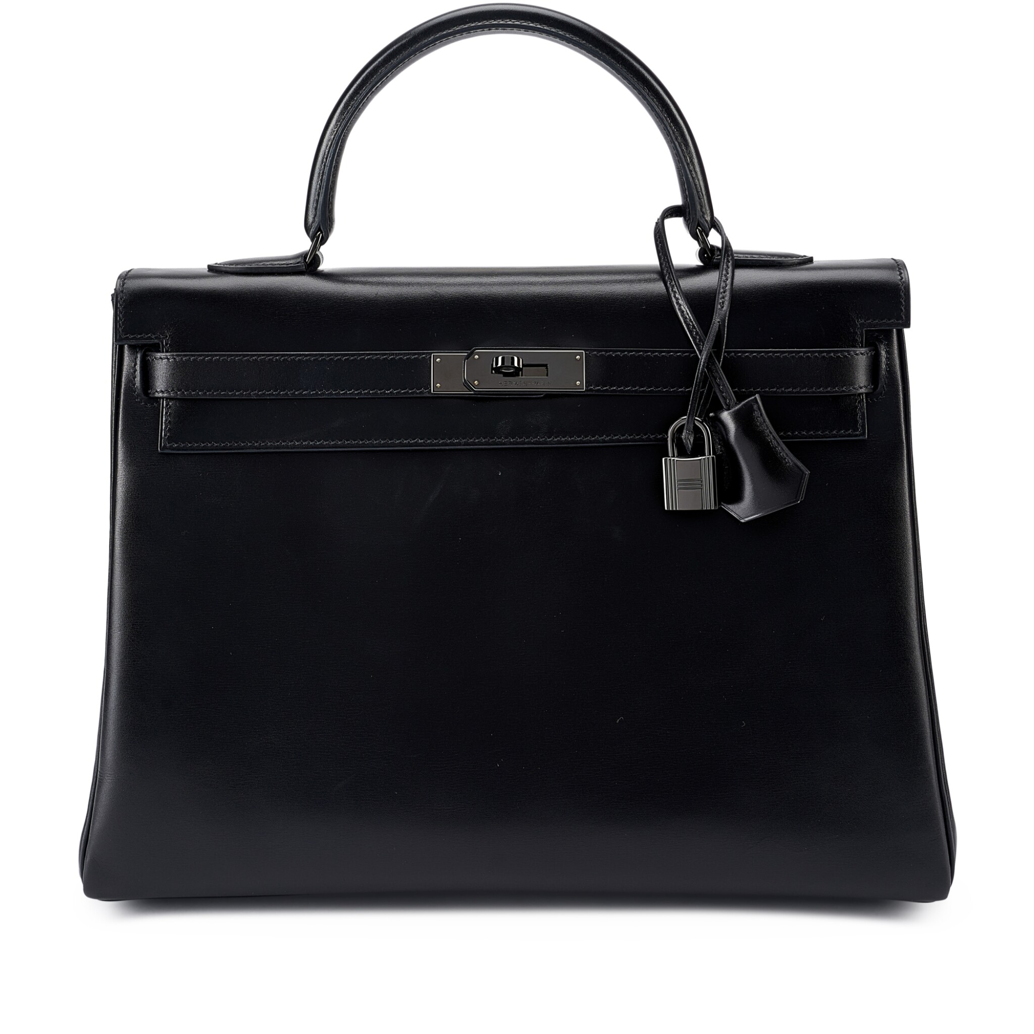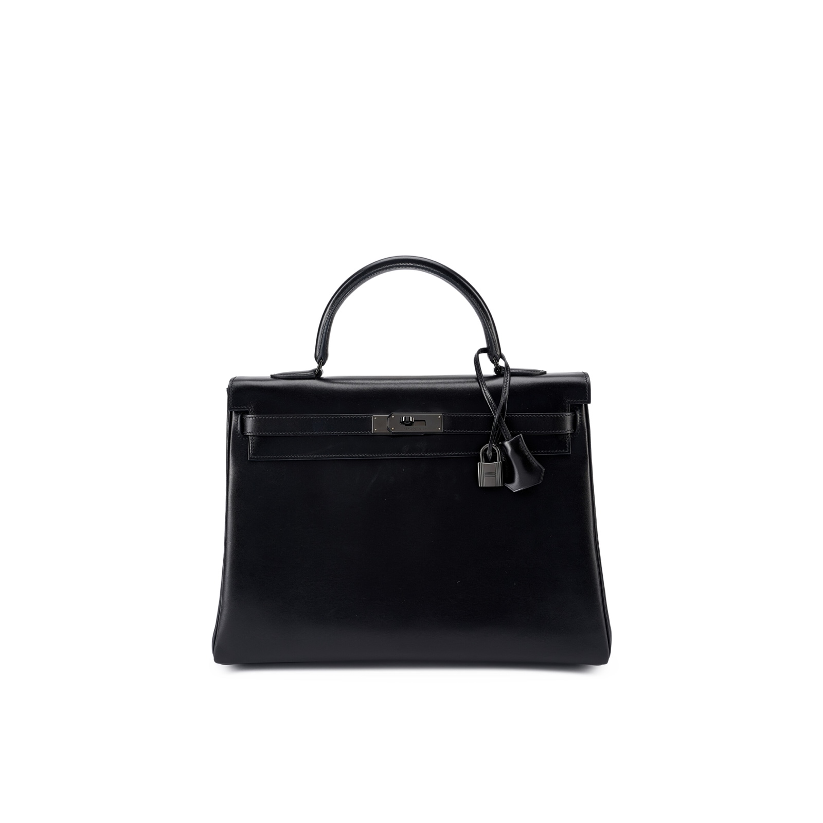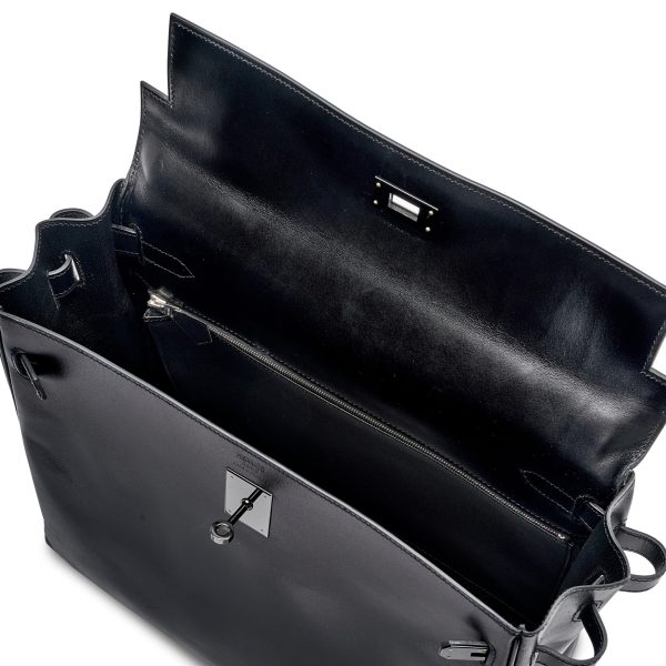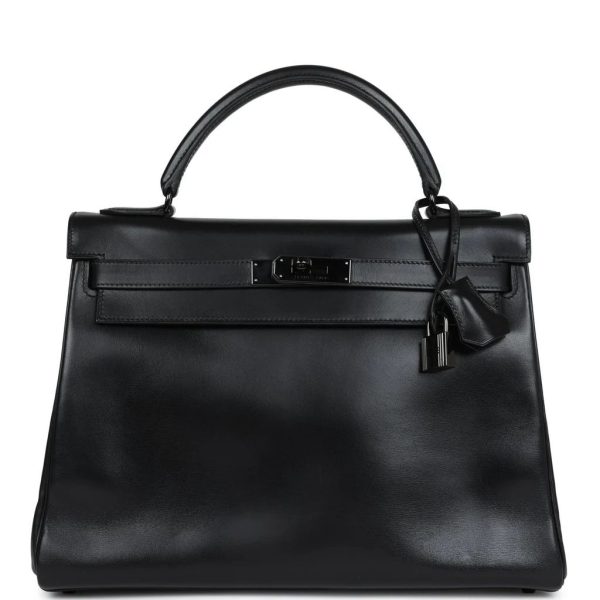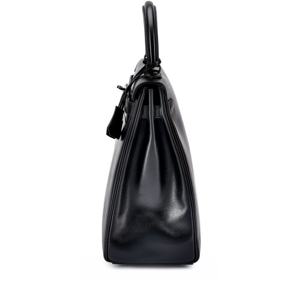 This rare SO BLACK KY 32 is in box leather with PVD black hardware and features tonal stitching, front flap with two straps, front toggle closure shoulder strap, lock, clochette, two keys and single rolled handle.