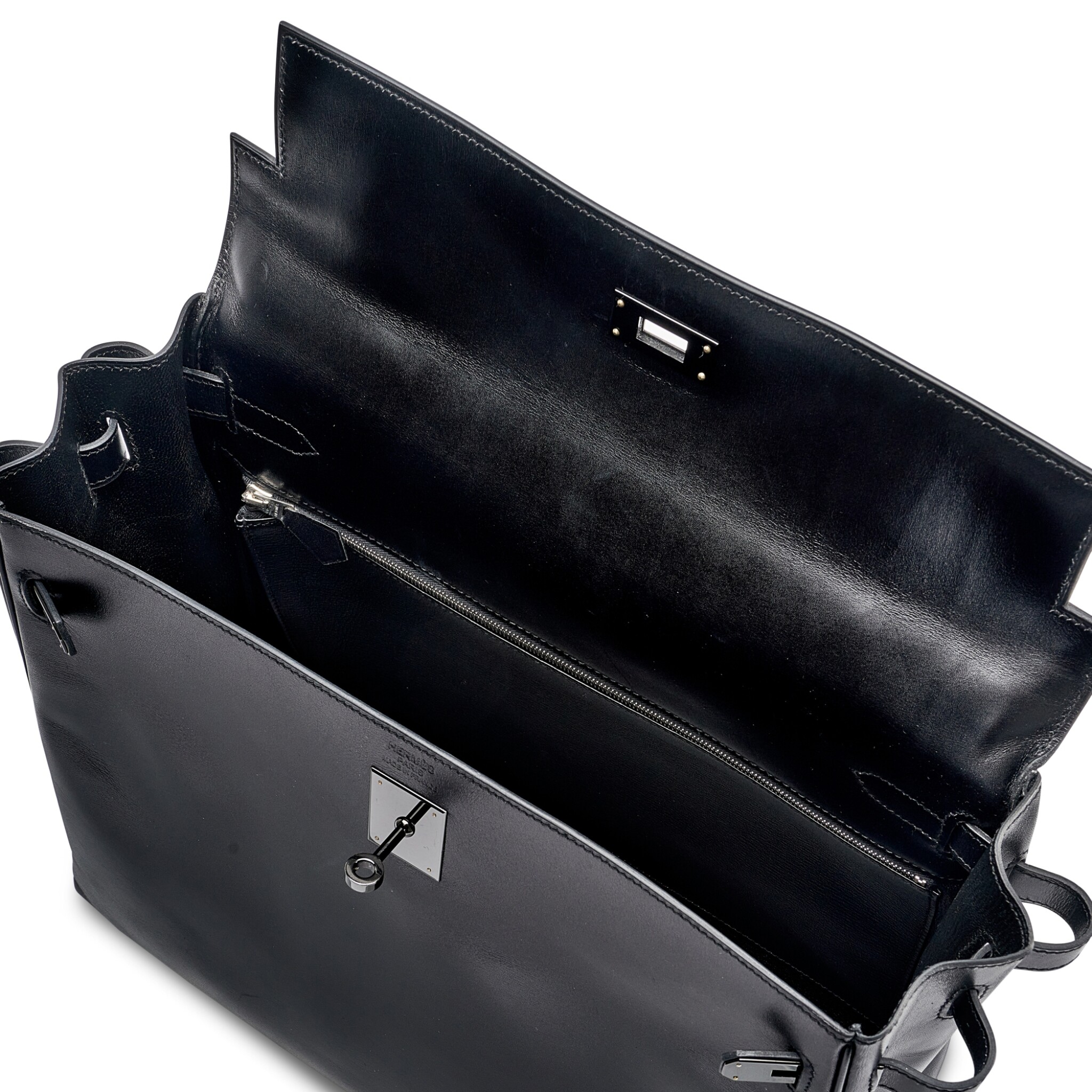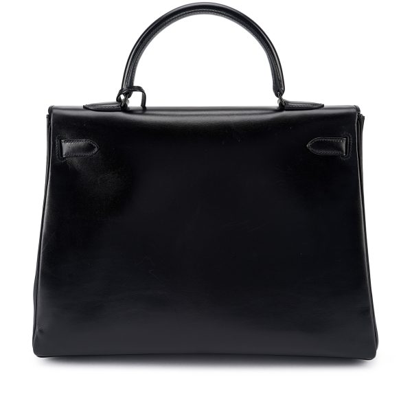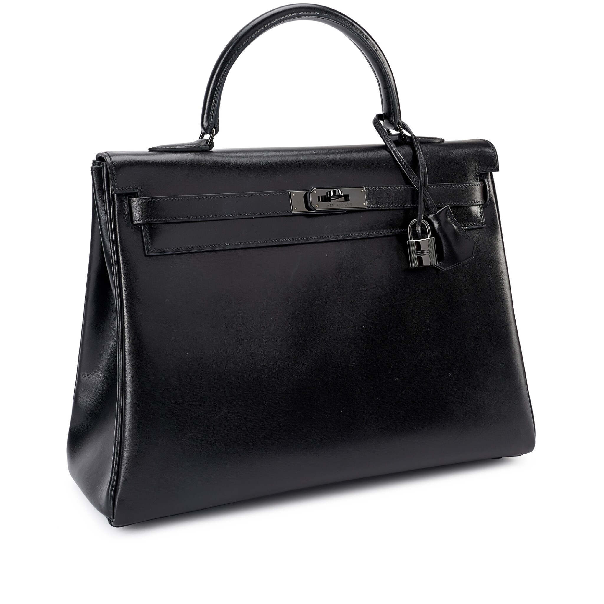 This rare SO BLACK KY 32 is in box leather with PVD black hardware and features tonal stitching, front flap with two straps, front toggle closure shoulder strap, lock, clochette, two keys and single rolled handle.