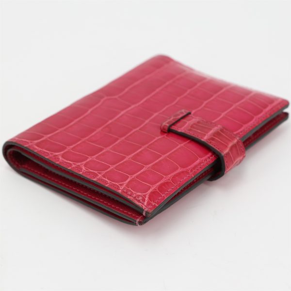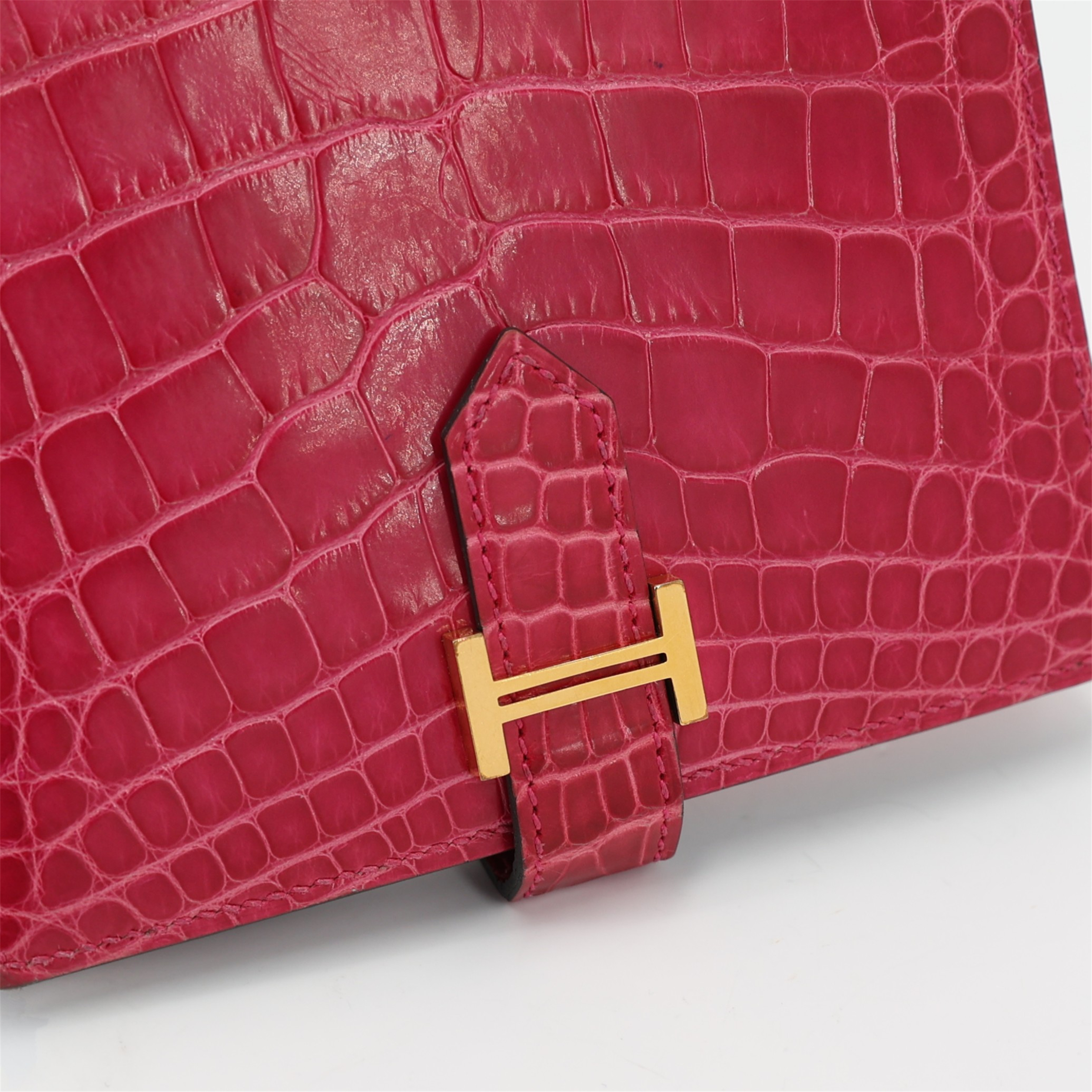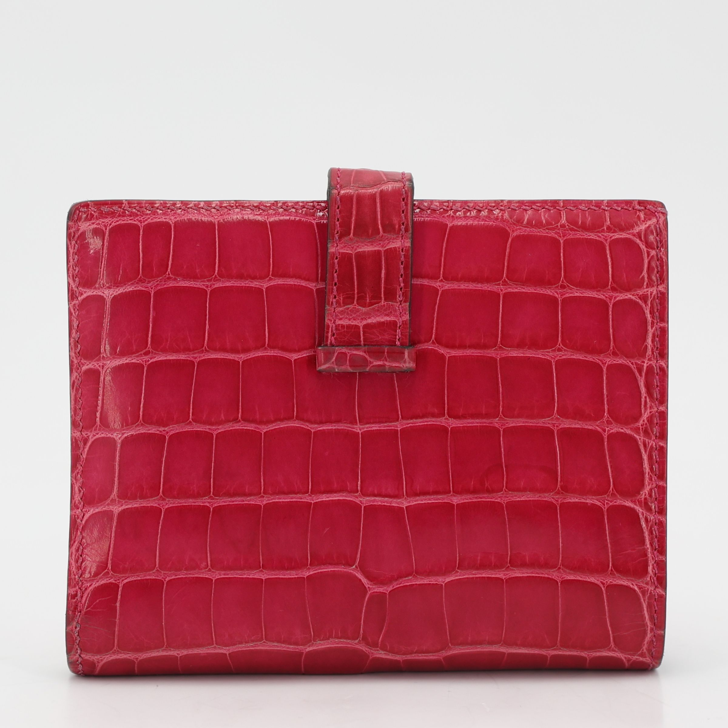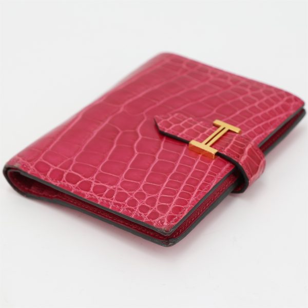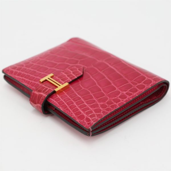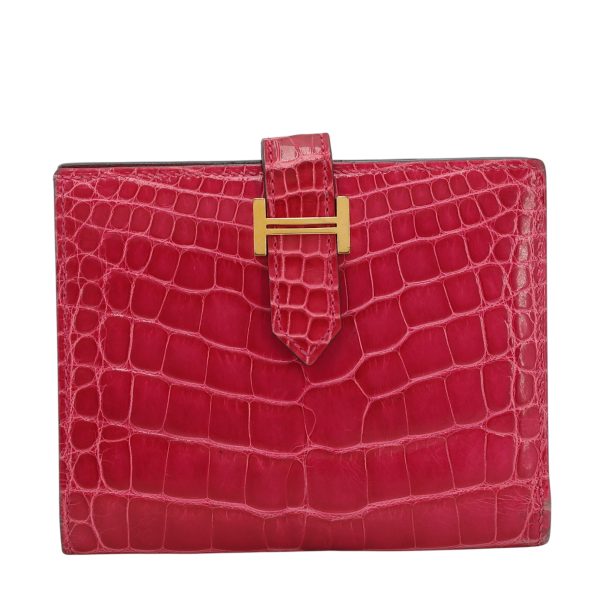 This is an exotic Alligator Bearn Compact Wallet. This chic wallet is crafted of one of the finest textured Alligator leather with a cross-strap and a palladium silver H clasp. The wallet opens to a matching leather interior with a card slot panel, patch pockets, and a zipper compartment.