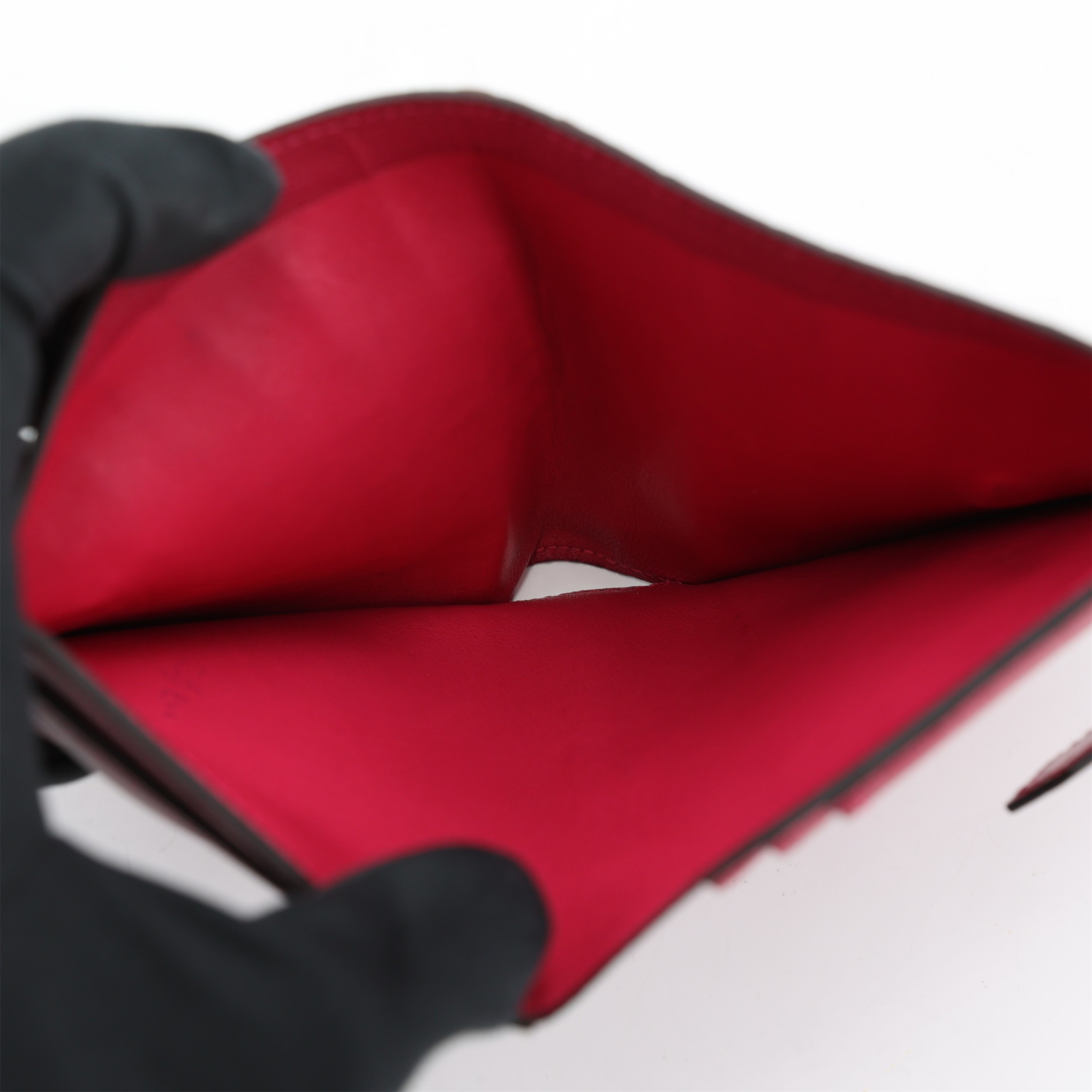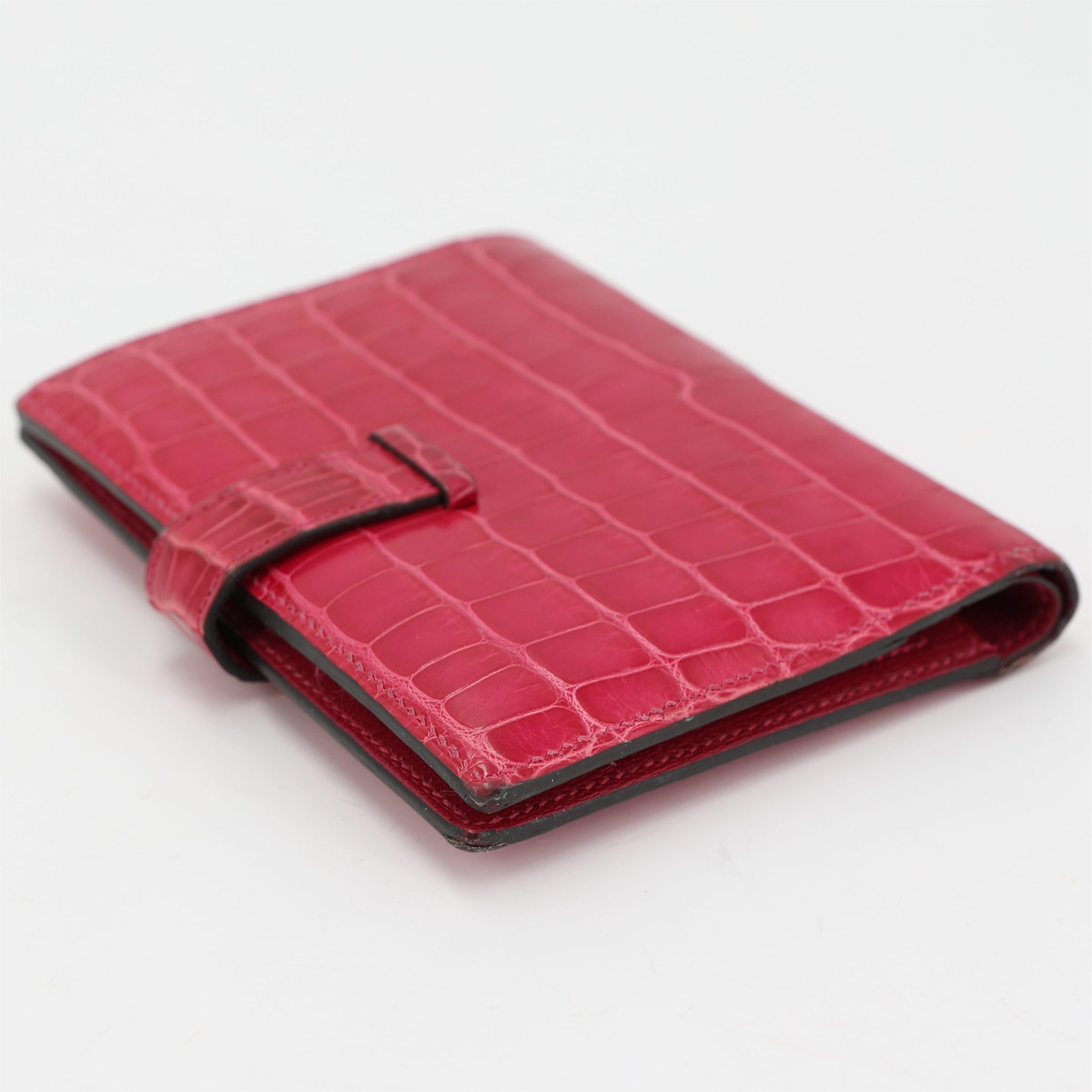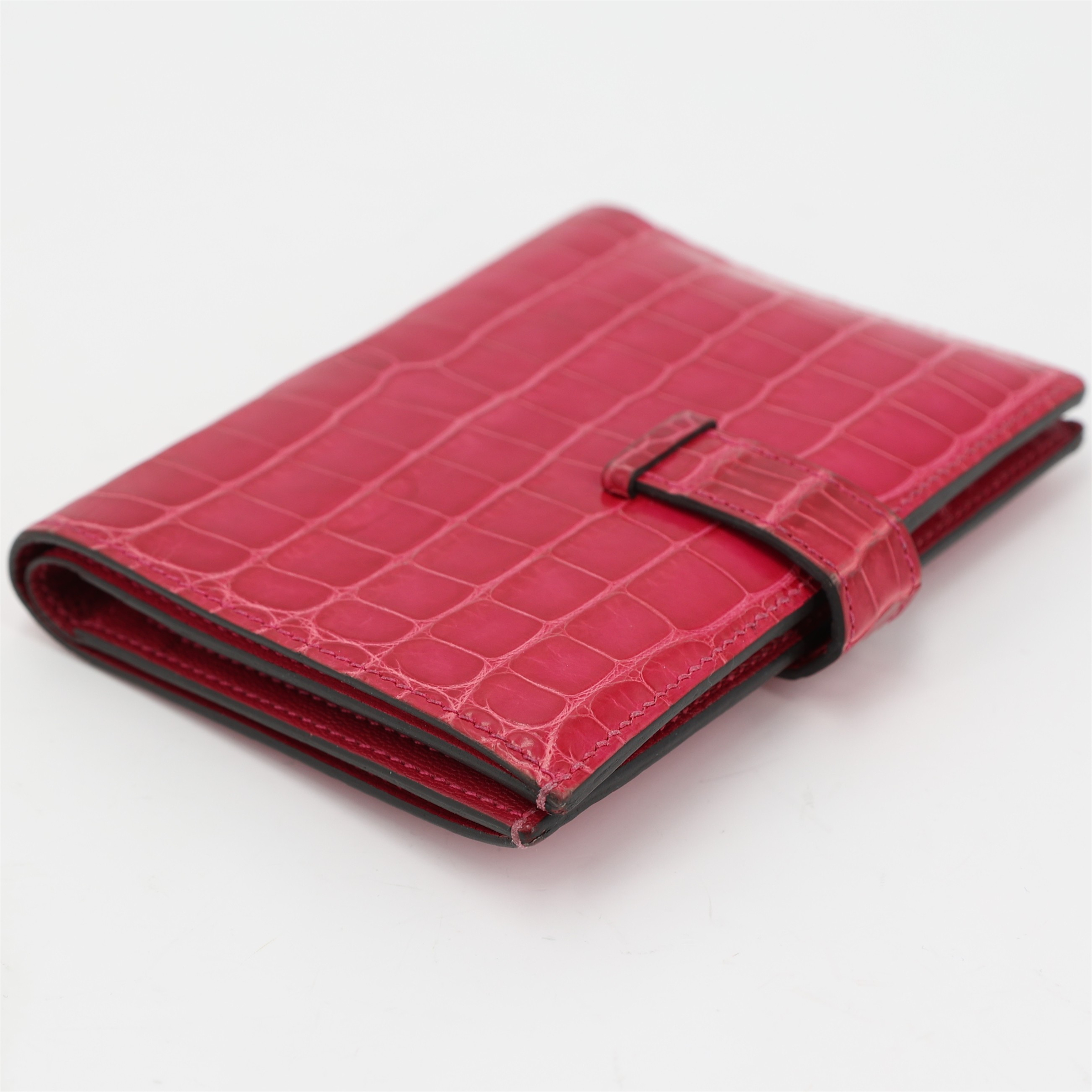 This is an exotic Alligator Bearn Compact Wallet. This chic wallet is crafted of one of the finest textured Alligator leather with a cross-strap and a palladium silver H clasp. The wallet opens to a matching leather interior with a card slot panel, patch pockets, and a zipper compartment.