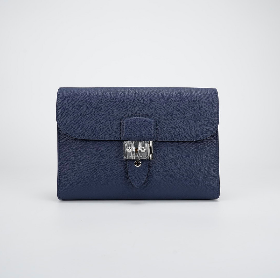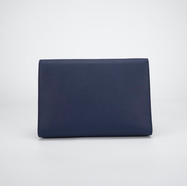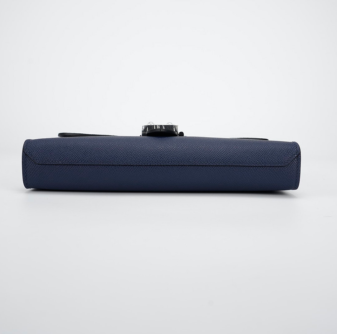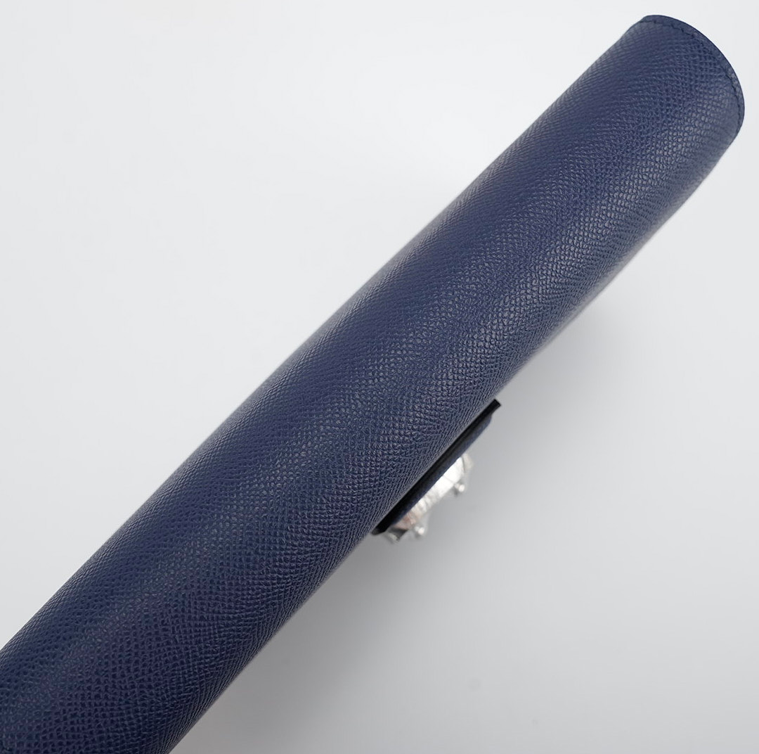 This is a Sac a Dépêches 24 Pouch in Bleu Saphir. This stylish bag is crafted of textured Epsom leather in Navy Bleu. The messenger features a strap and palladium turn-lock closure. This opens to a matching leather interior with a pocket.