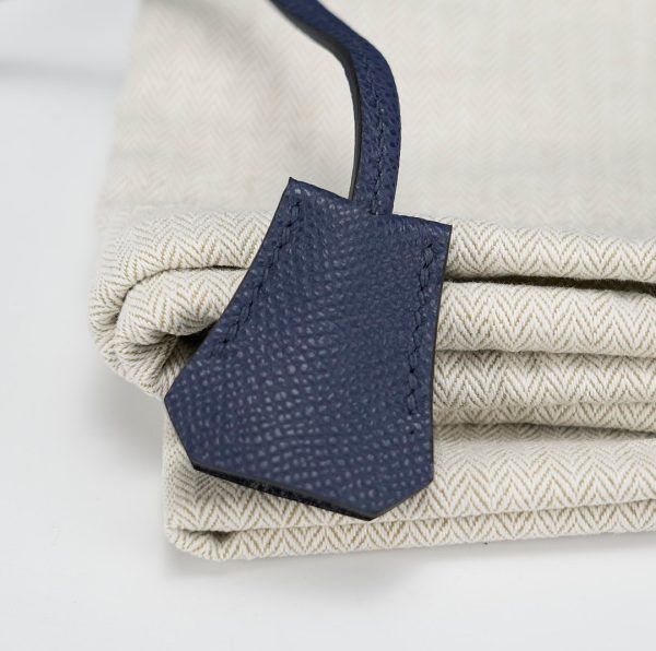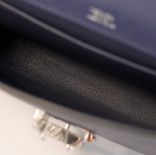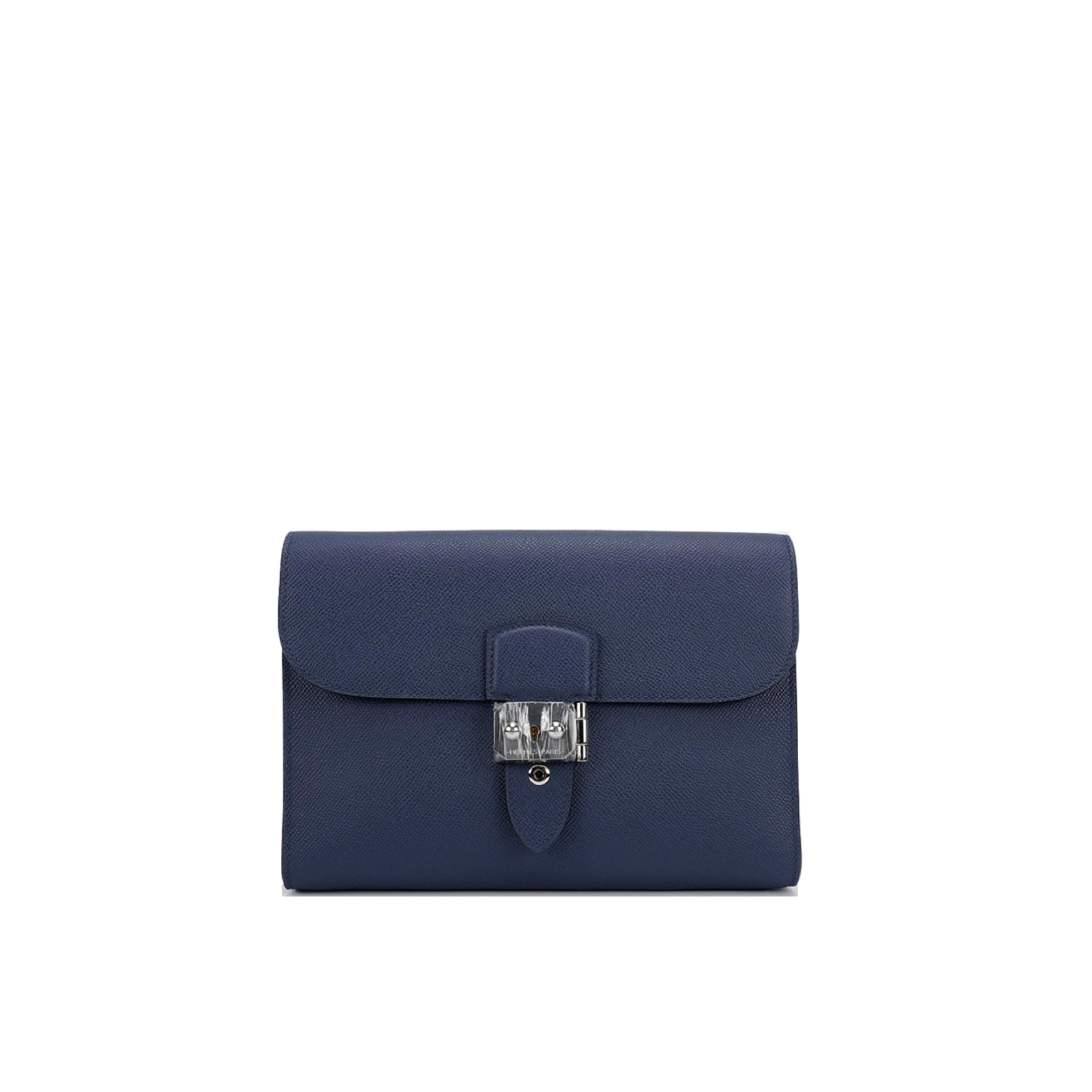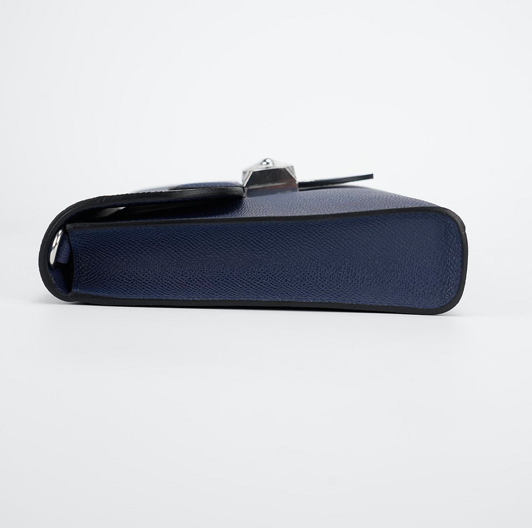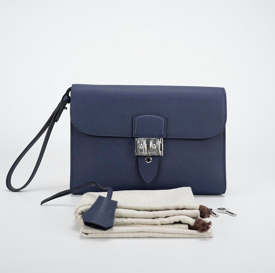 This is a Sac a Dépêches 24 Pouch in Bleu Saphir. This stylish bag is crafted of textured Epsom leather in Navy Bleu. The messenger features a strap and palladium turn-lock closure. This opens to a matching leather interior with a pocket.