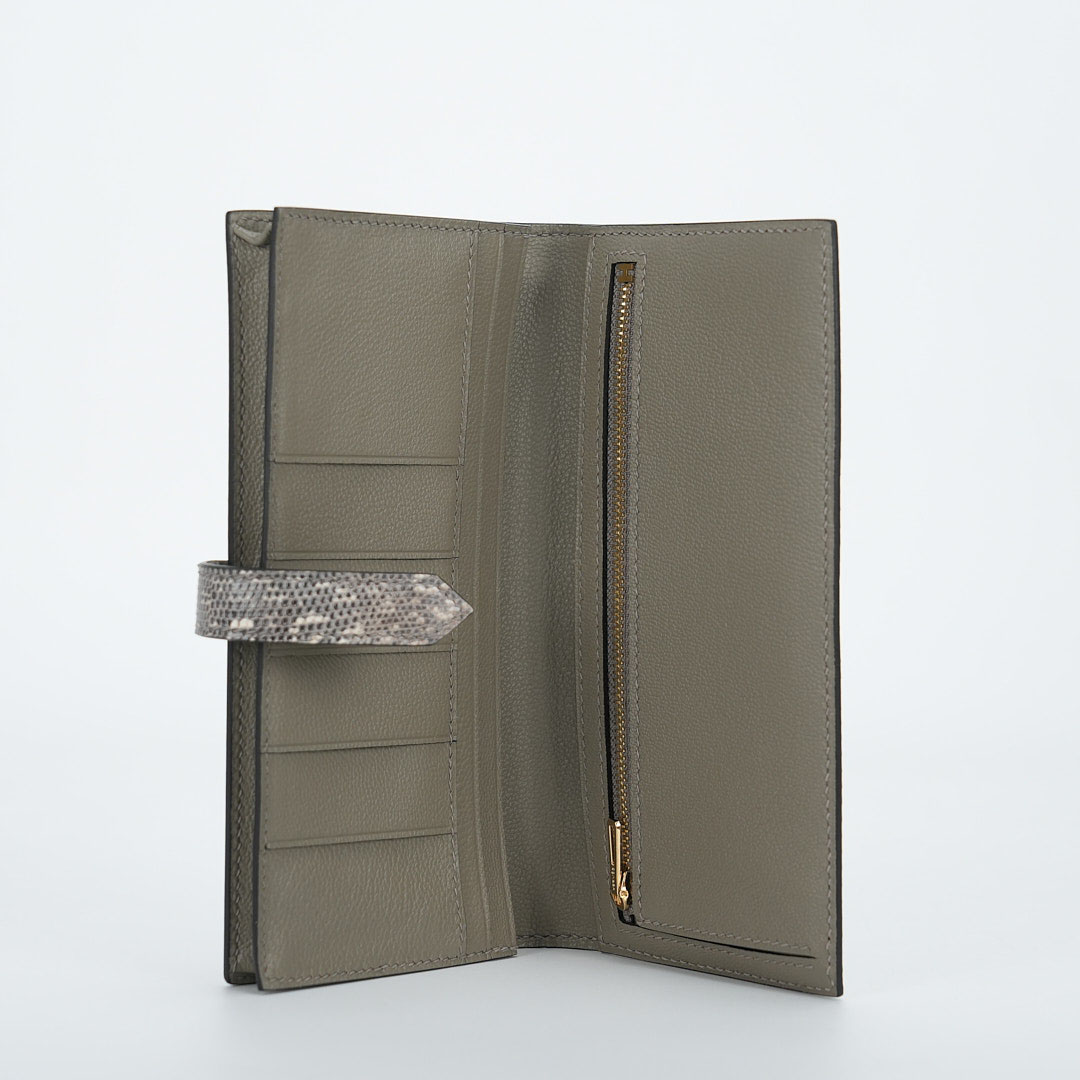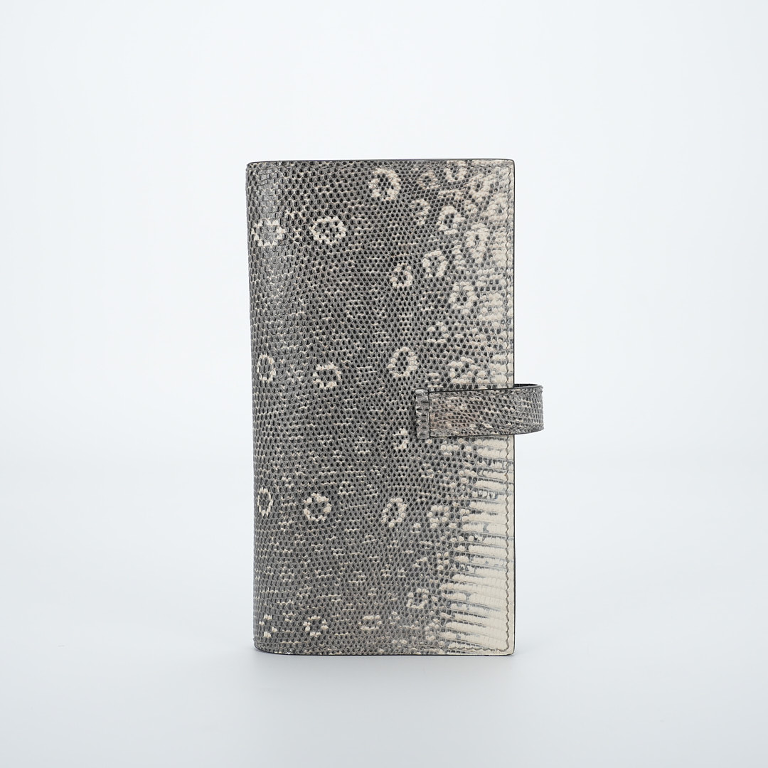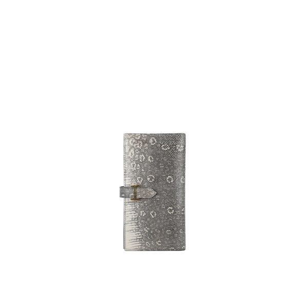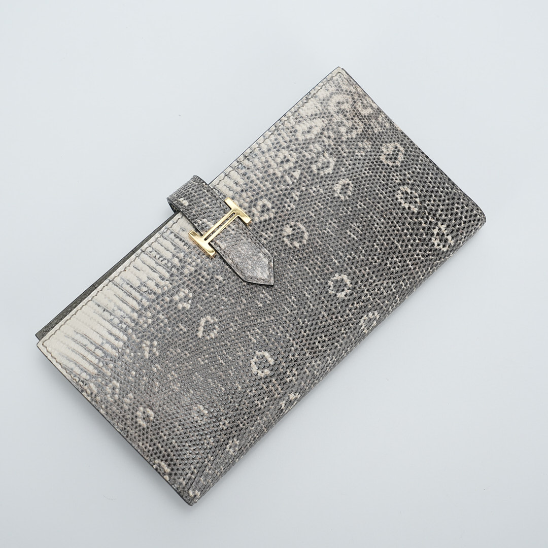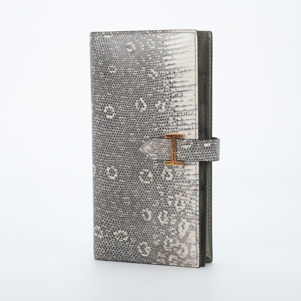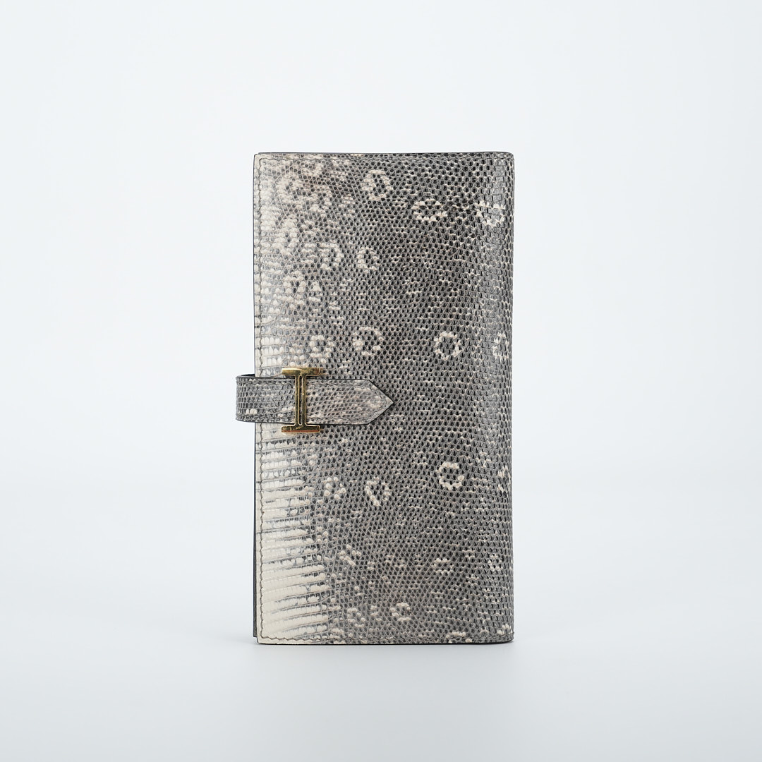 This is a Long Bearn Souffle Wallet. This chic wallet is crafted of exotic textured Lizard leather with a cross-strap and a gold H clasp. The wallet opens to a matching leather interior with a card slot panel, patch pockets, and a zipper compartment.