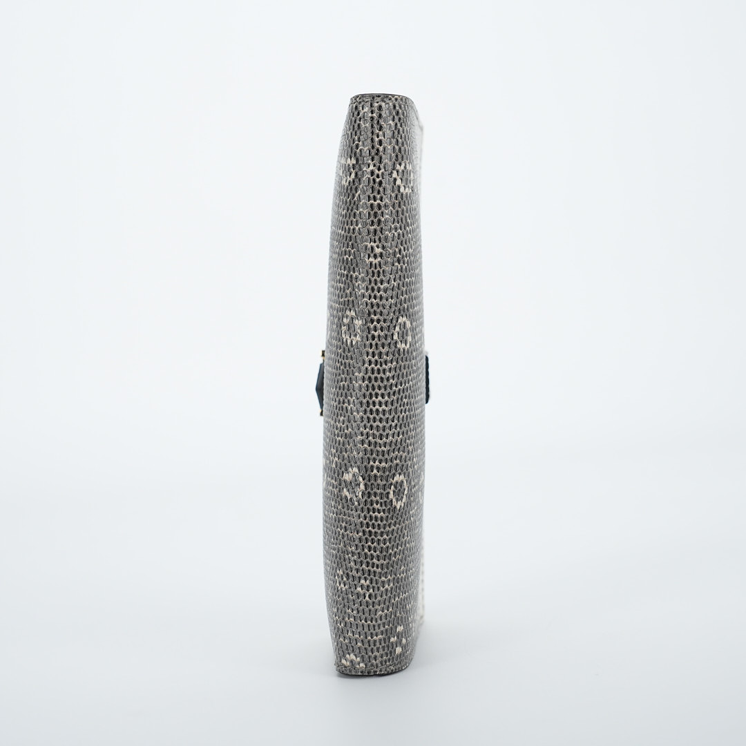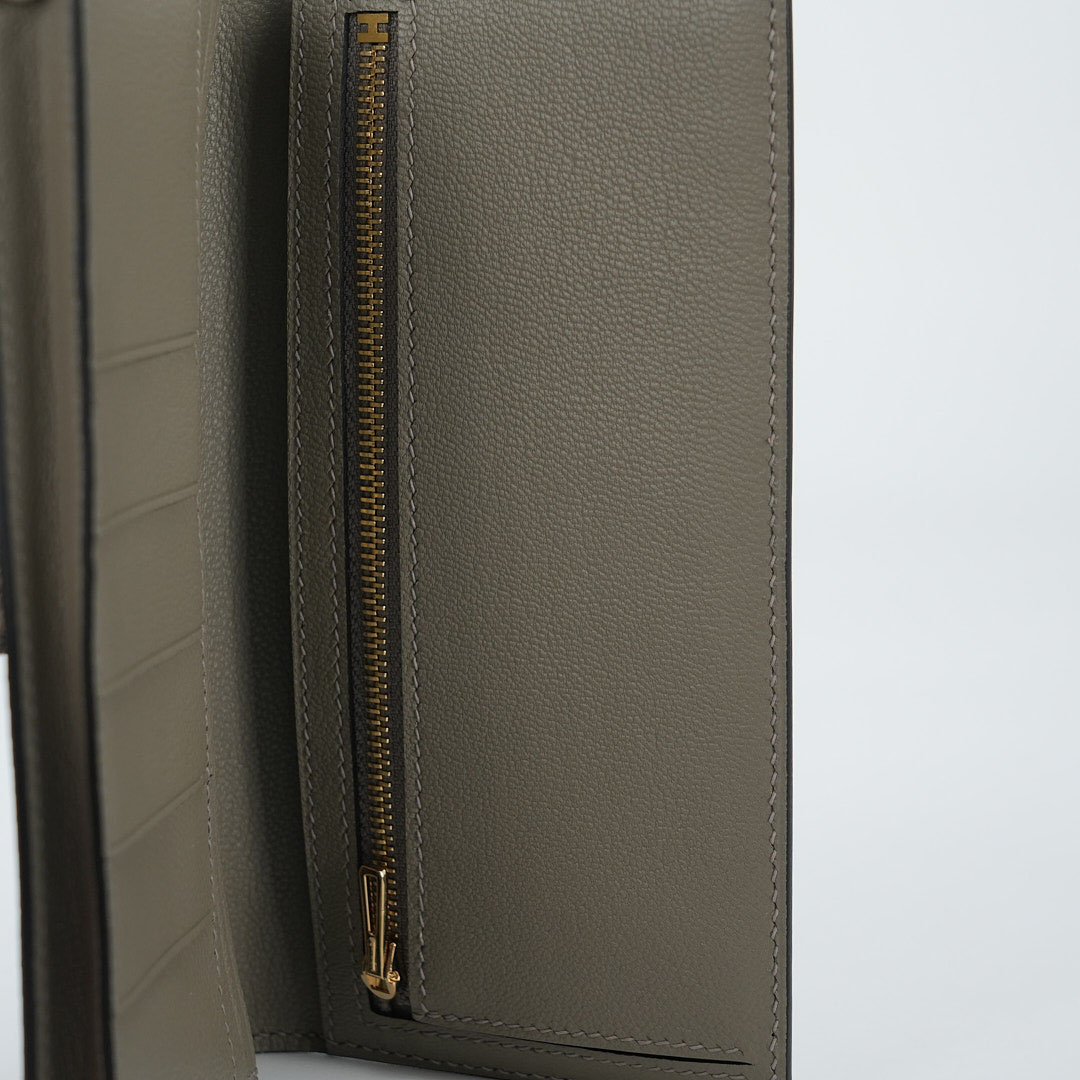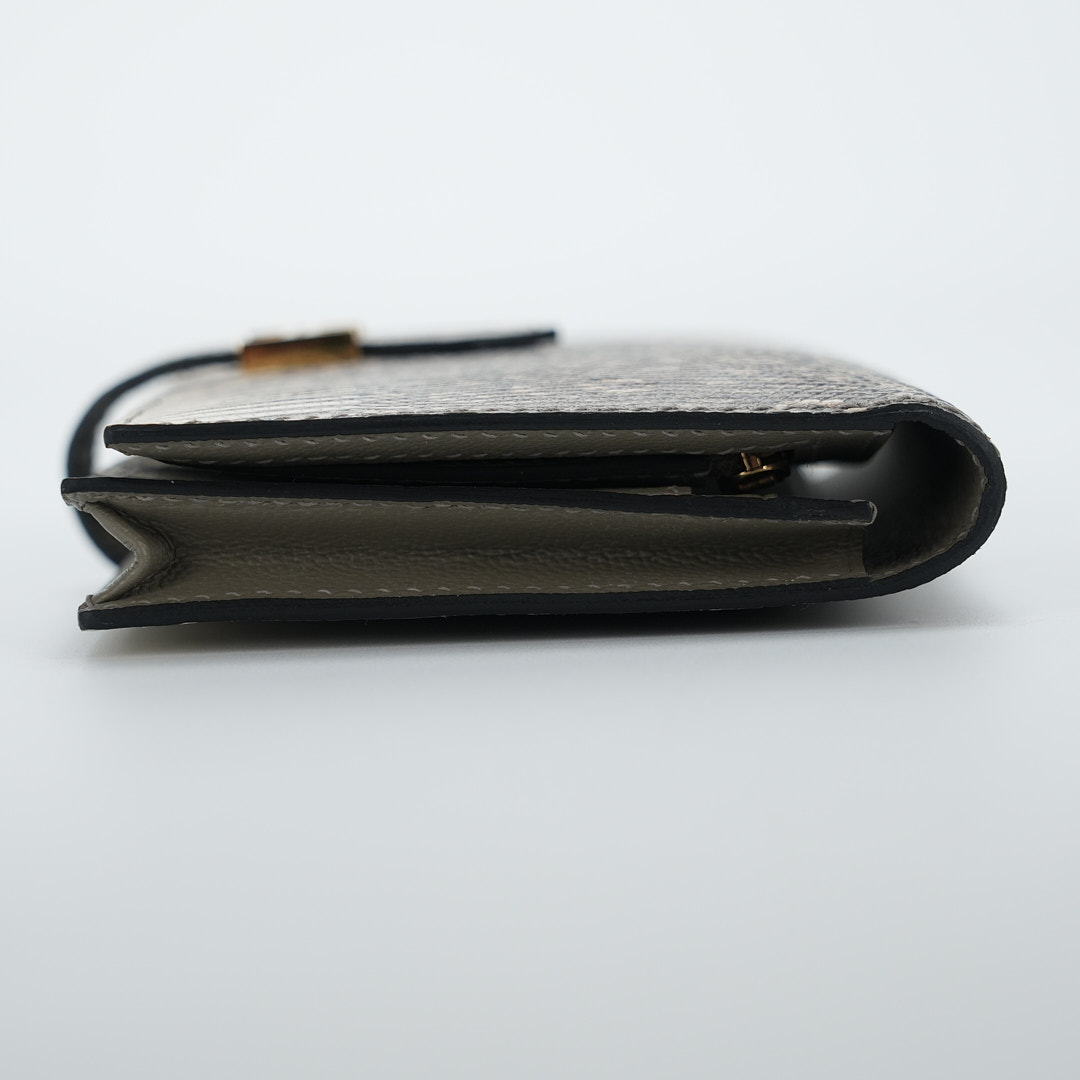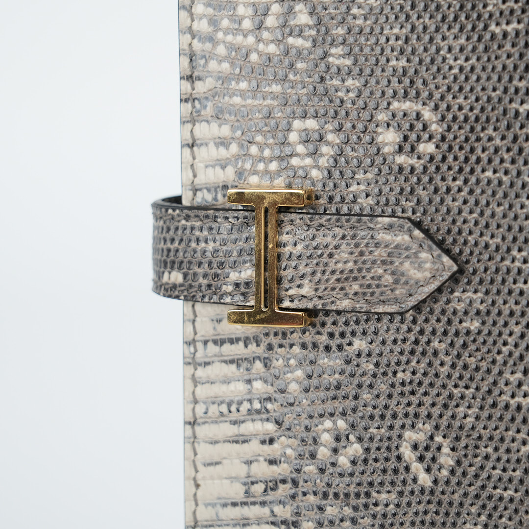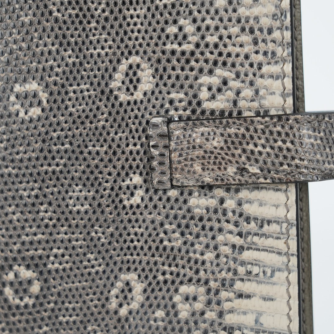 This is a Long Bearn Souffle Wallet. This chic wallet is crafted of exotic textured Lizard leather with a cross-strap and a gold H clasp. The wallet opens to a matching leather interior with a card slot panel, patch pockets, and a zipper compartment.
