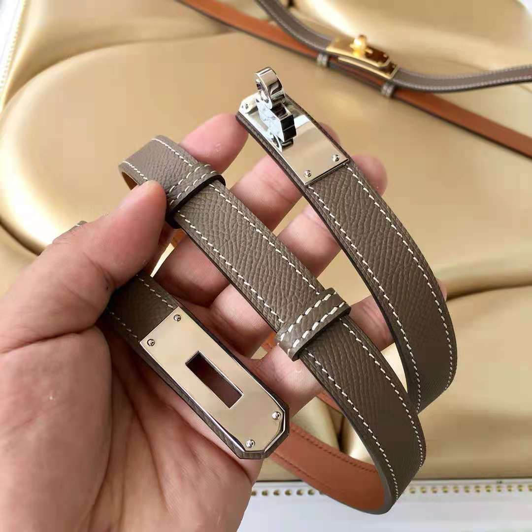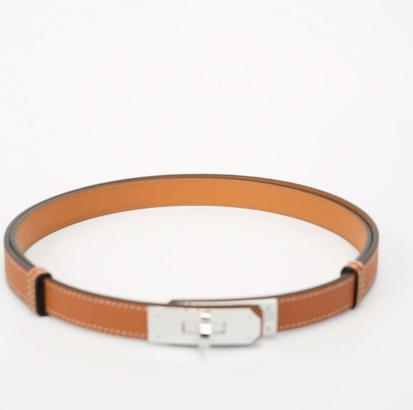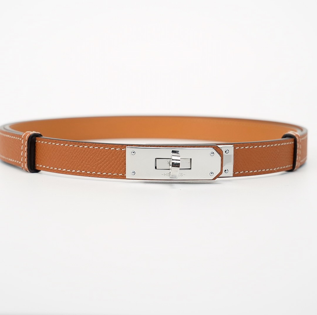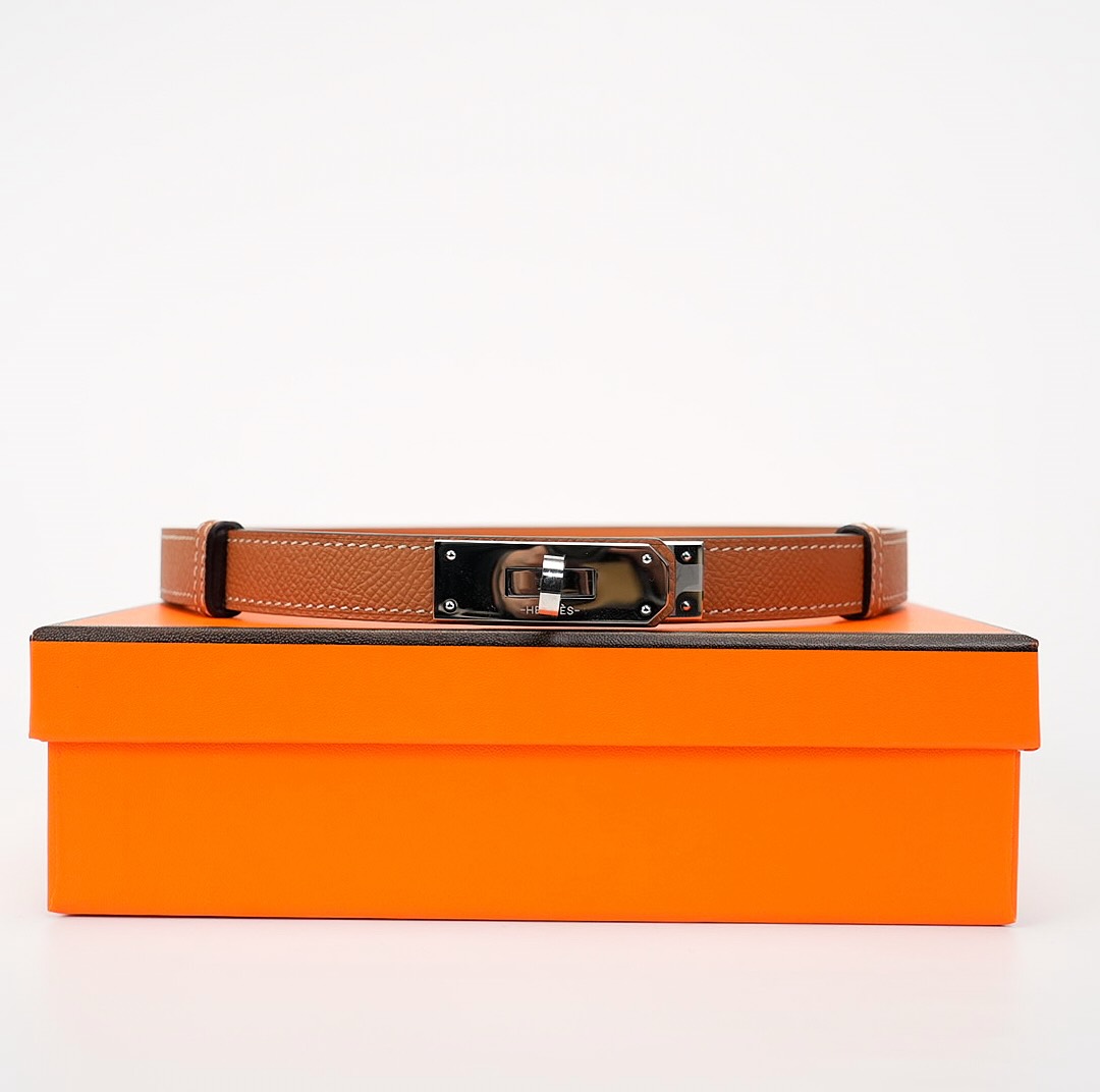 Belt in Epsom calfskin, adorned with the legendary Kelly buckle in palladium metal. Thanks to a clever set of slides, this model with an adjustable waist can be worn at the waist or on the hip. Adjustable size from 60 cm to 110 cm.