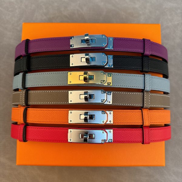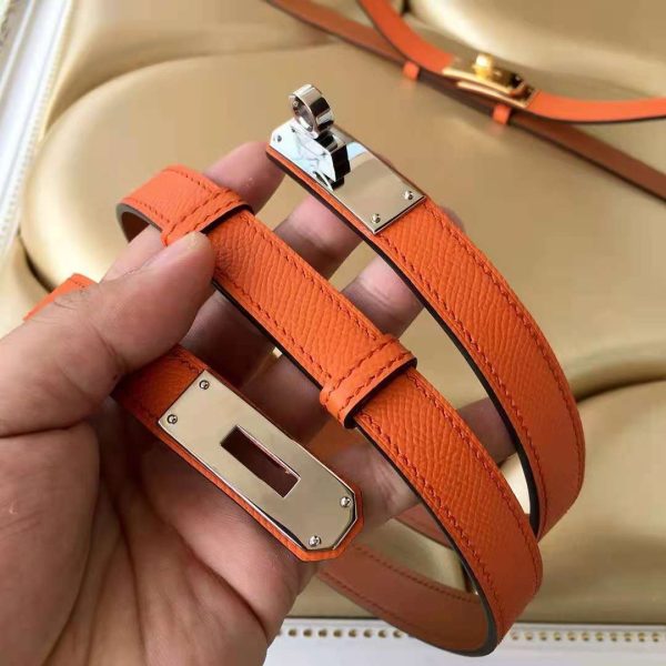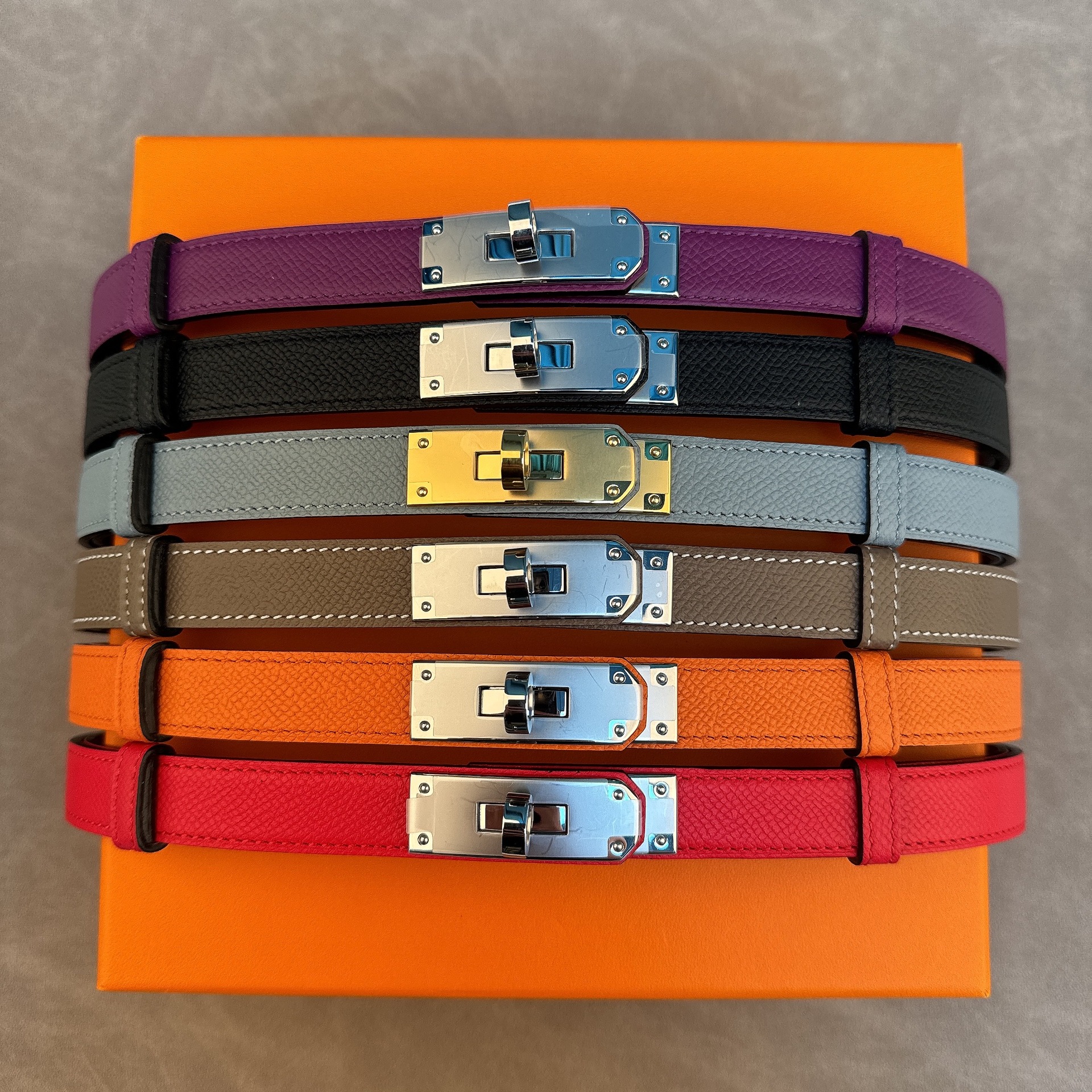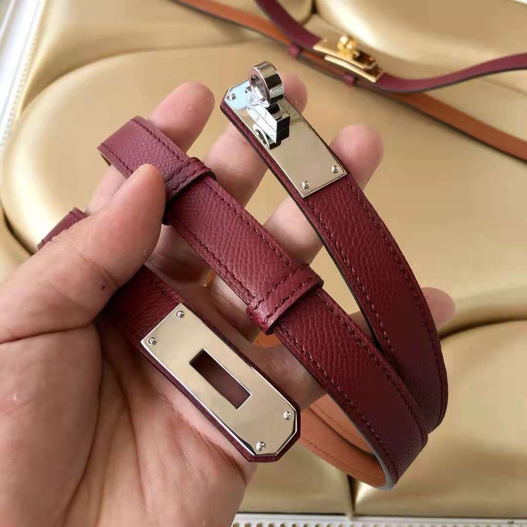 Belt in Epsom calfskin, adorned with the legendary Kelly buckle in palladium metal. Thanks to a clever set of slides, this model with an adjustable waist can be worn at the waist or on the hip. Adjustable size from 60 cm to 110 cm.