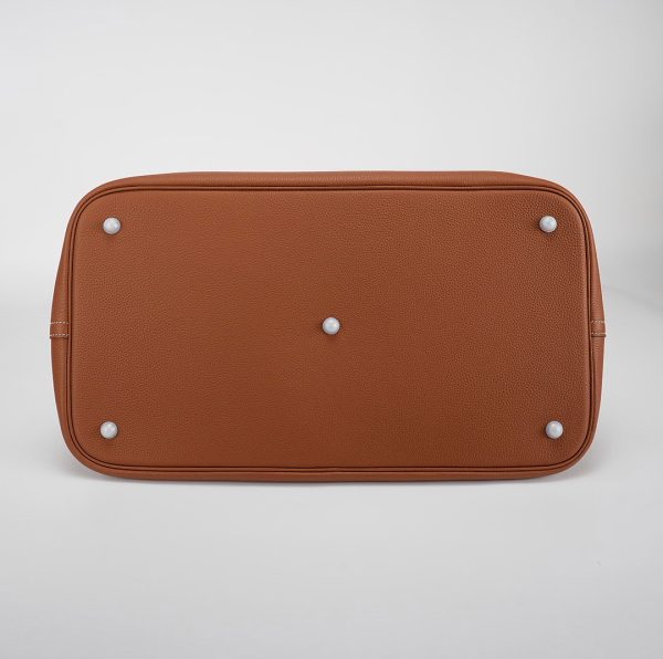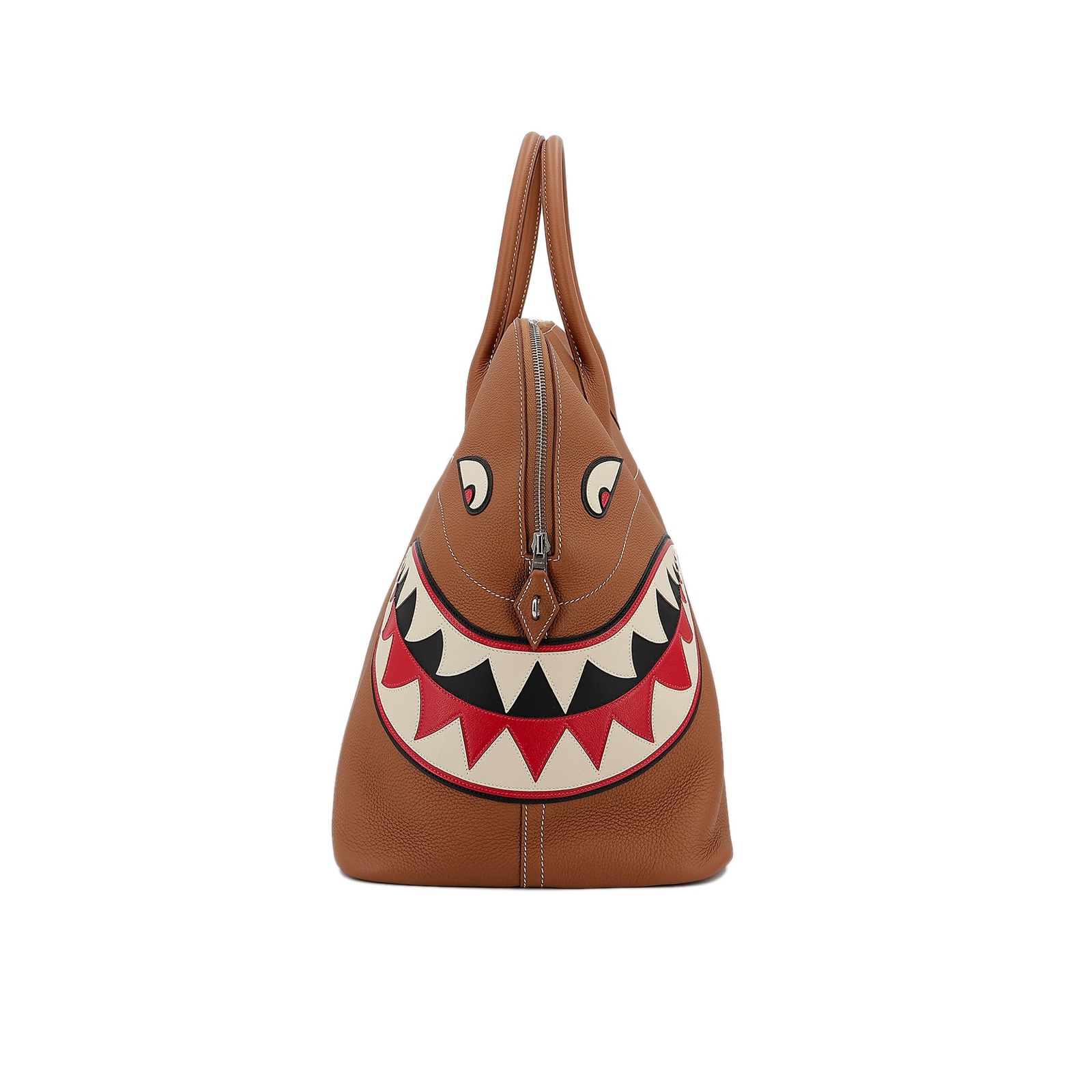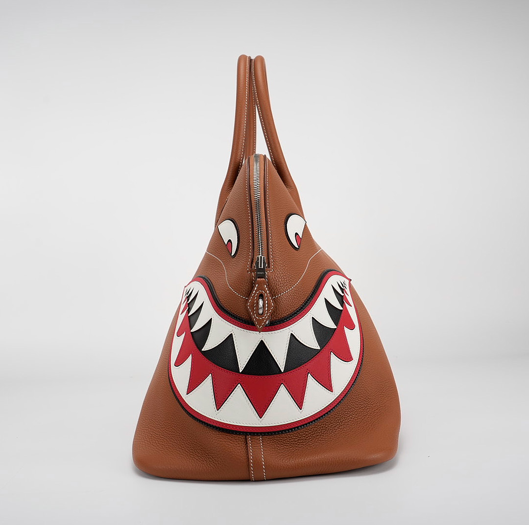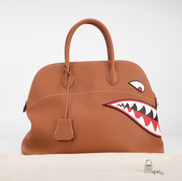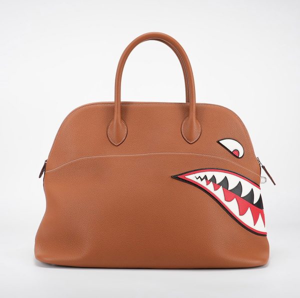 Togo Shark Bolide 45 in Gold. This stylish tote is crafted of lovely soft pebbled togo leather in Gold with an intimidating shark face off to the side. The bag features rolled leather top handles, a cadena palladium lock, palladium hardware, and a hanging clochette with keys. The top zipper opens to a spacious herringbone fabric and leather interior making this an ideal for a weekender bag
