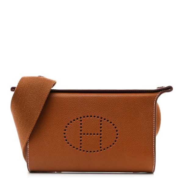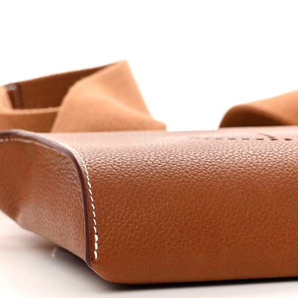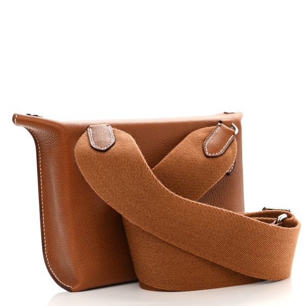 This is a Togo Videpoches in Gold. This is a small messenger style bag that is finely crafted of leather in gold. This bag features a matching canvas shoulder strap with palladium hardware. The fold over top flap opens to a matching leather interior with a flat pocket.